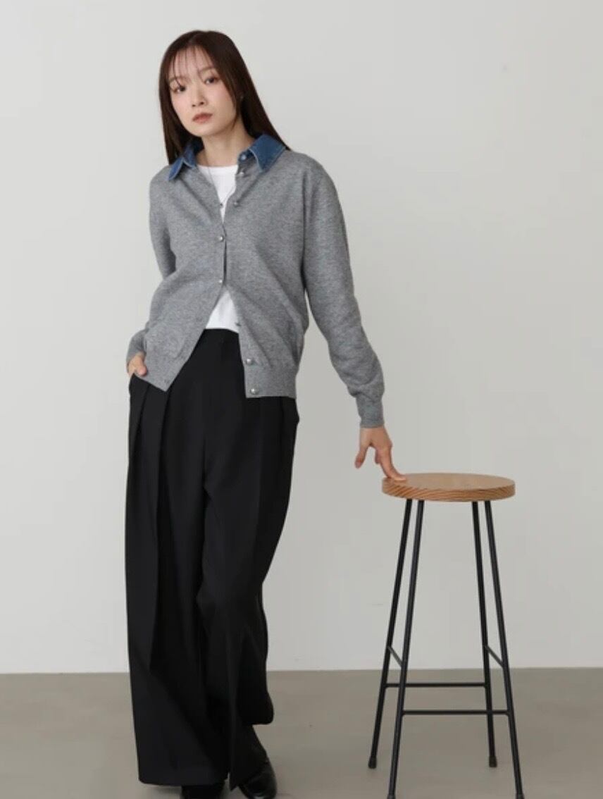 デニム衿をポイントにした、旬のムード漂うドッキングデザインのニットカーディガン。衿のカジュアルさと、シルバーボタンの上品さが絶妙に調和し、1枚できれいめカジュアルが完成します。もちもちとした柔らかなニットが、着心地のよさと女性らしい雰囲気を両立。シンプルなシルエットながら、衿の存在感がスタイリングをぐっとこなれた印象に見せてくれる主役級アイテムです。アイボリー・グレー・ネイビーの3色展開で、どれもコーデに取り入れやすい落ち着いたカラーになっています。