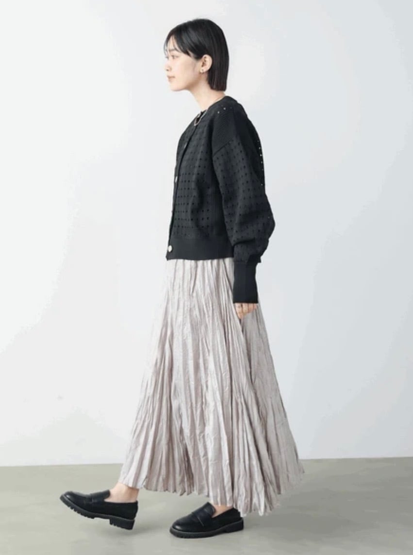 ニットやカーディガンと合わせてきれいめに。スウェットやフラットシューズでカジュアルダウンもおすすめです。
