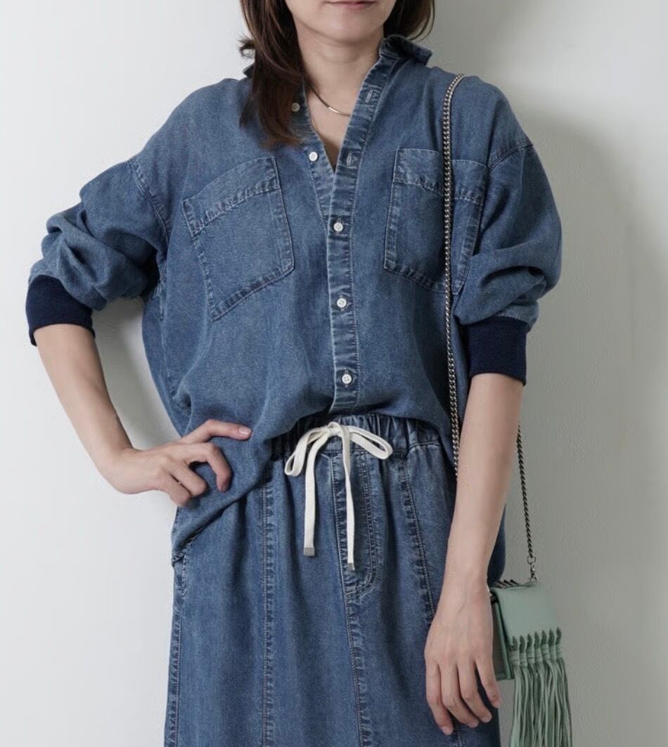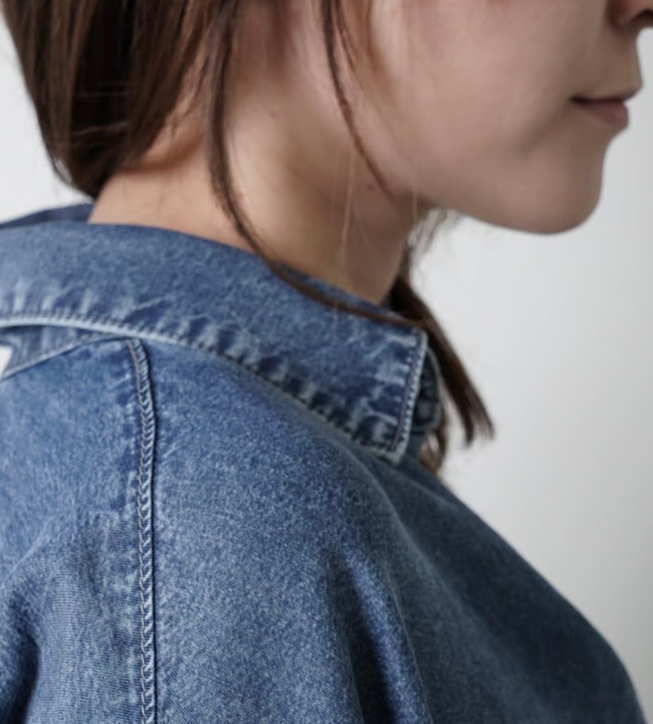 硬さがなく、ドレープ性に富んだテンセルデニムのバックシャンシャツ。フロントはシンプルながら、特徴的なバックシャンデザインが特徴的。たくし上げやすい袖口のインディゴリブ、シャツイン見えが簡単に作れる釦の後ろのスナップ釦などギミック満載のシャツです。
