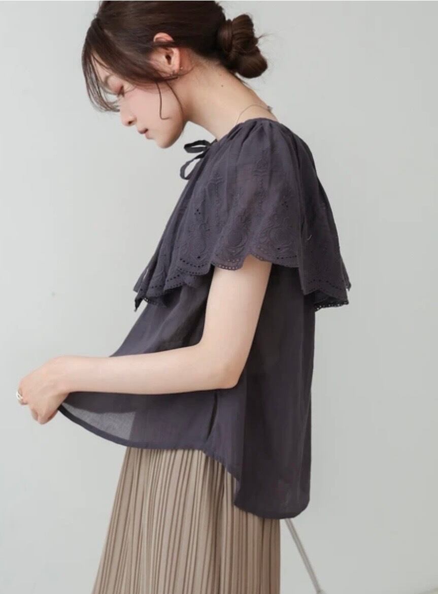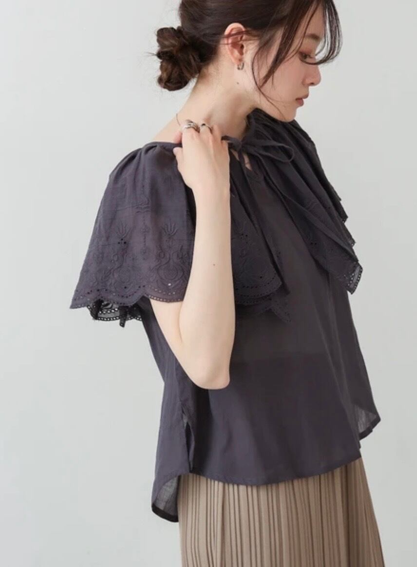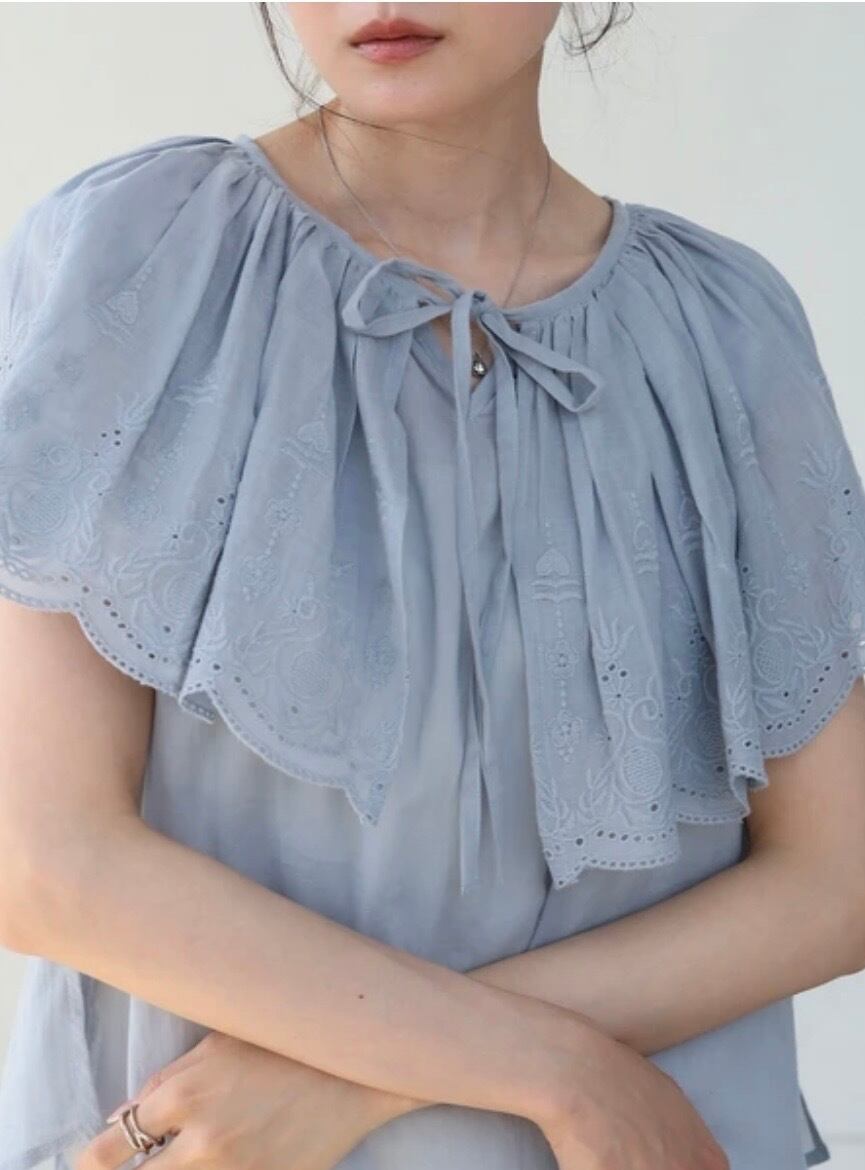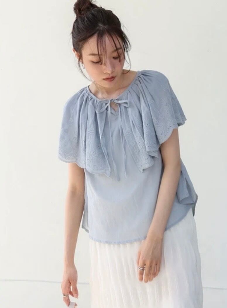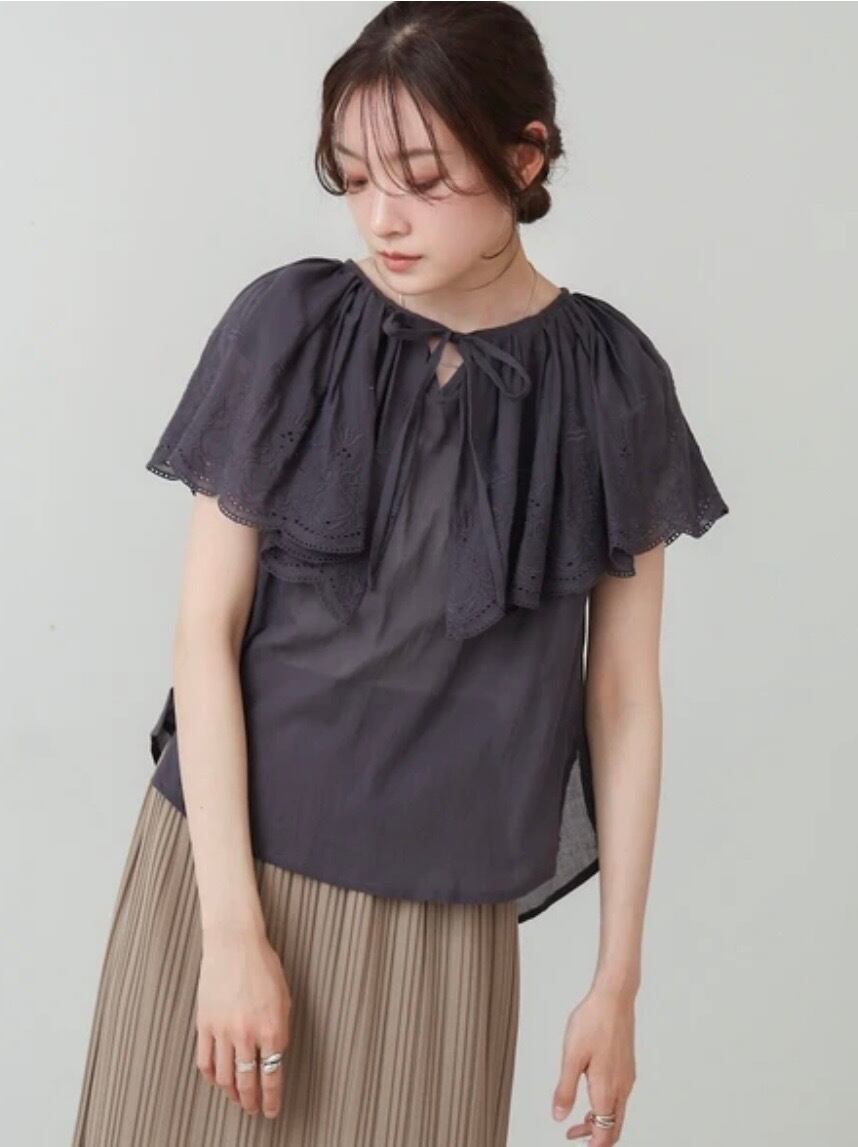 ふんわりとした質感が特徴のコットンボイル生地のブラウスが登場!肩から胸元にかけてフリルケープ風デザインになっており、顔周りに華やかさと立体感をプラス。ボリューム感があるため華奢みえ効果も◎レースの透け感がナチュラルでありながら大人の上品さを演出。フリル部分にはパンチングレースが施されており、繊細でフェミニンな印象を出してくれます。