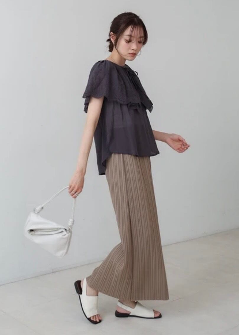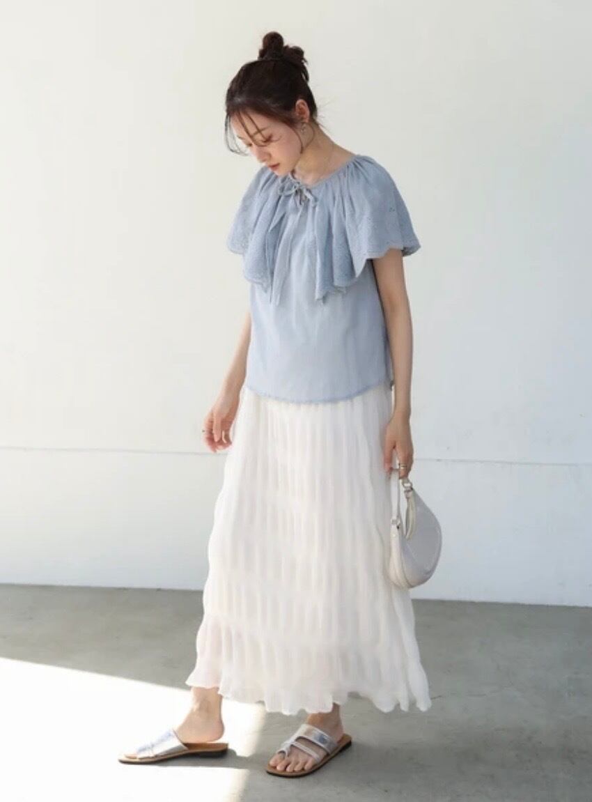 ふんわりとした胸元のフリルデザインと、身頃もタックの入ったシルエットなのでパンツやロングスカートに合わせると爽やかにまとまります。柔らかい生地感なのでインしても◎デザイン性のあるトップスなのでお手持ちのシンプルボトムと相性抜群間違いなしです。