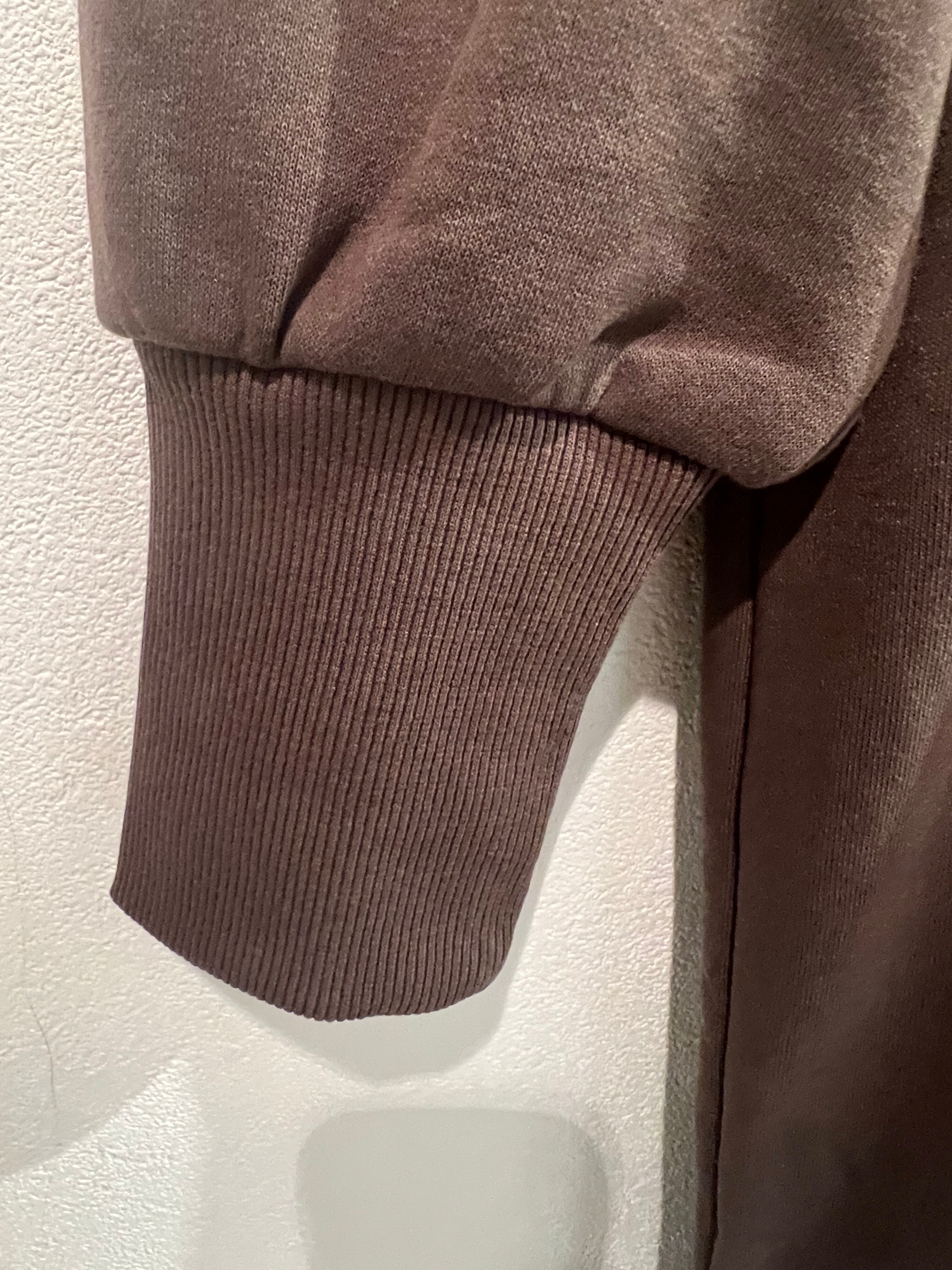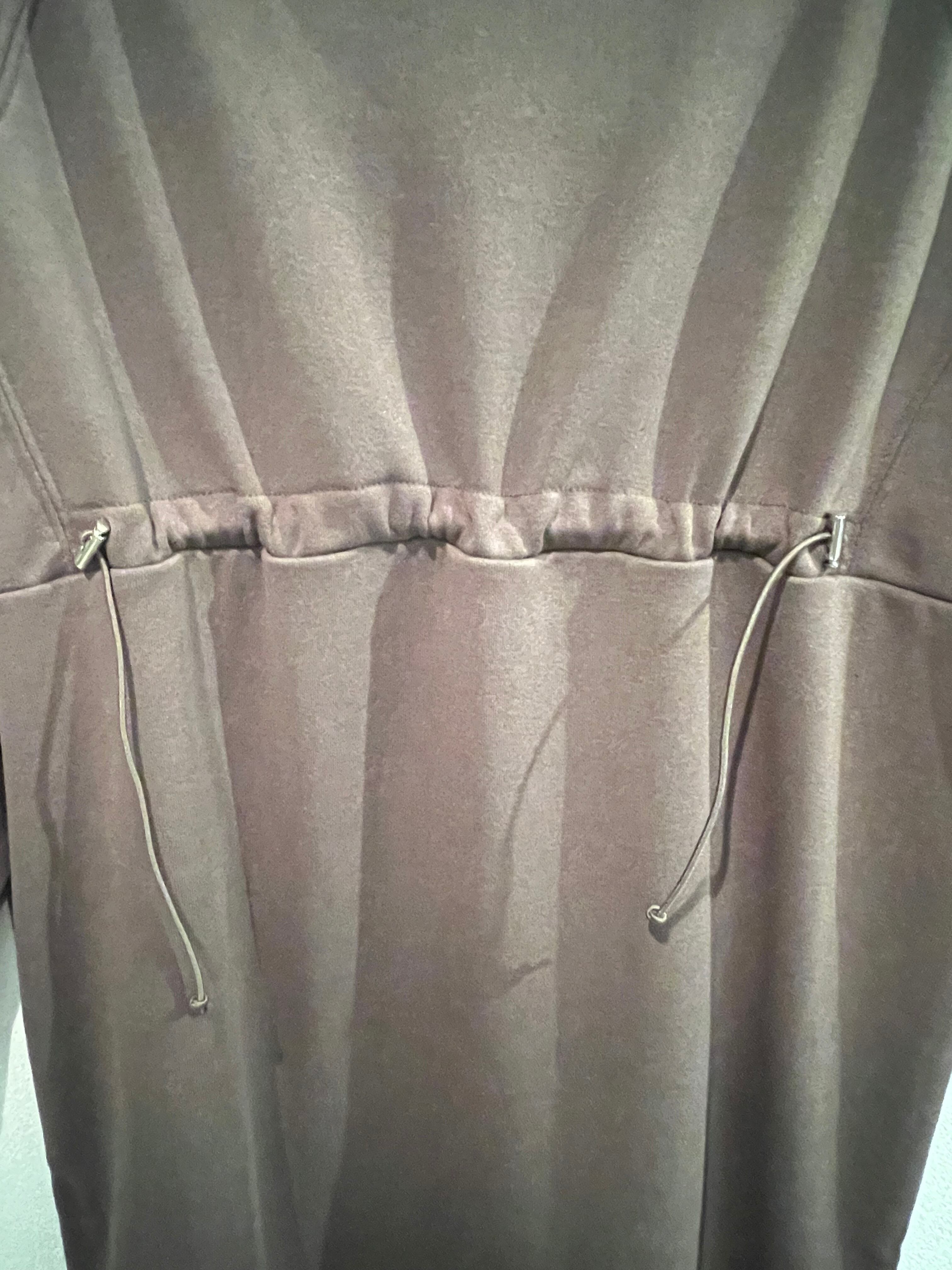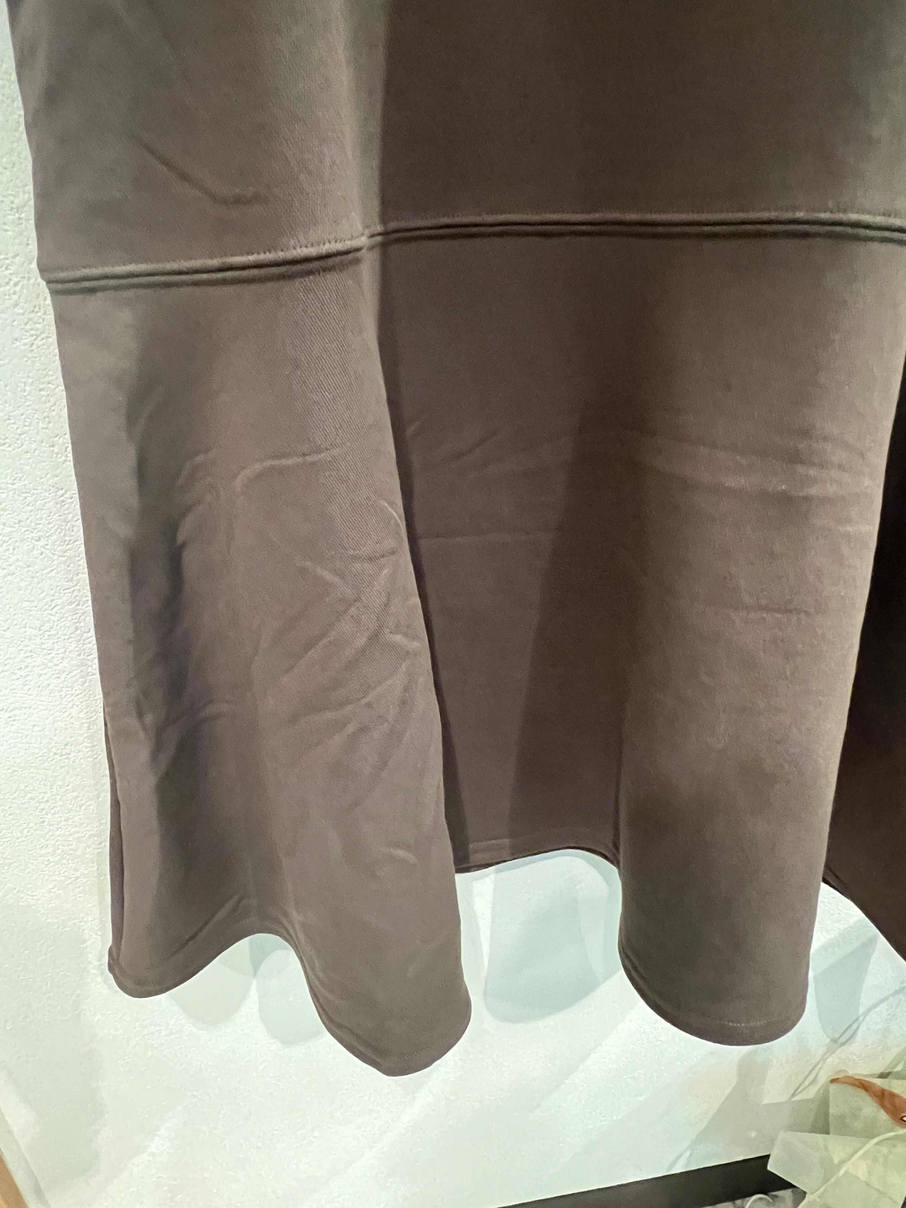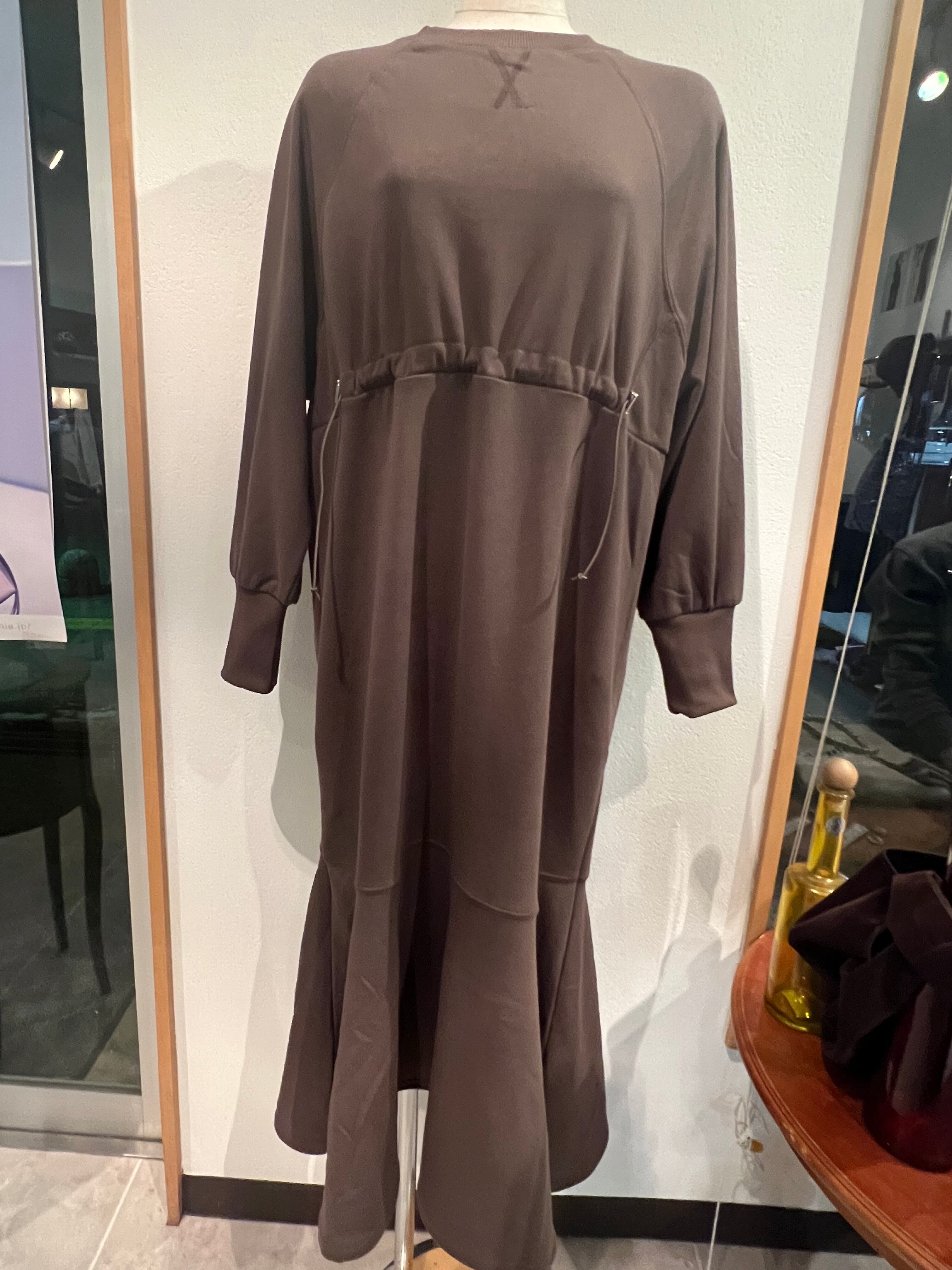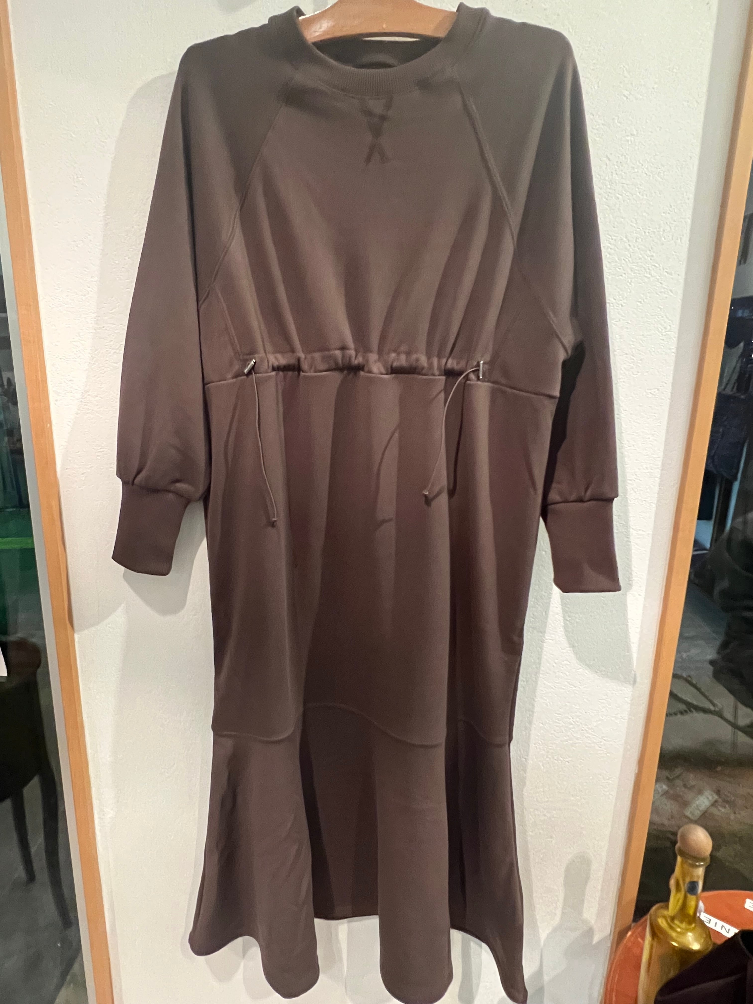 ウエストがドロストされたデザイン性あるスウェットワンピース。裾はフレアーラインになっており、自然と綺麗に出るフレアー感が女性らしさをアップさせてくれます。ラグランスリーブでアームも広めにとってあり、ほどよくゆったりとしたシルエットが大人の抜け感を演出してくれます。ウエストの前後はドロスト出来る仕様になっており、キュッとウエストで絞ったり、ゆるっとさせたり体型や着たいシルエットによって調整できます。ウエスト位置も少し高めになっているので、足長効果も抜群!
