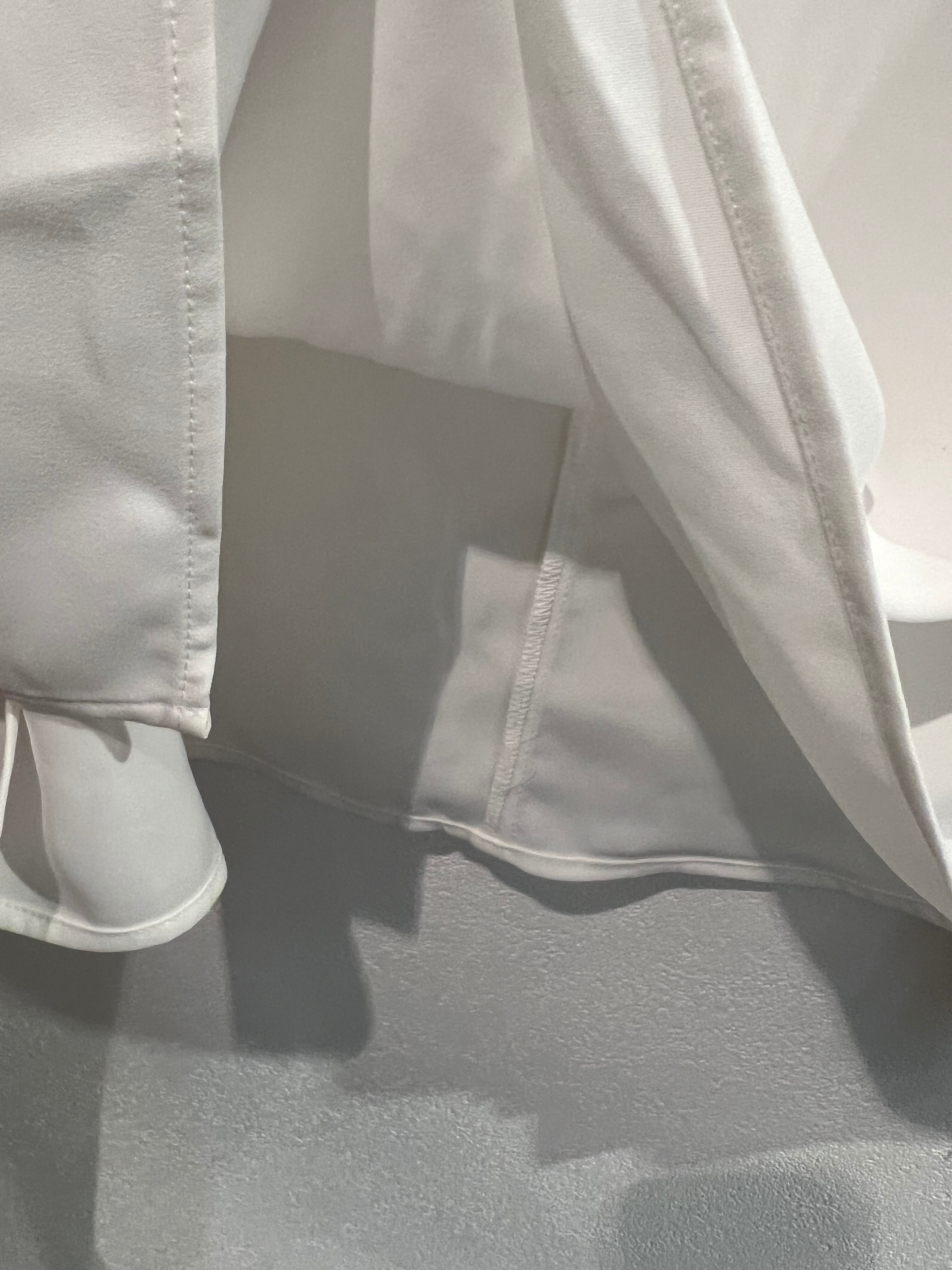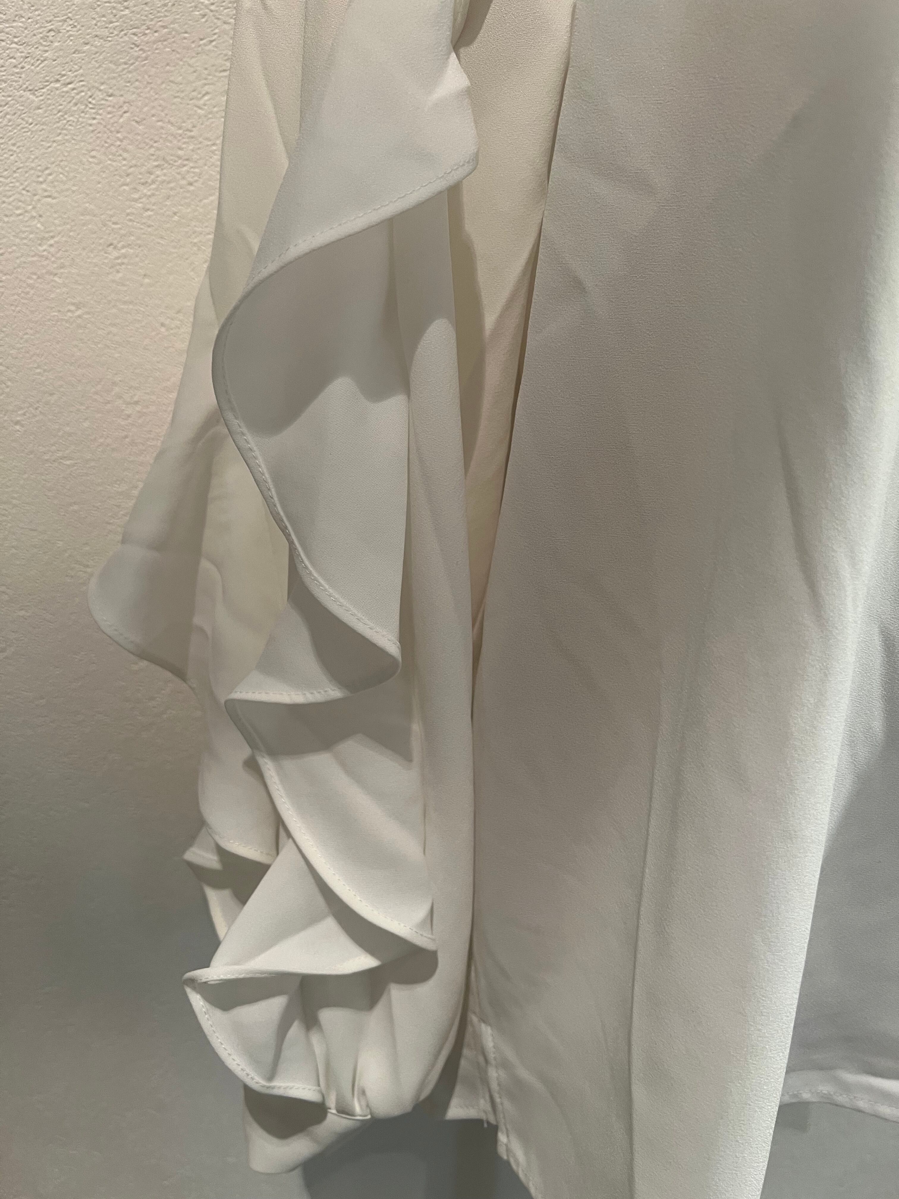 首元はスタンドネックでキッチリ感を出し、肩から袖口まで流れるようなフリルで上品なシルエットに。少しドロップしたショルダーと、ゆったりめのバストが締め付けない着心地がおススメです。