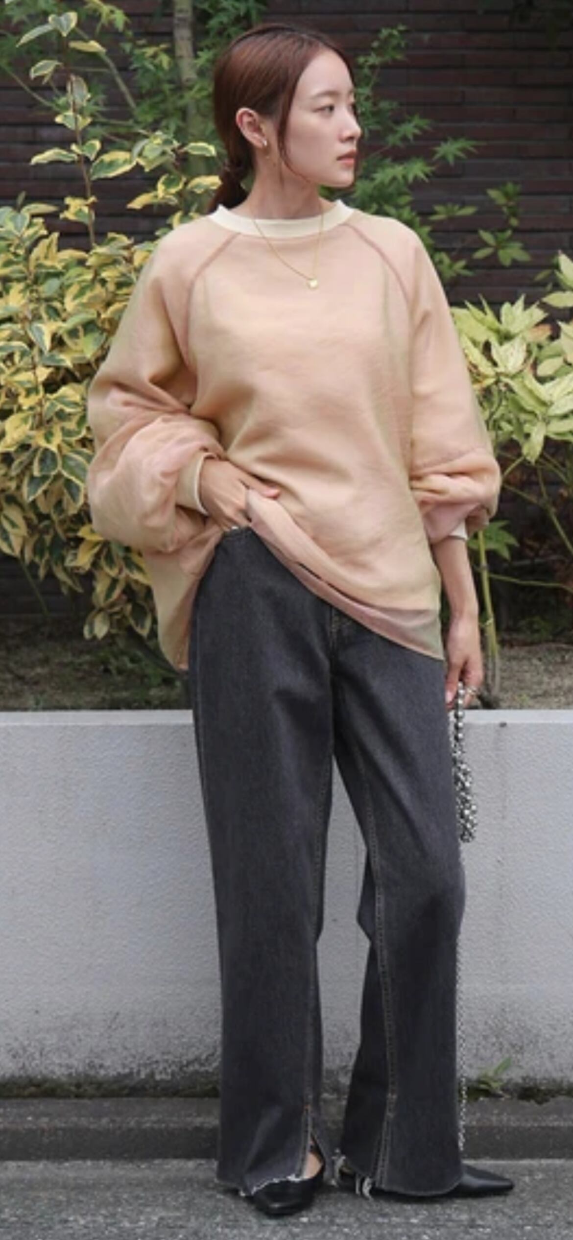 オーガンジーと裏毛スウェット2種類の素材を使用しています。スウェットは程よい薄すぎず厚過ぎない素材で、春先までしっかり着用いただけます。