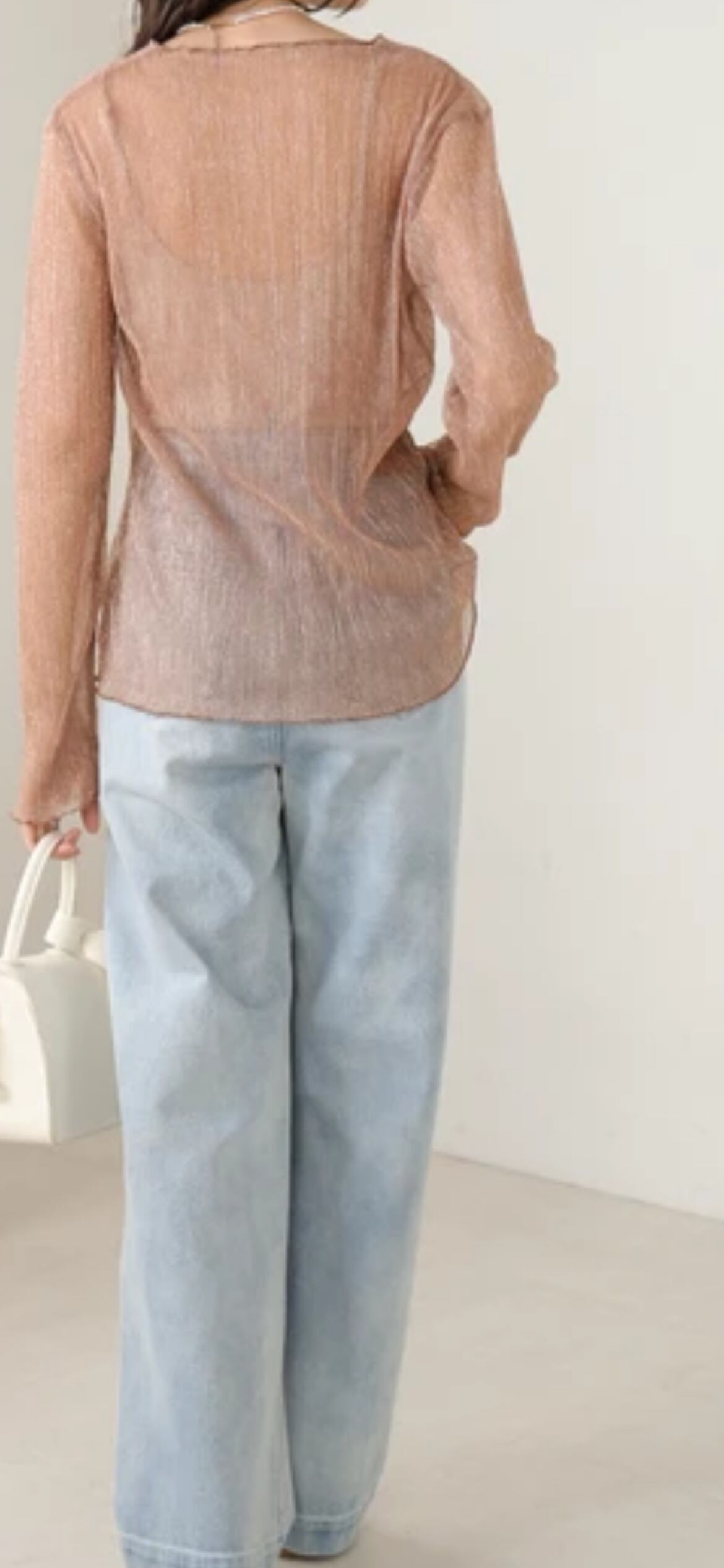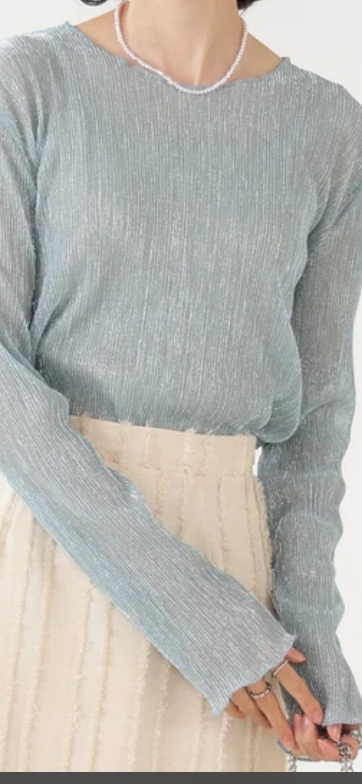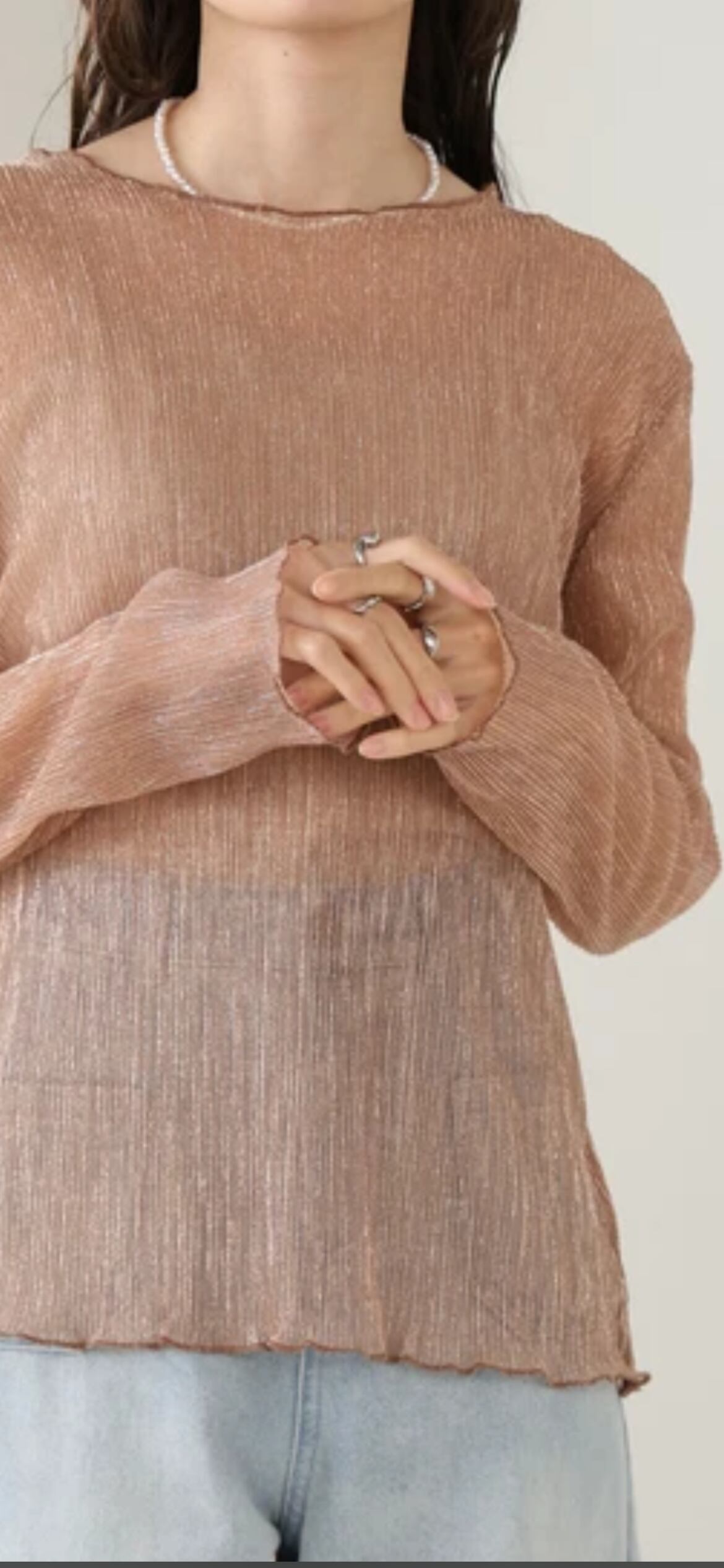 ボディラインに添いすぎないサイズ感が嬉しい、1枚着でもレイヤードでもヘビロテの着回しが期待できるシアートップス。贅沢なラメで華やかなアクセントをつけ、極細のプリーツが華奢見えを叶えます。メロウ加工の始末が柔らかく優しい印象を演出します。気分に合わせて選べるフェミニンなカラー展開が気分を上げてくれます。コーデに加えるだけで旬顔になれる1枚です。