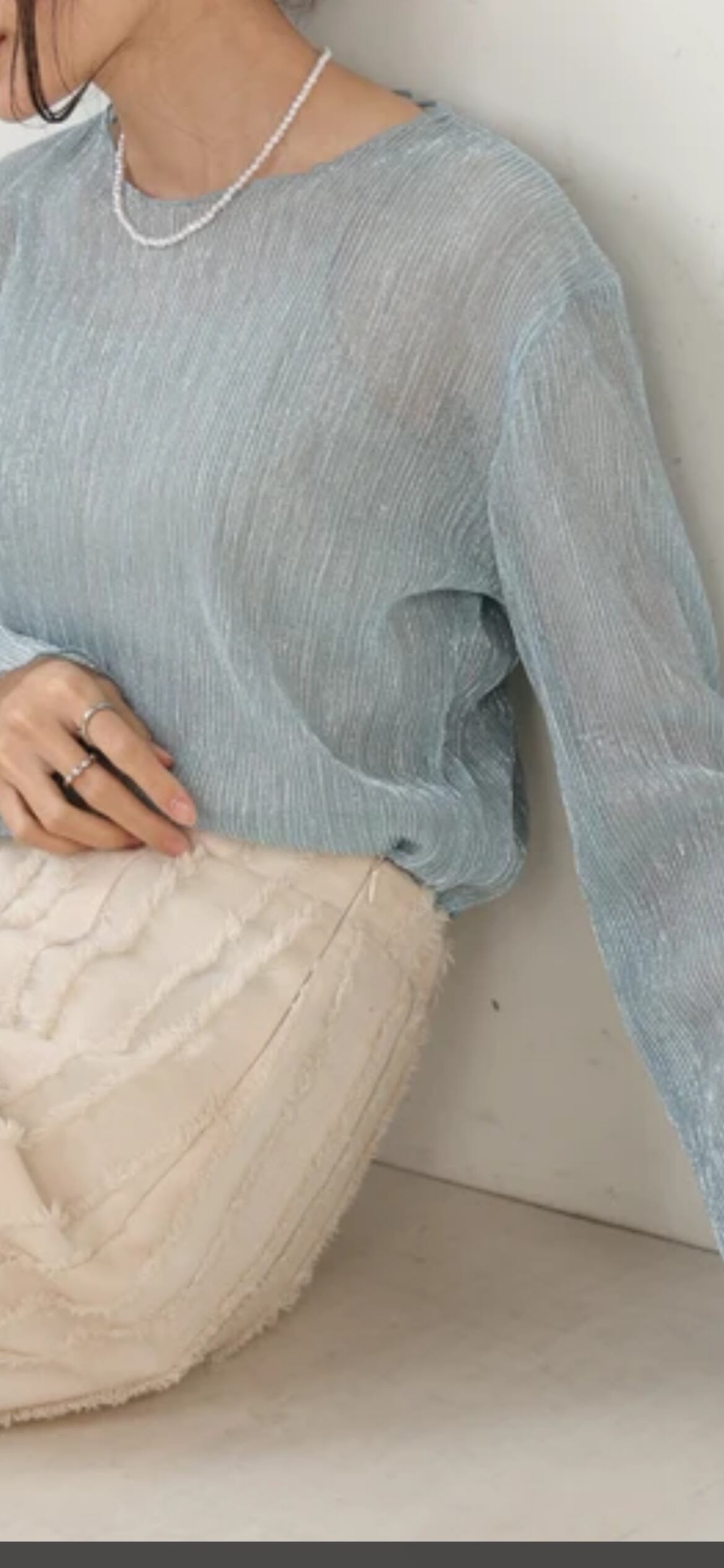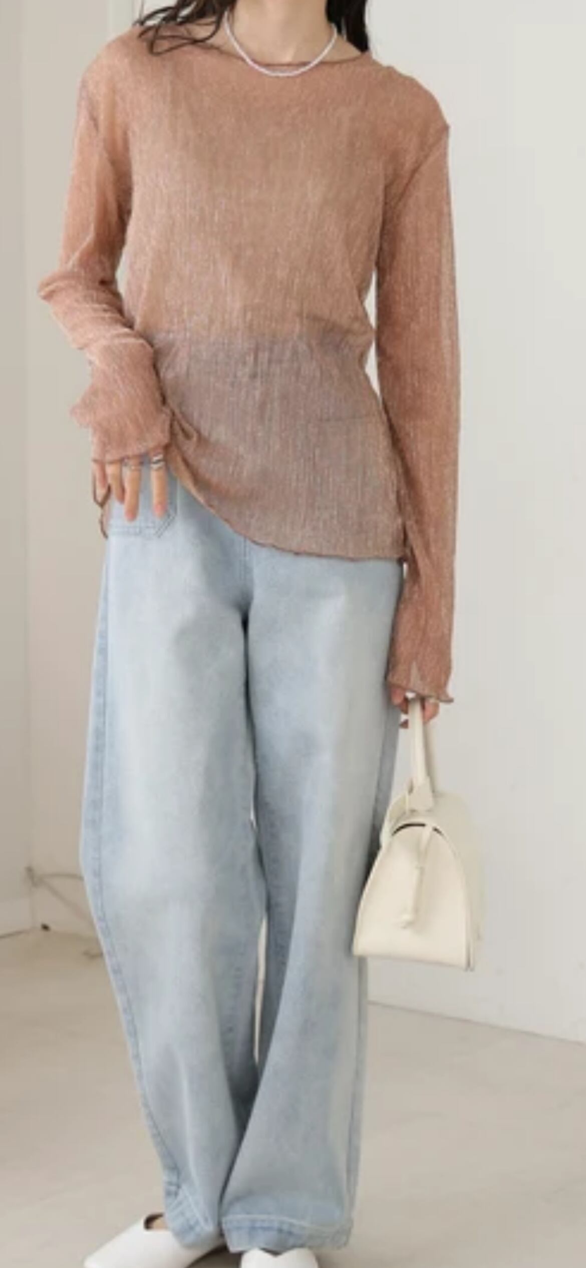 淡いカラーとシアー素材で晩夏からの着用もおすすめ。1枚着で華やかさが演出できるので、シンプルにキャミソール+スラックスと合わせるだけでも素敵です。ラメをふんだんにあしらったシアートップスなので、華やかなスタイルを演出したいときにも◎。ブラックのナロースカートと合わせれば上品でシックなコーディネートに。ビスチェやサスペンダーパンツとのレイヤードでトレンド感のある着こなしも楽しめます。