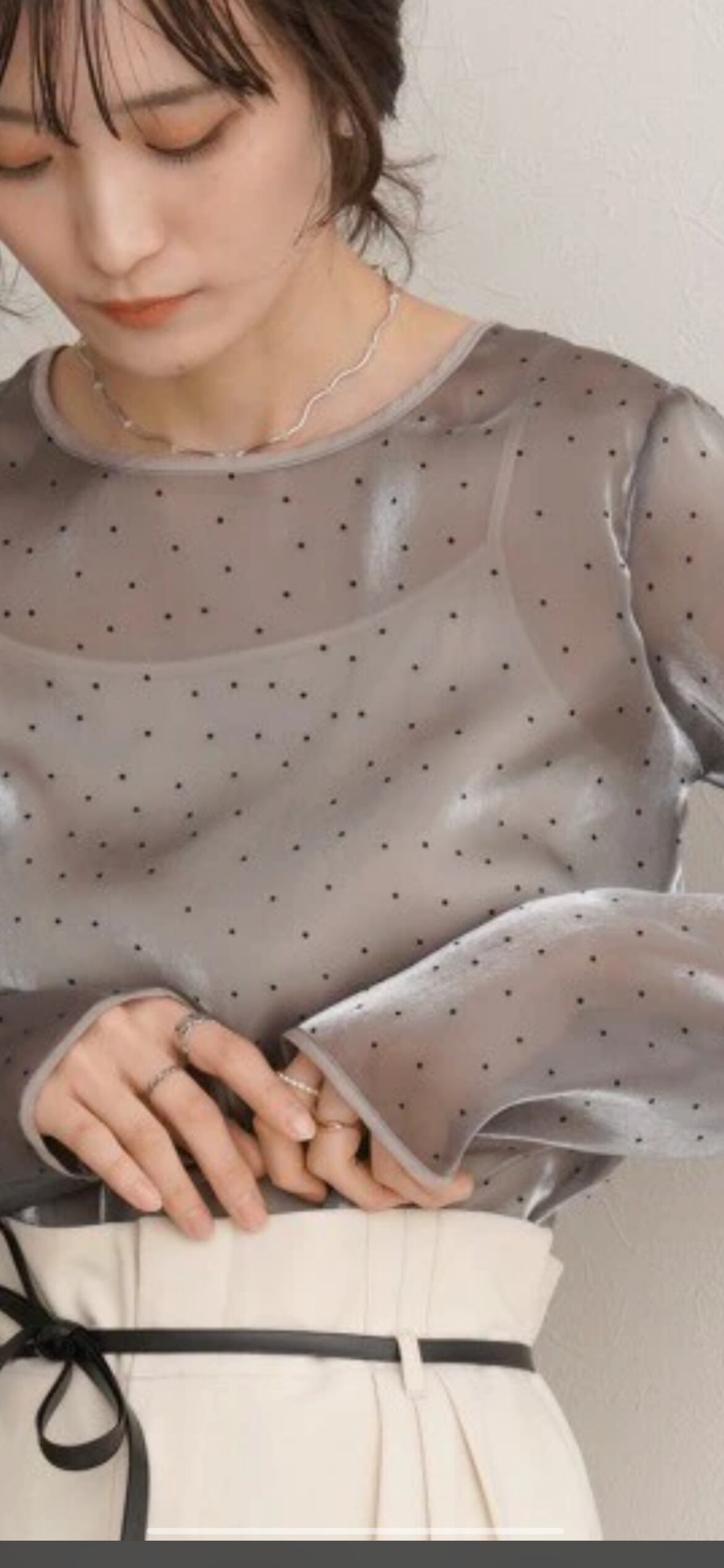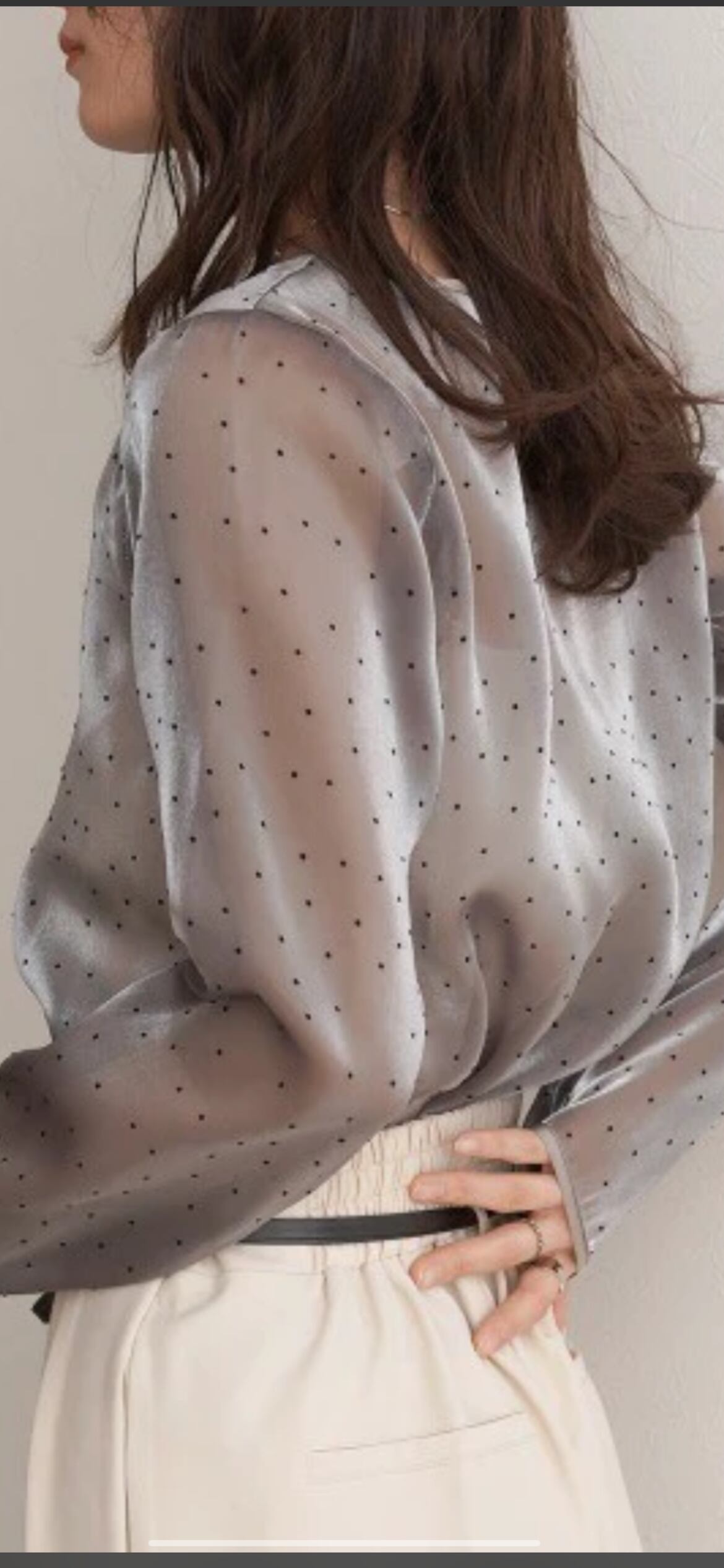 光沢のあるシアー生地にフロッキードットをランダムに配置したガーリーなブラウスです。裾や袖口、襟ぐりは優しい印象のパイピング始末で女性らしい雰囲気がより際立ちます。オケージョンシーンにも馴染む品の良いカラー展開ですが、シンプルなシルエットでボトムスを選ばず、デイリーにも着回しができる汎用性のあるアイテムです。