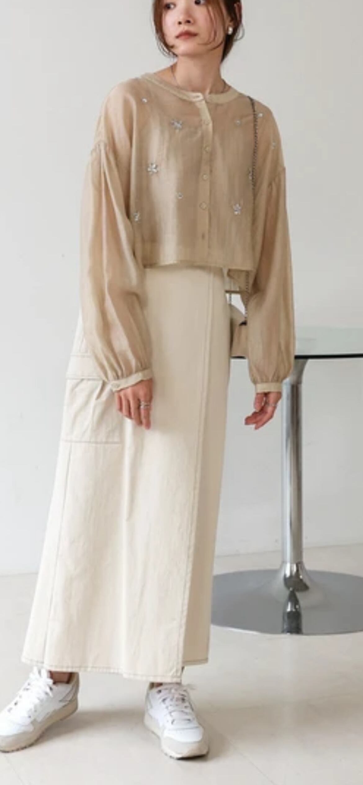 すっきりとしたラップスカートやマニッシュなスラックスなど、シンプルなアイテムとのコーディネートでビジューがより際立ちます。ボタンを開けてカーディガンやボレロの代わりに羽織ってもこなれ感のあるスタイルに◎。