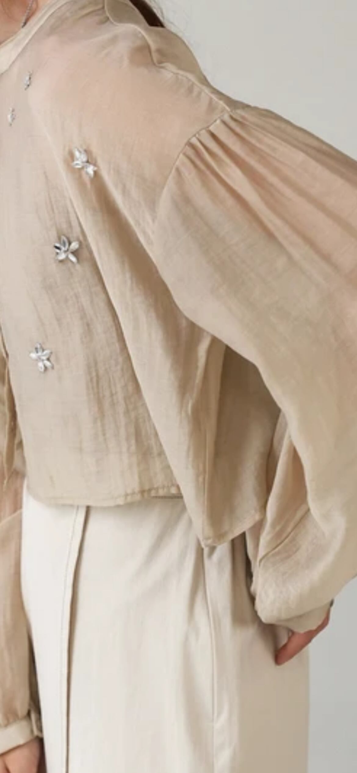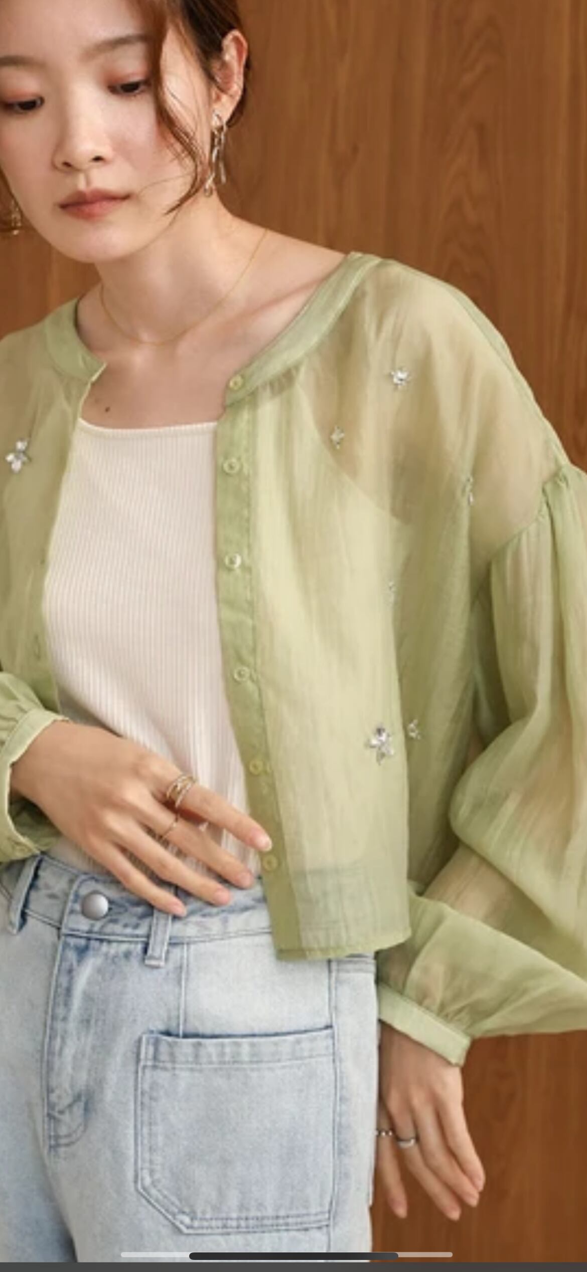 ランダムに配置されたシルバーのビジューが華やかさと可憐さを漂わせるシアーブラウスが登場しました。光沢感のある生地はノンストレスな軽い着心地。前後2WAYでお召し頂け、背面のシンプルな無地を表にしていただくと全く違う雰囲気を楽しむことが出来ます。トレンド感のあるショート丈でスタイルアップを叶え、タックインしないでもきれいなバランスのコーディネートが決まります。甘くなりすぎずにお召し頂ける優しいカラーも好印象な1枚です。