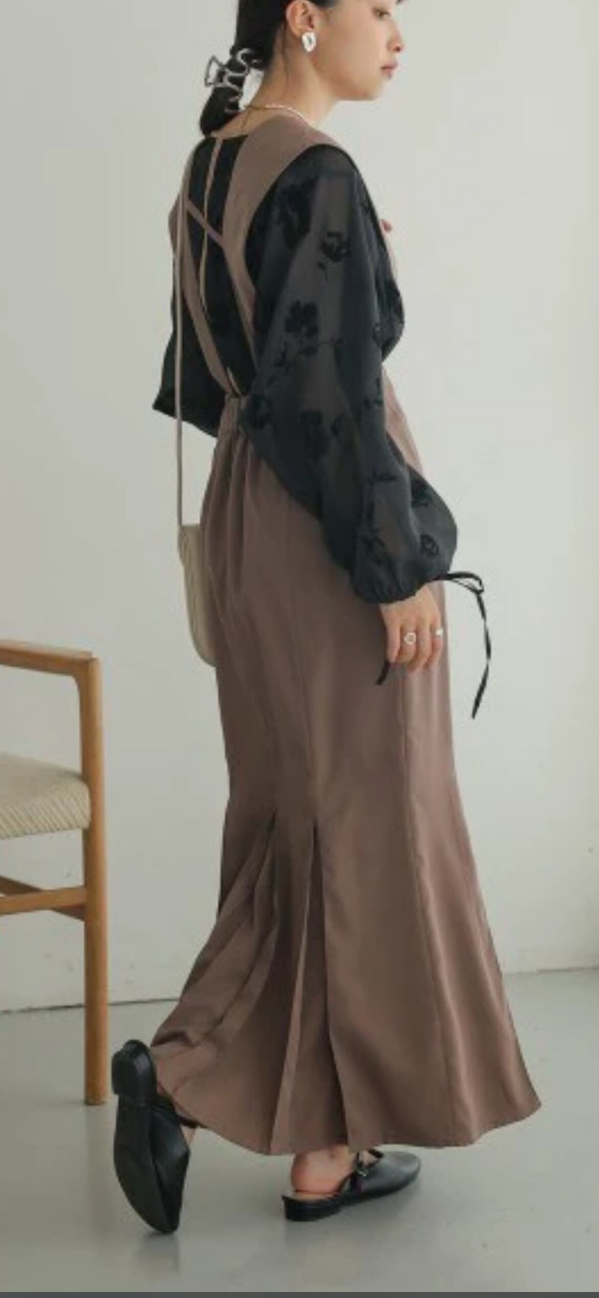 レディライクなブラウスですが、あえてハンサムなスラックスでモノトーンコーデも相性抜群。もちろん、いつものジーンズでカジュアルスタイルにも馴染みます。ジャンパーワンピースのインに仕込めば、トレンド感のあるきれいめな着こなしに。