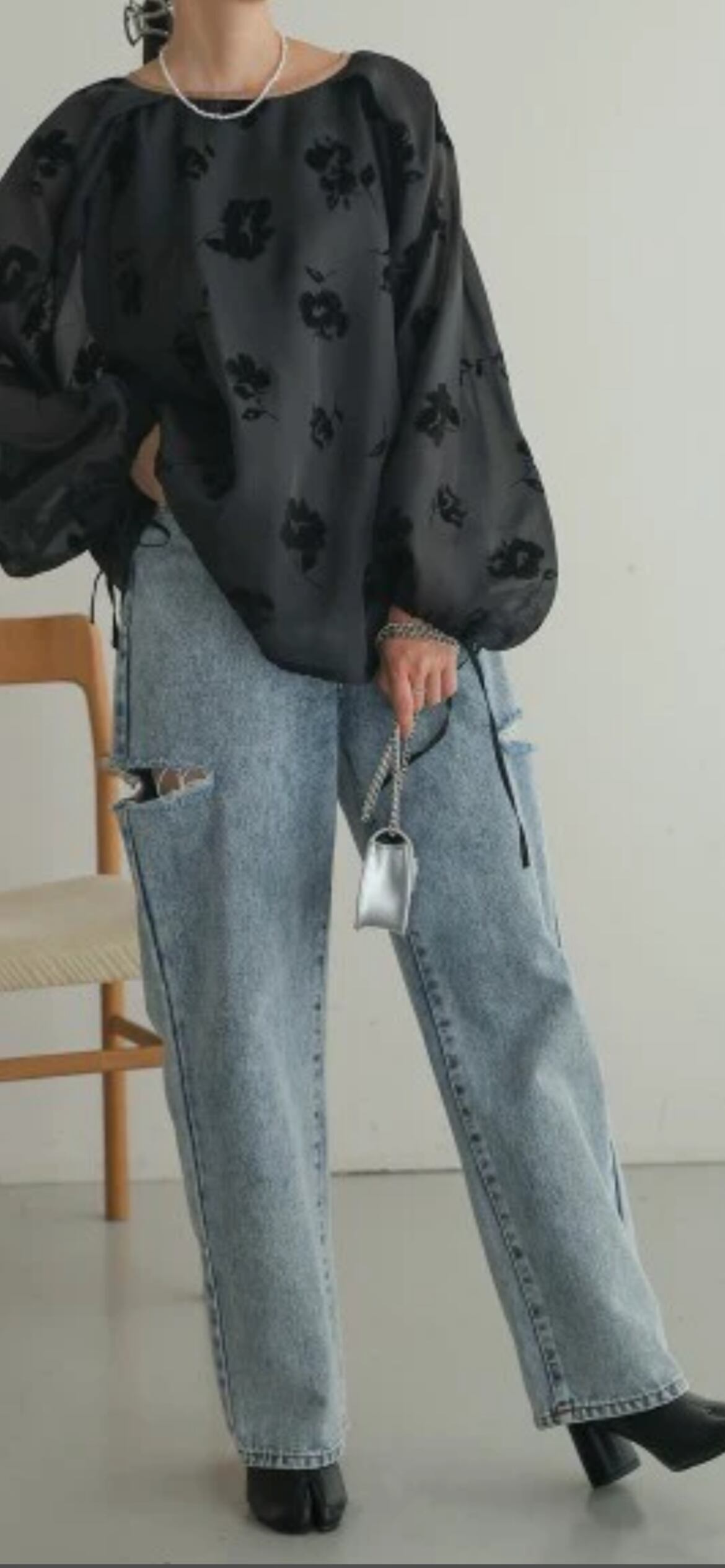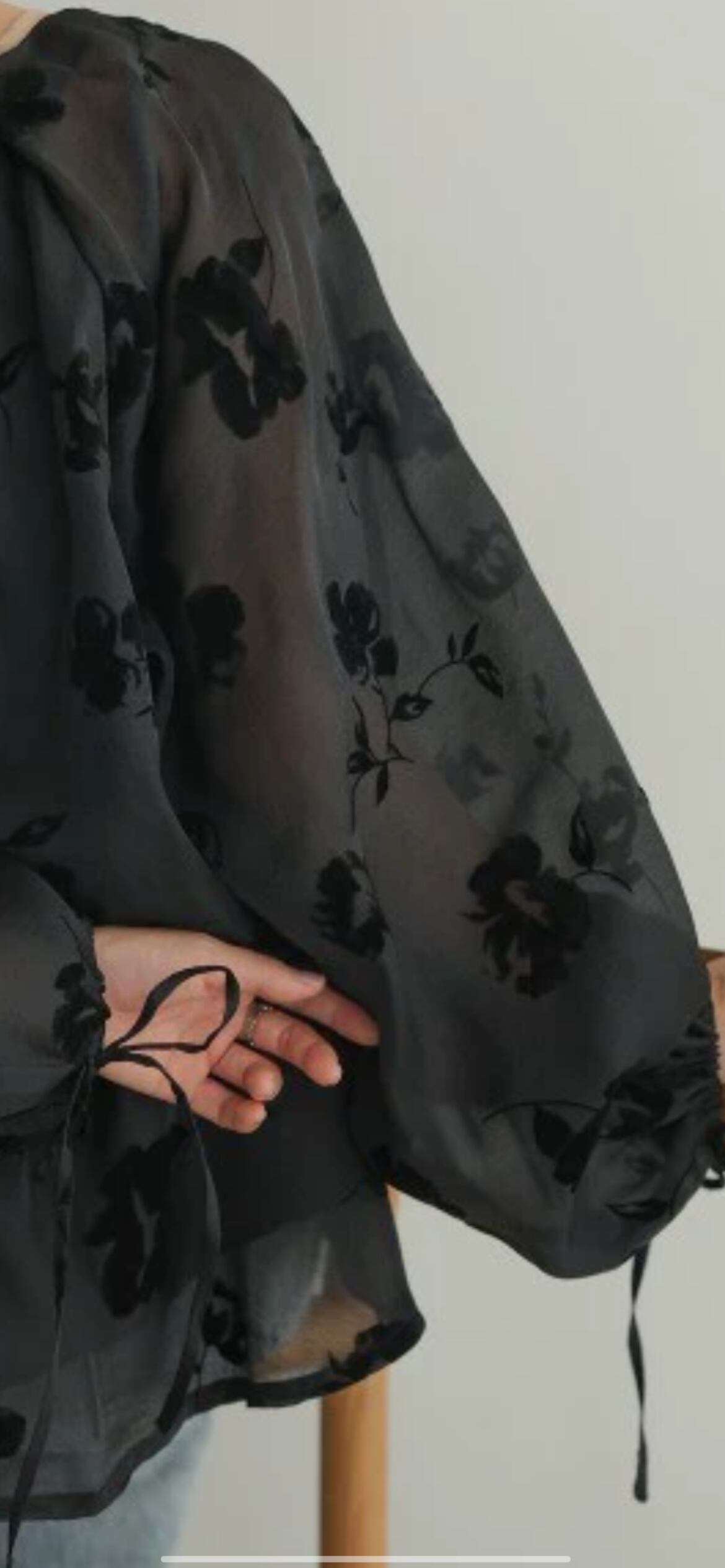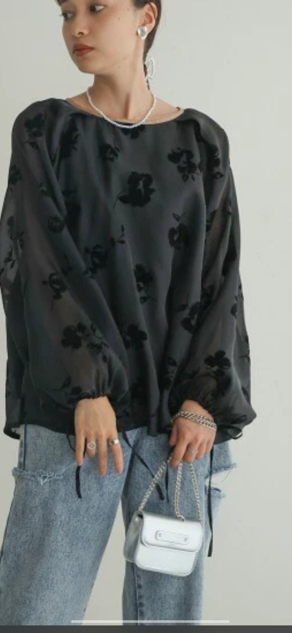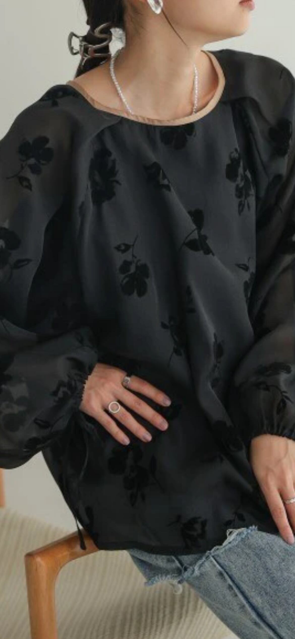 上品なフロッキープリントが魅力的な1枚。透けすぎないシアー感で大人のムードを高めるブラウスです。。