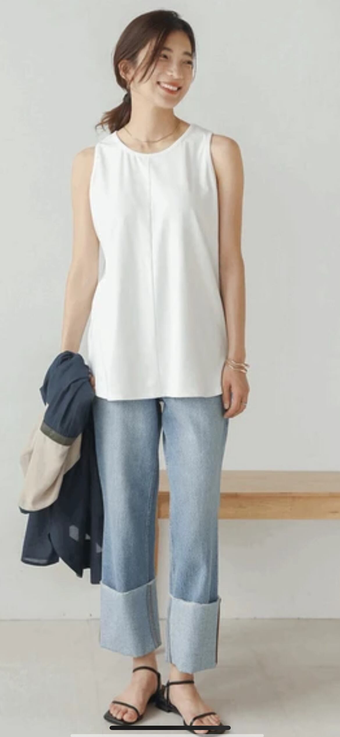 ヘルシーな一枚着としてはもちろん、上からカーデやブラウスをさらっと合わせるのもおすすめ。