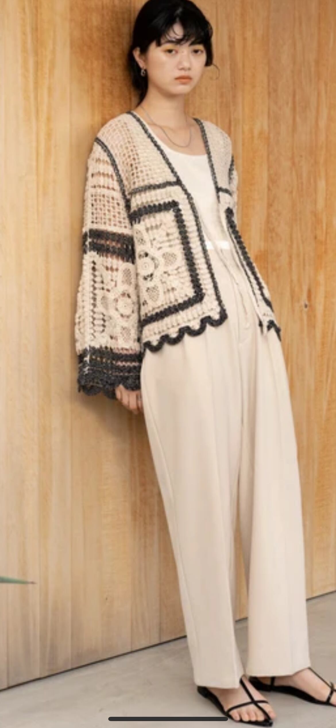 存在感抜群のカーディガンなので、合わせるアイテムはシンプルなデザインがオススメです!すとんとしたキャミワンピのアクセントに羽織ったり、あえてハンサムなスラックスに合わせると こなれ感のある着こなしが楽しめます。いつものジーンズスタイルをアップデートさせたいときにもオススメです。