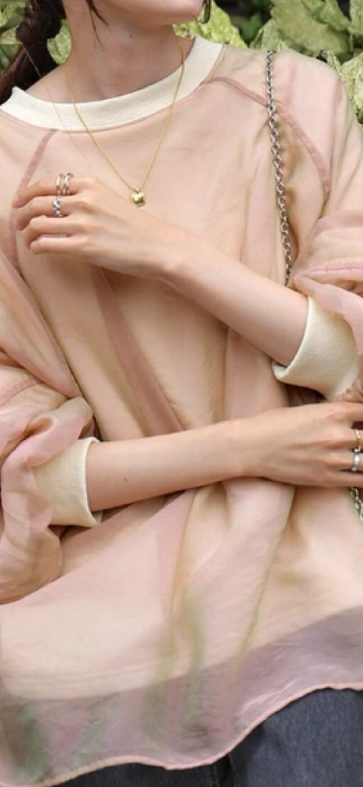 オーガンジーと裏毛スウェット2種類の素材を使用しています。スウェットは程よい薄すぎず厚過ぎない素材で、春先までしっかり着用いただけます。