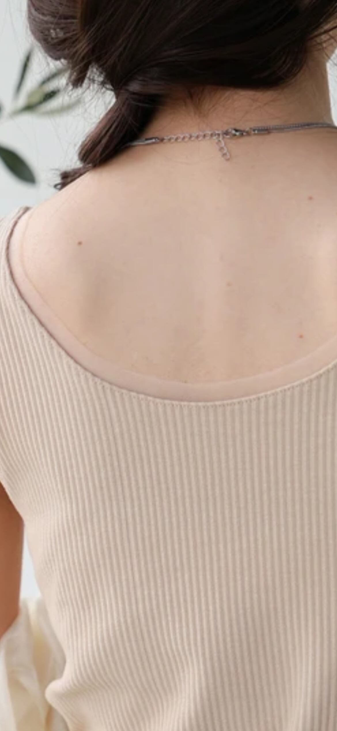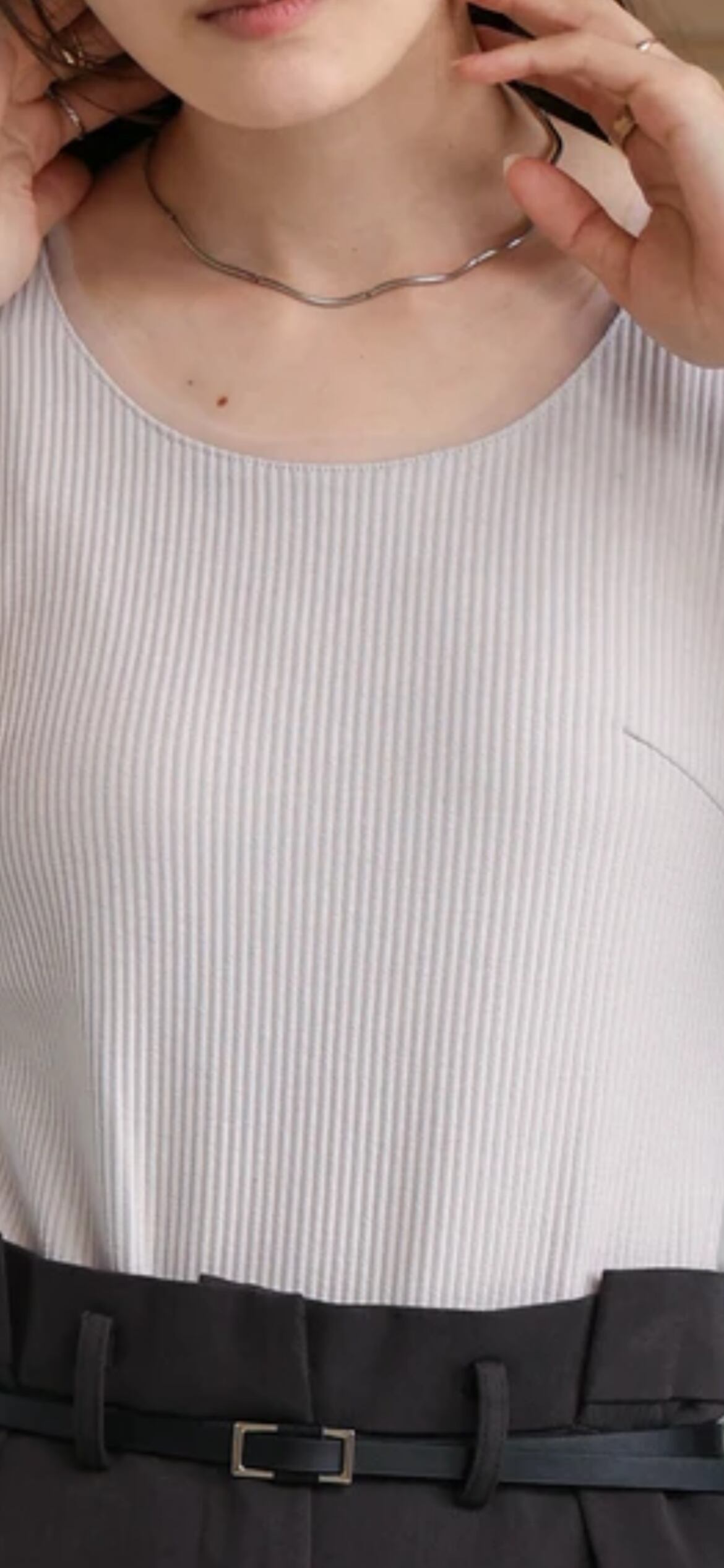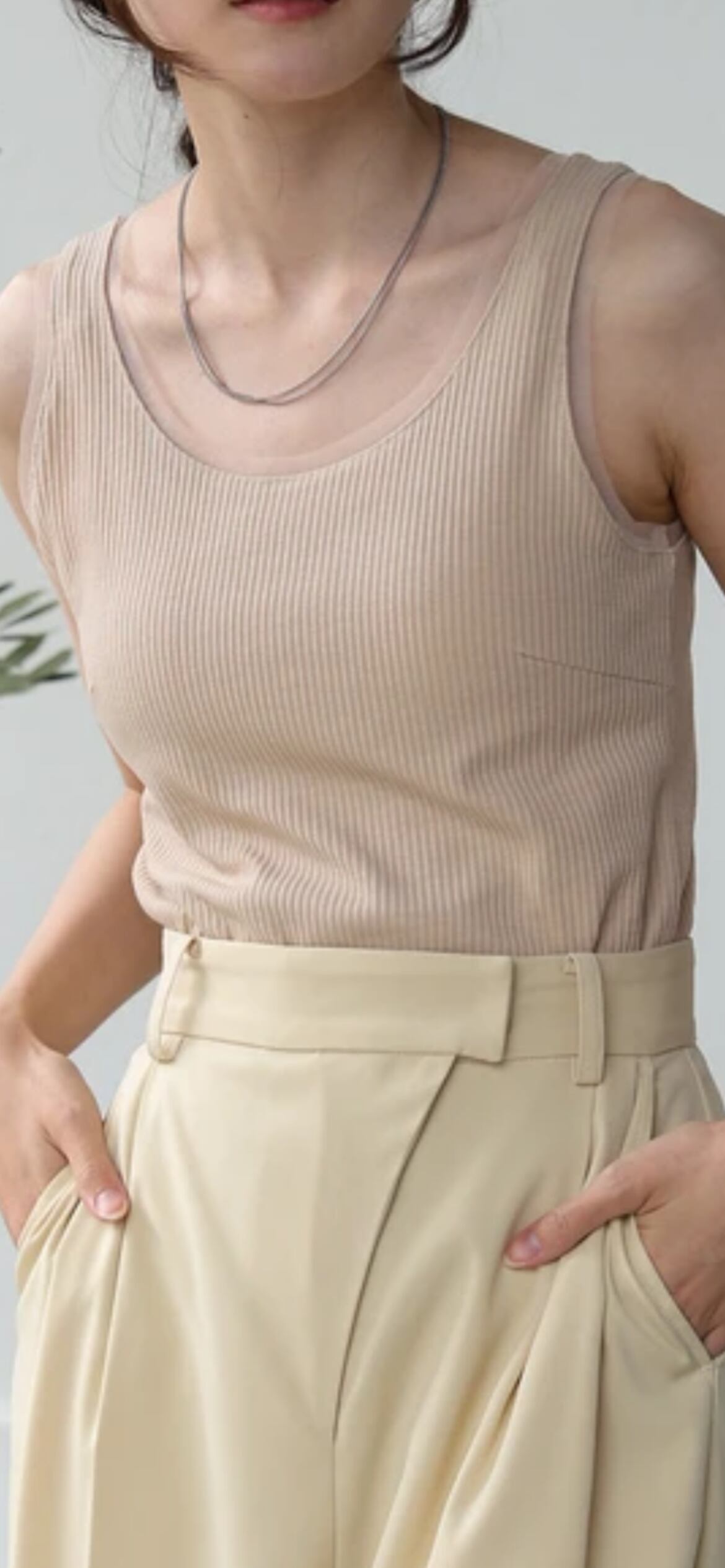 衿ぐりと袖ぐりにチュールを施した着回し抜群のシンプルなタンクトップです。腰回りまで着丈があるので屈んだ姿勢でも安心感があります。本体はピッチの細いリブで程よいフィット感がありながら、締め付け感が無いので着心地も◎。バストダーツでスタイルアップも叶い、脇に余分な隙間も開きません。裾をメロウ始末にすることで1枚でも着映えるアイテムになりました。
