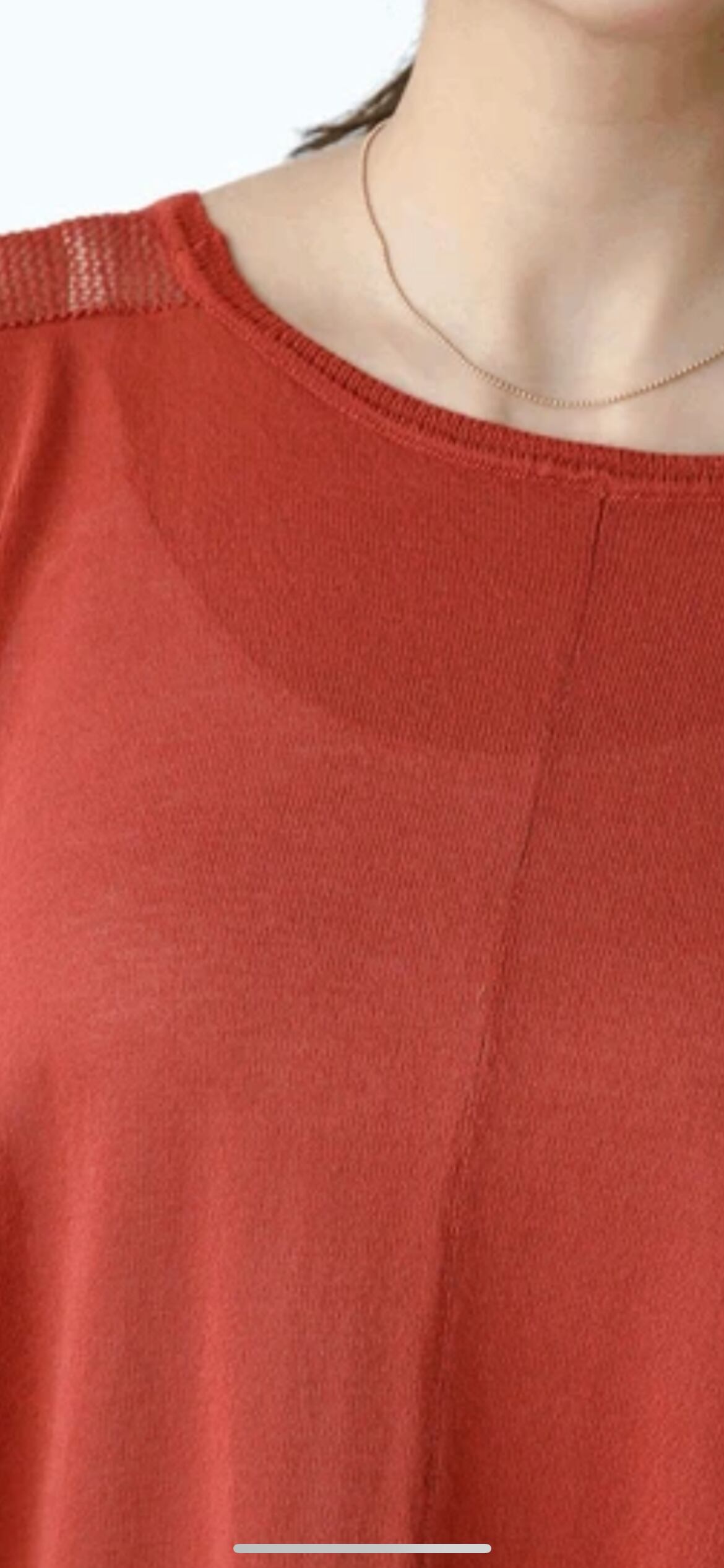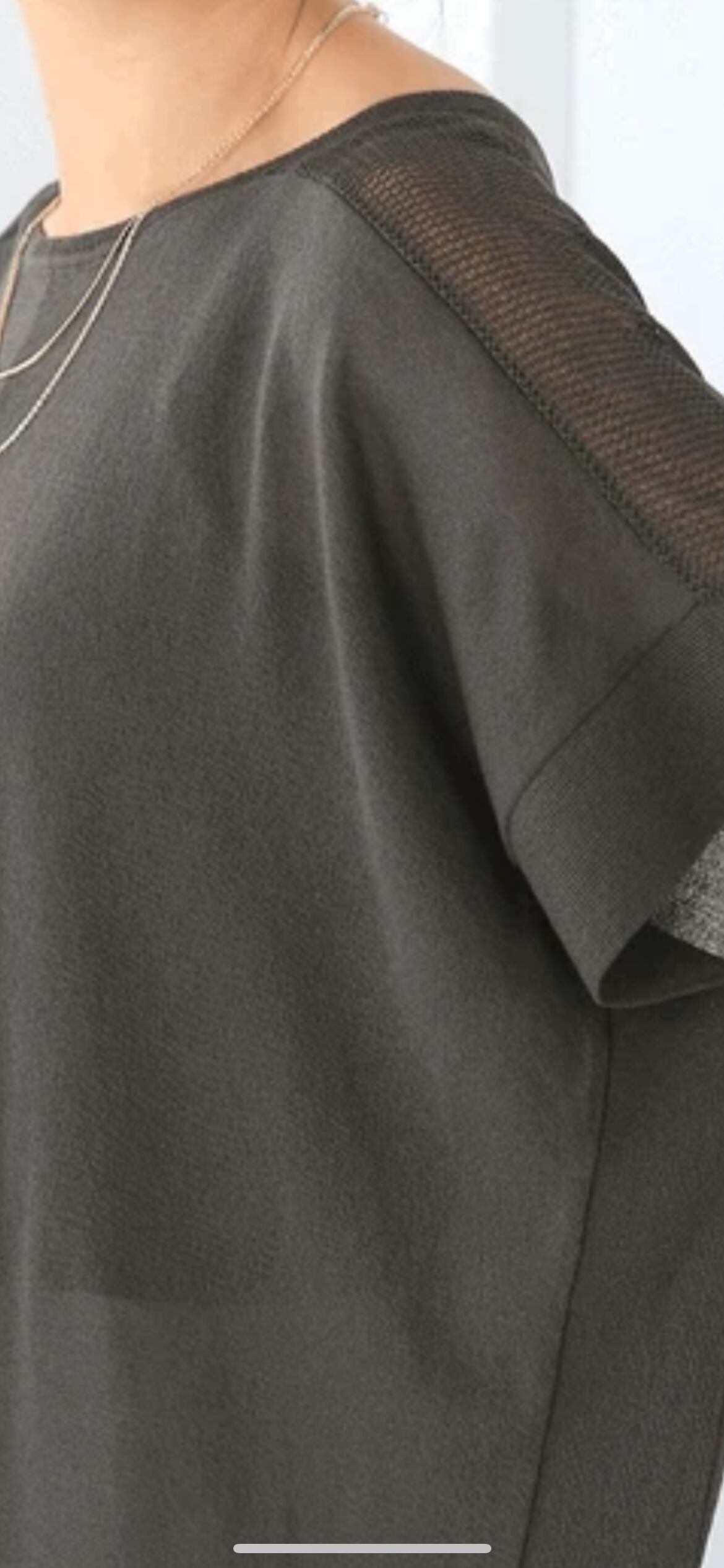 全体的にゆったりとしていますが、スッキリとした首の開きがデコルテを綺麗に見せてくれます。 裾にはスリットを入れてすっきり見えして抜け感が◎