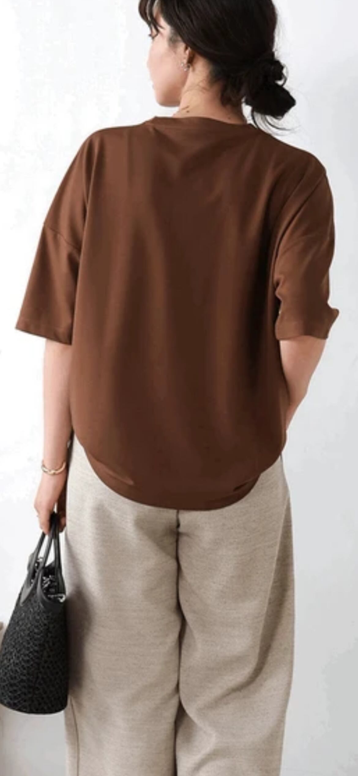 サラッとしたドライタッチな質感の素材を使用しているので、体のラインを拾いづらくゆったりとしたシルエット。