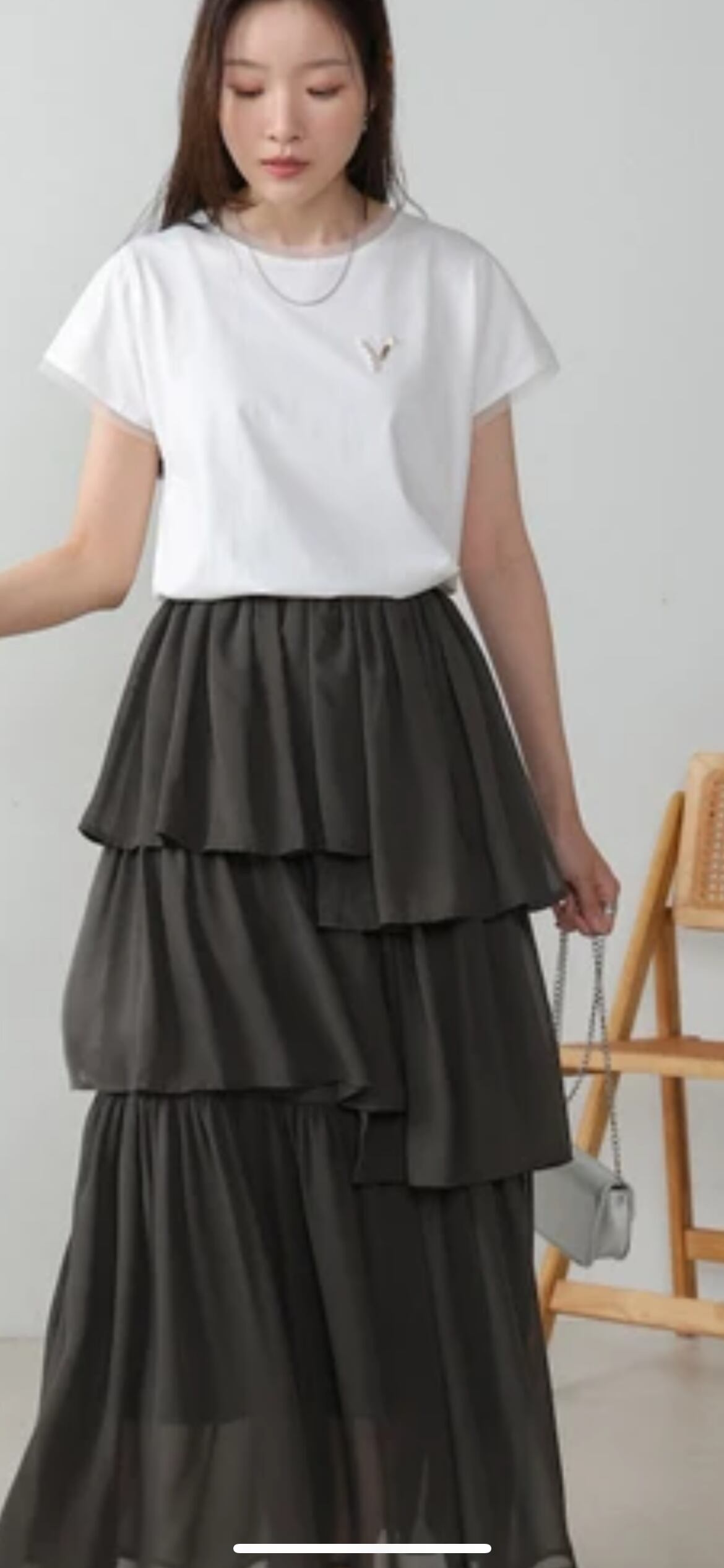 デザイン性のあるスカートなので、シンプルなワンポイントTシャツやニットソーが上品見えでオススメです。シャギーなどの異素材アイテムを合わせる場合は、ワントーンでコーディネートするとスッキリまとまります。