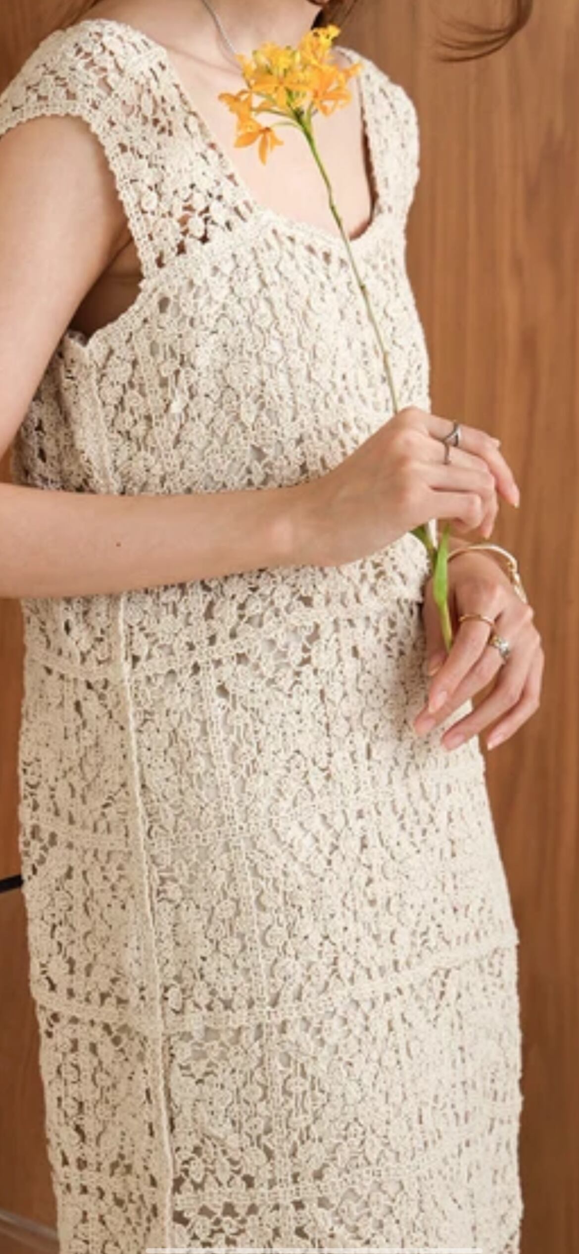 フラワーモチーフのクロシェ編みは、手触りが良く柔らかい素材を使っています。胸から膝下まで、柔らかい裏地が中についているため、敏感肌の方も一枚で着用していただけます。