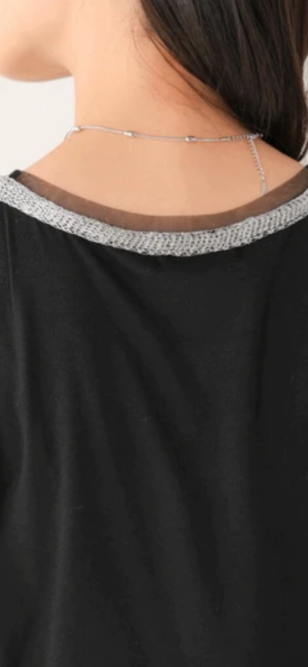 ネックラインには、チュールとキラキラとしたラメ感のある糸を使用したアビガイルチェーンをレイヤードし、さりげない華やかさをプラス。