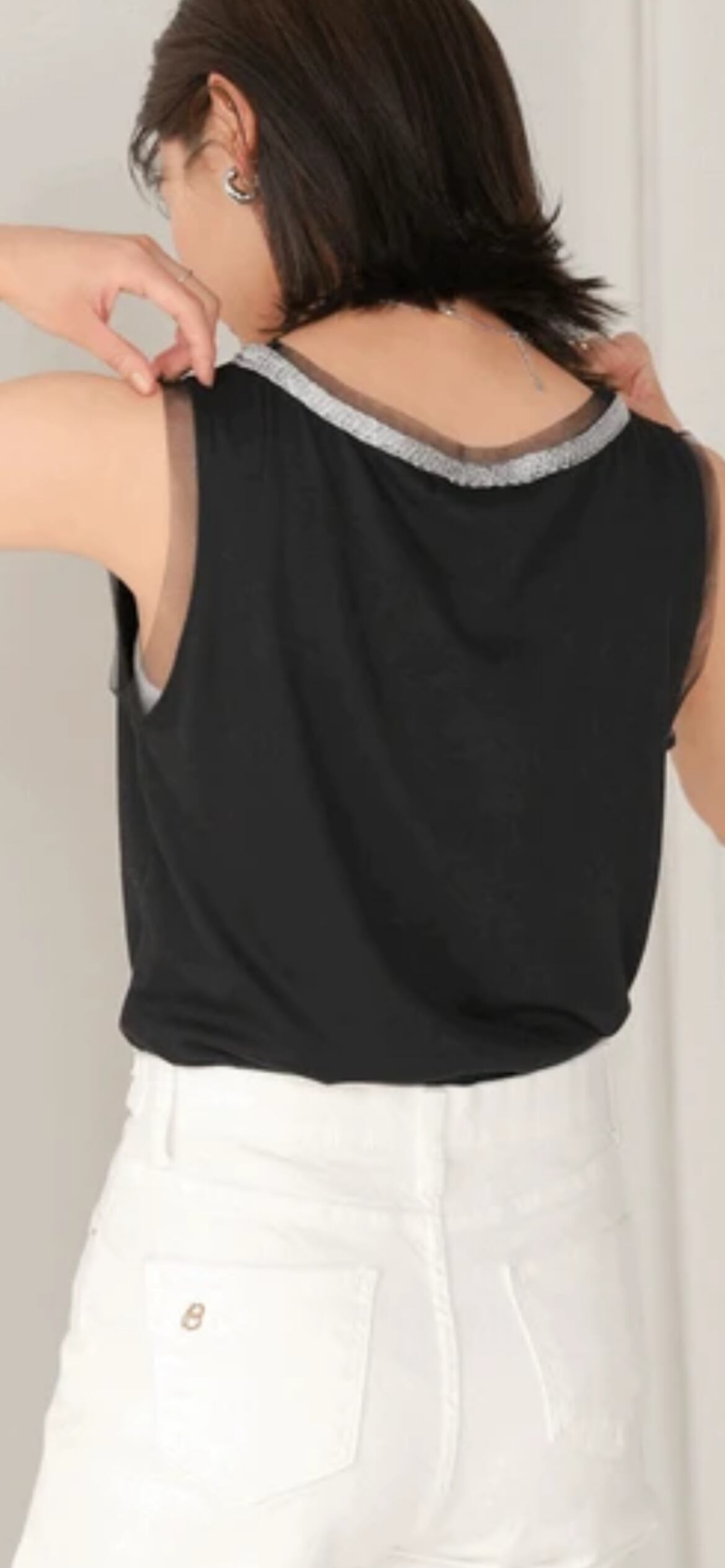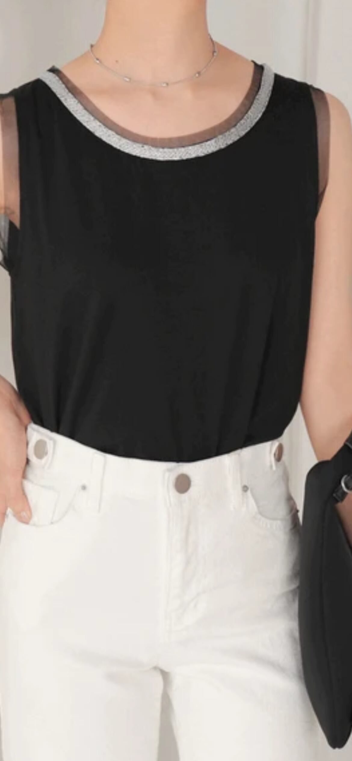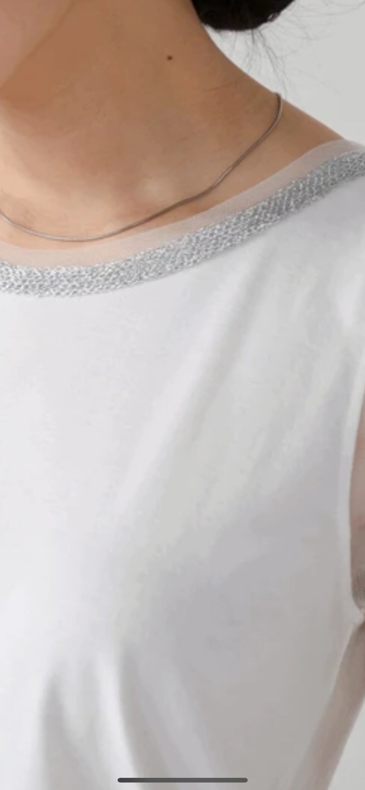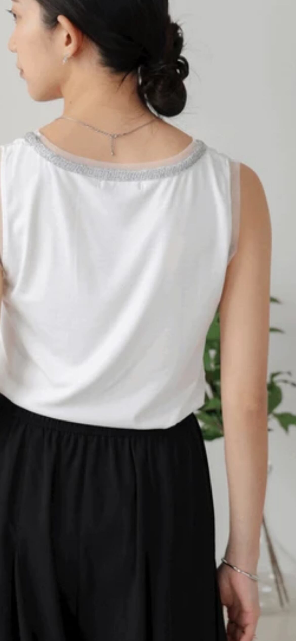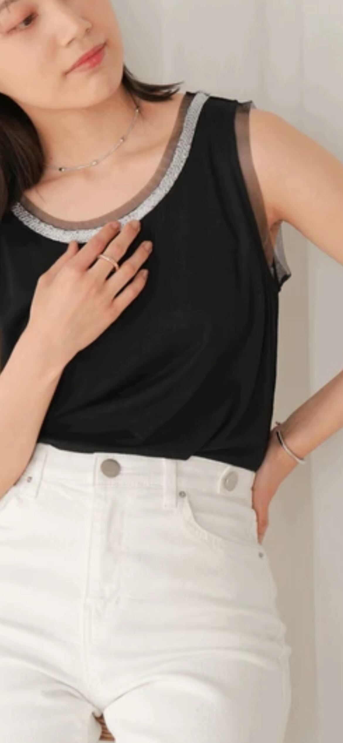 チェーンとシルバーモチーフでアクセントをつけたシンプルタンクトップ。