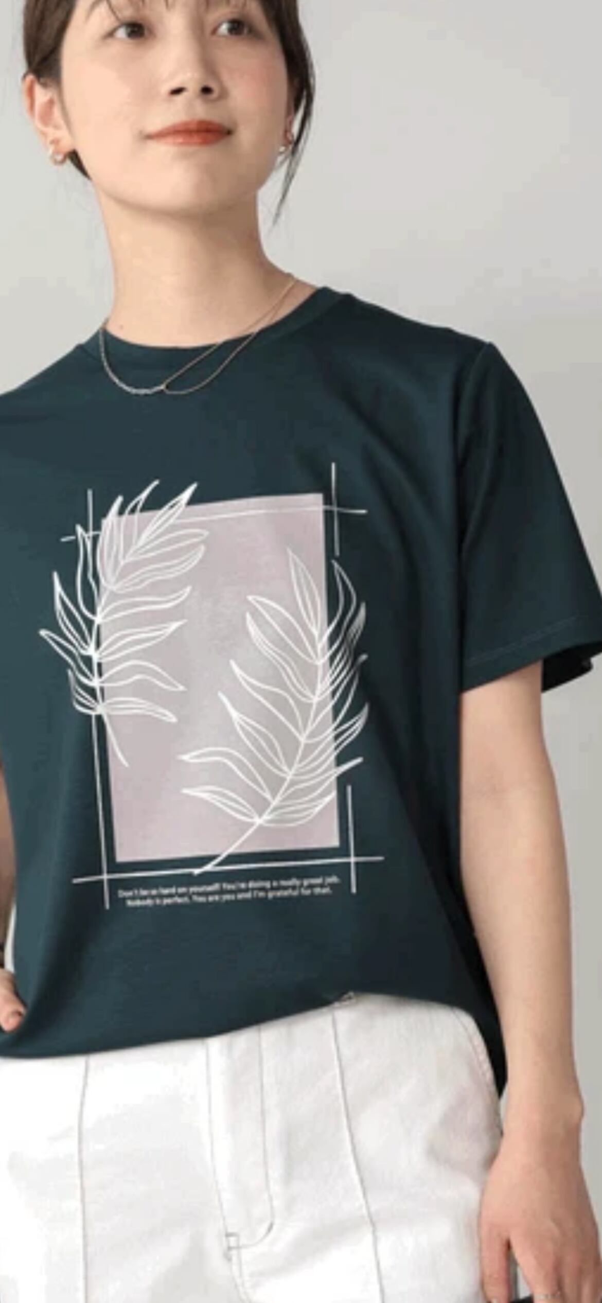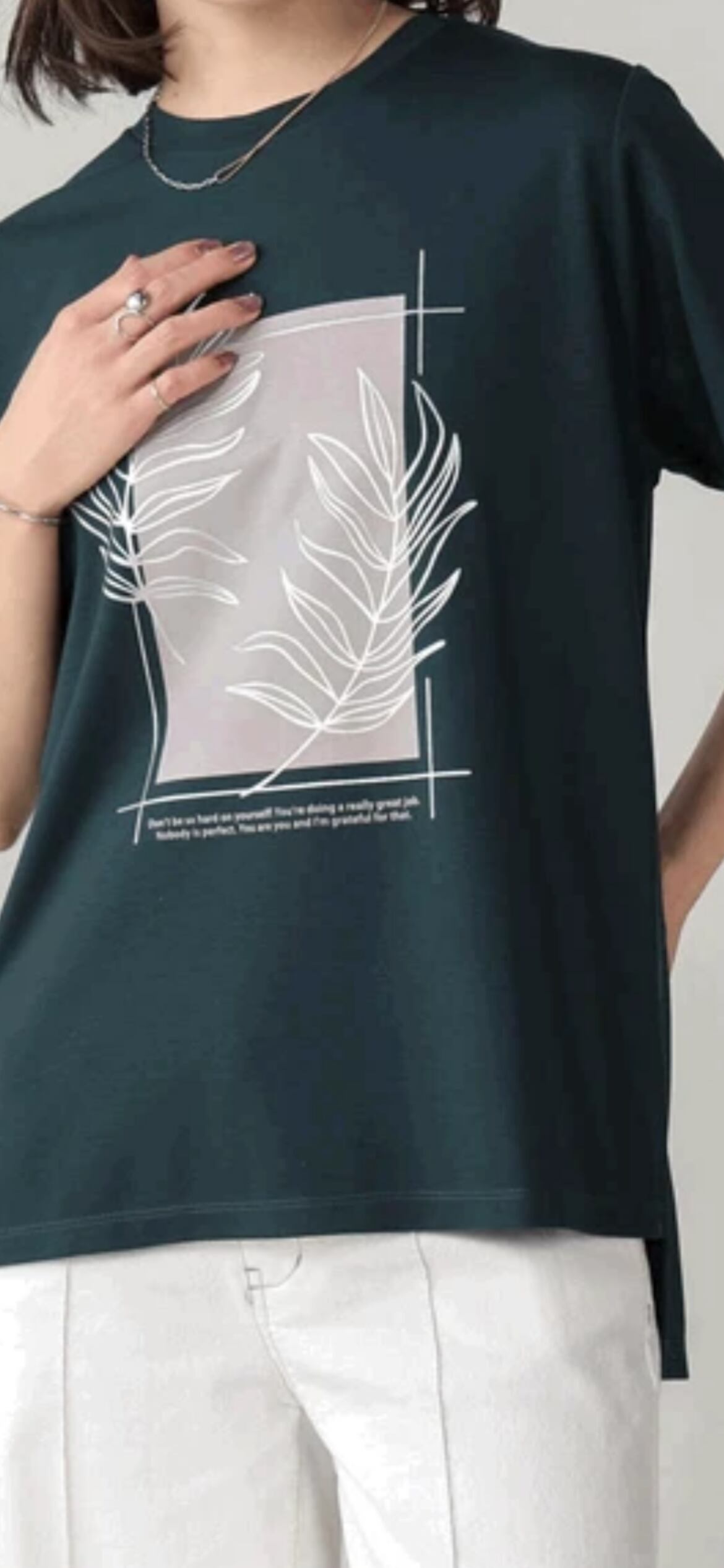 シンプルな形はジレにも合わせやすく、プリントが引き立つコーデに仕上がります。