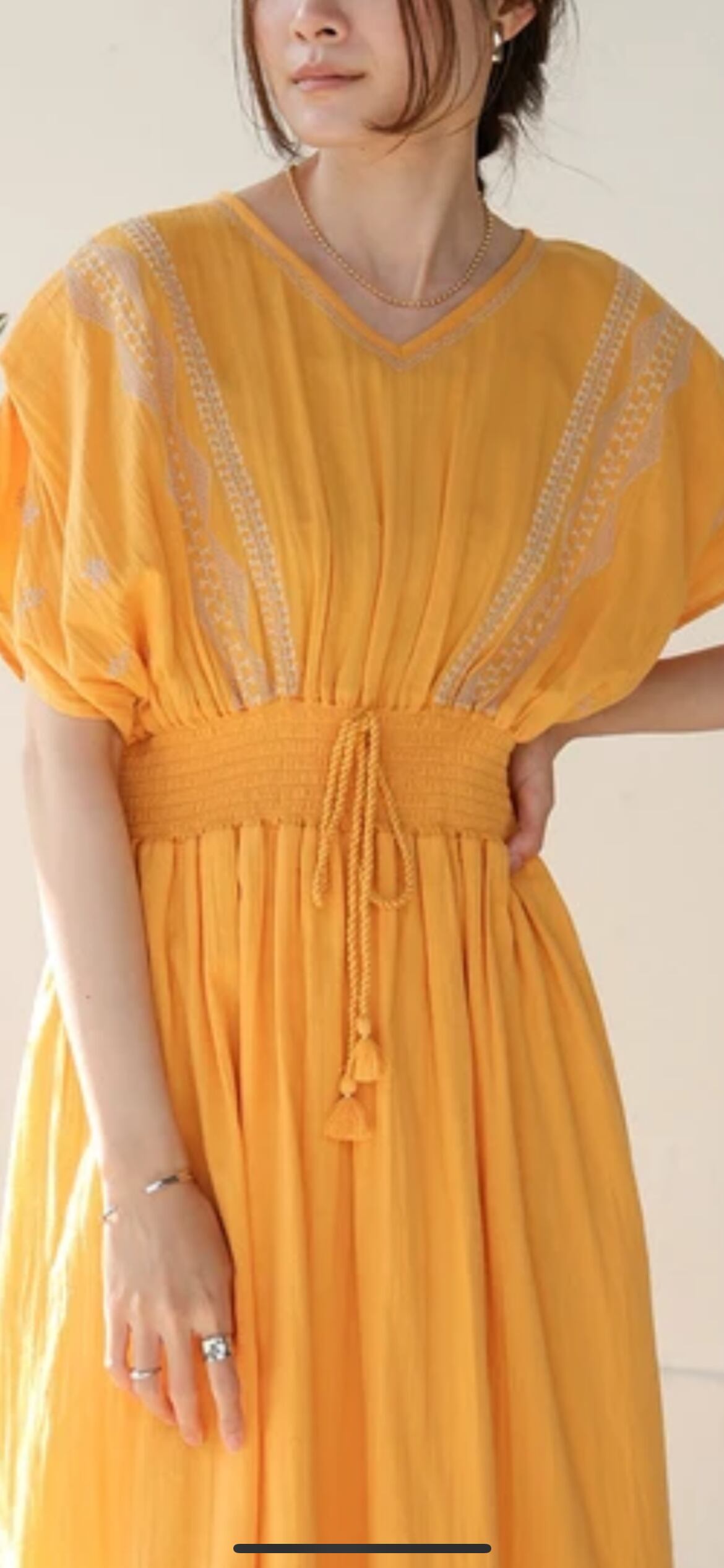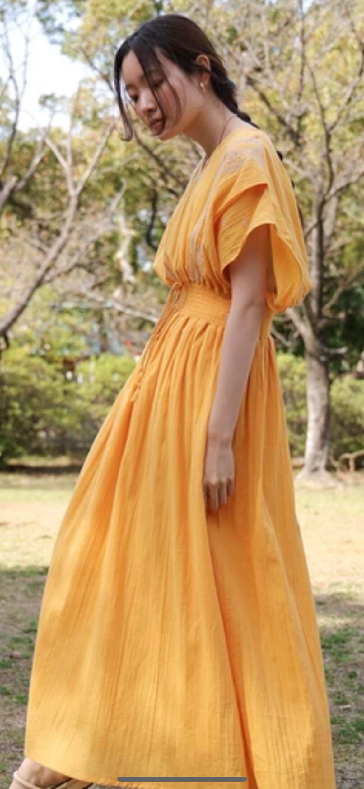 昨シーズンも大好評だったインドコットンを贅沢に使用したワンピース!柔らかくさらっとした質感で肌触りがよく、軽いシワ感はオリエンタルな情緒が漂います。ほどよくシアー感があり、ロングワンピースながら抜け感を演出できる1枚。顔周りやデコルテをすっきりと見せるVネックとウエストシャーリングでスタイルアップも叶い、脚長効果も期待できます。派手過ぎず上品見えする刺繍の位置やデザインにもこだわりました。