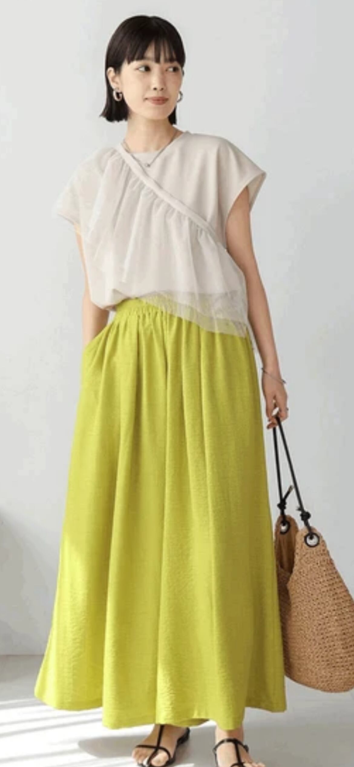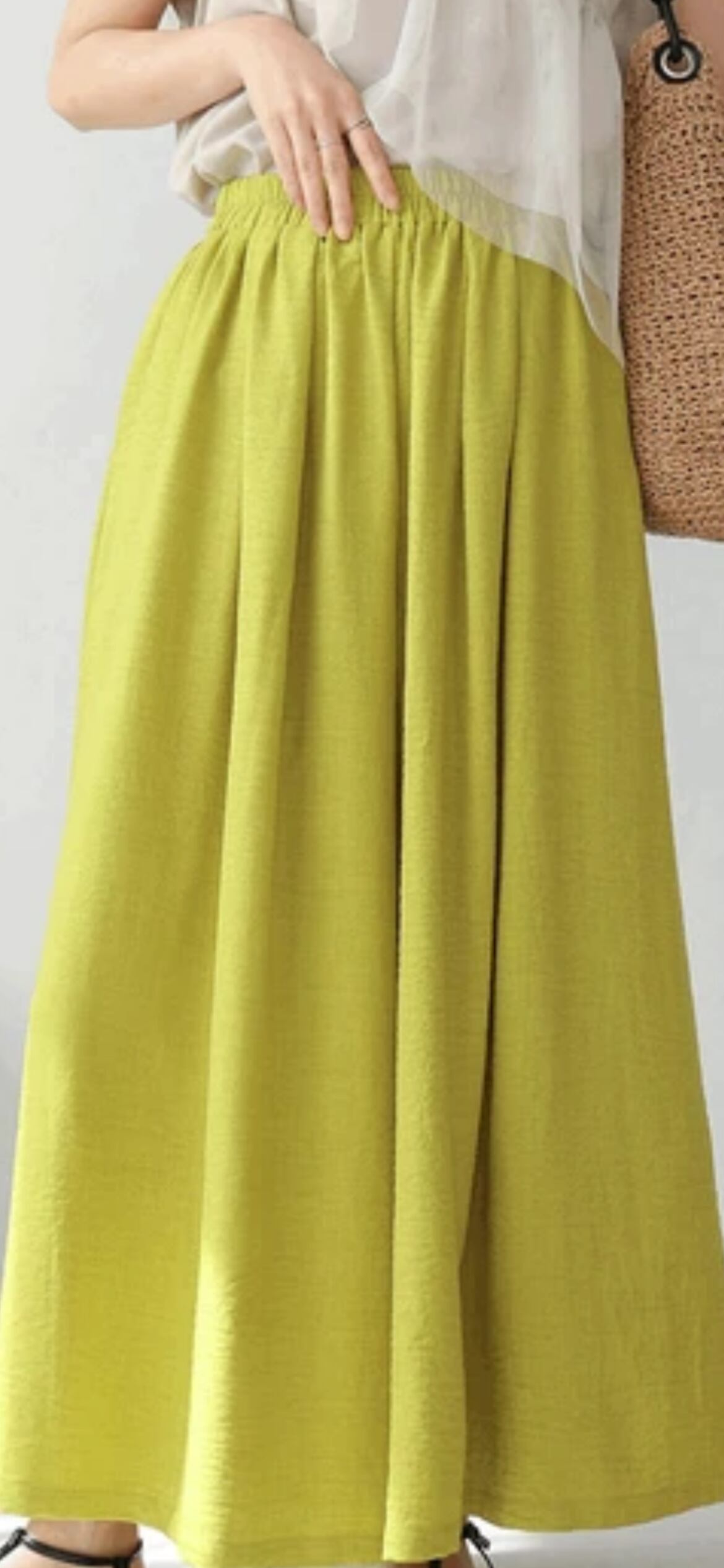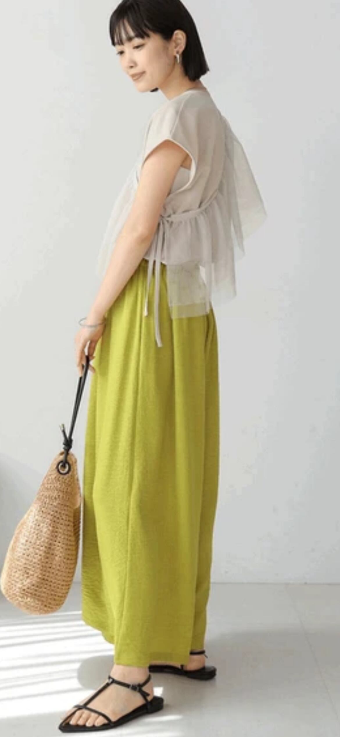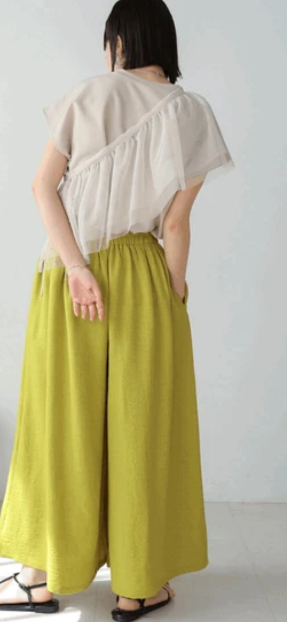ボディラインを拾いにくいゆったりとしたシルエットのパンツながら、切替で裾のボリュームがたっぷりとあるスカート見えするので女性らしい印象に。