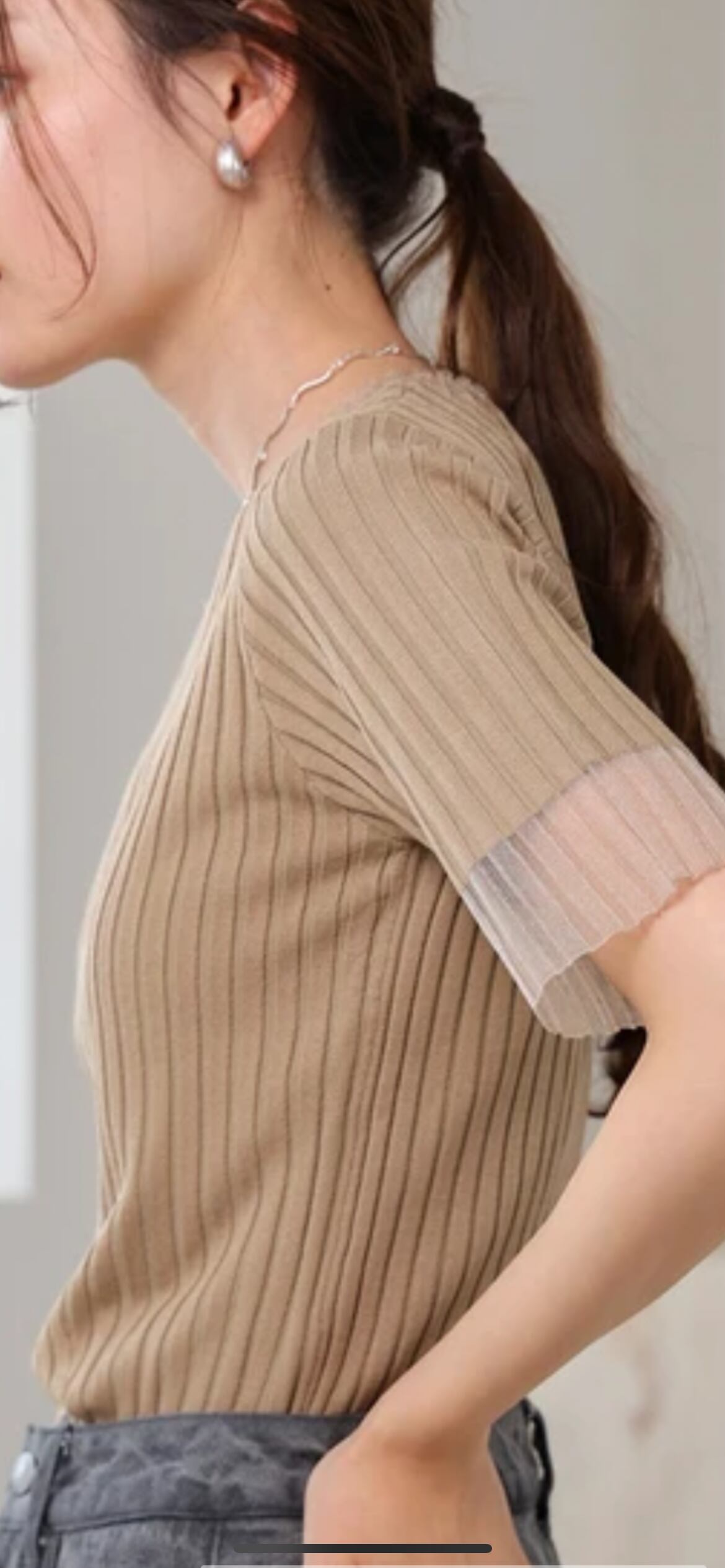 シアー使い5分袖リブニットトップス