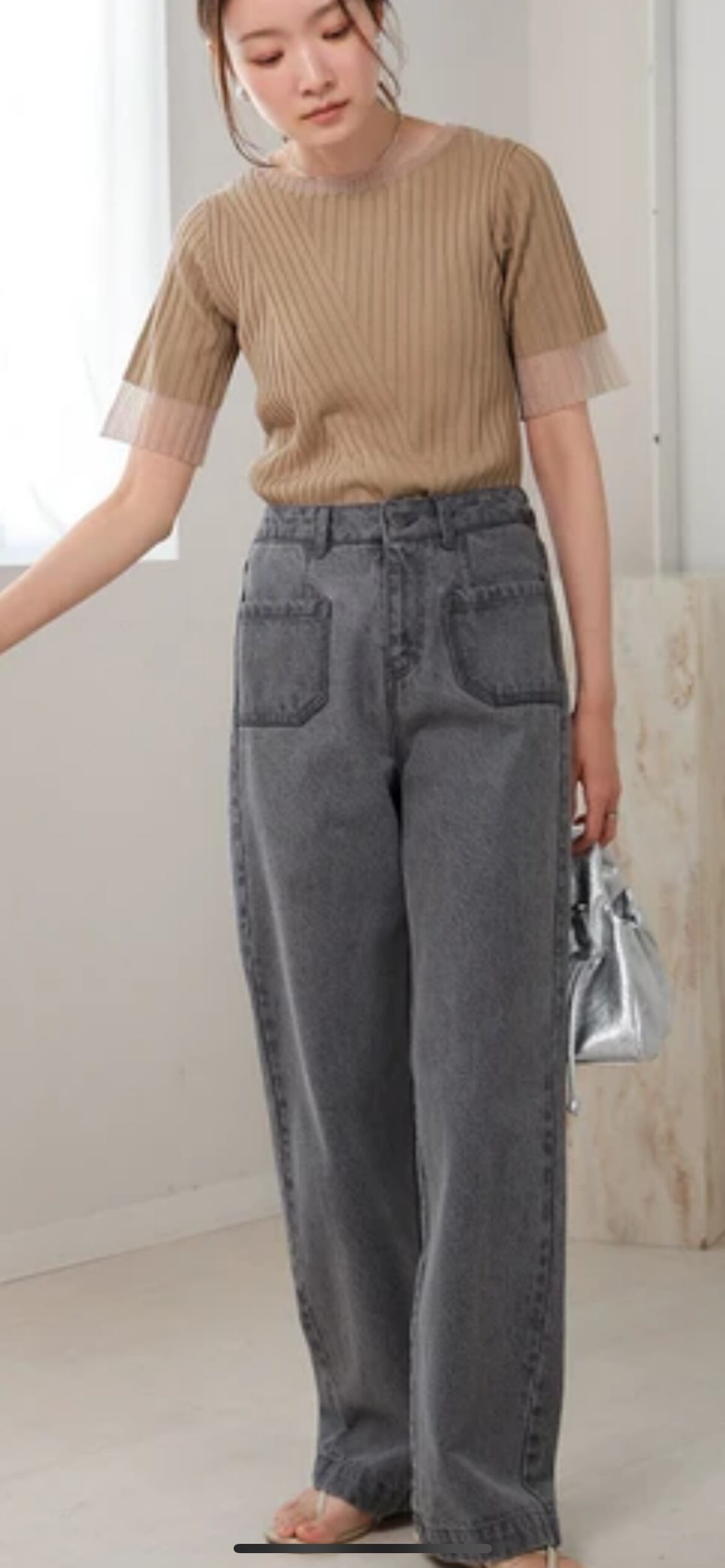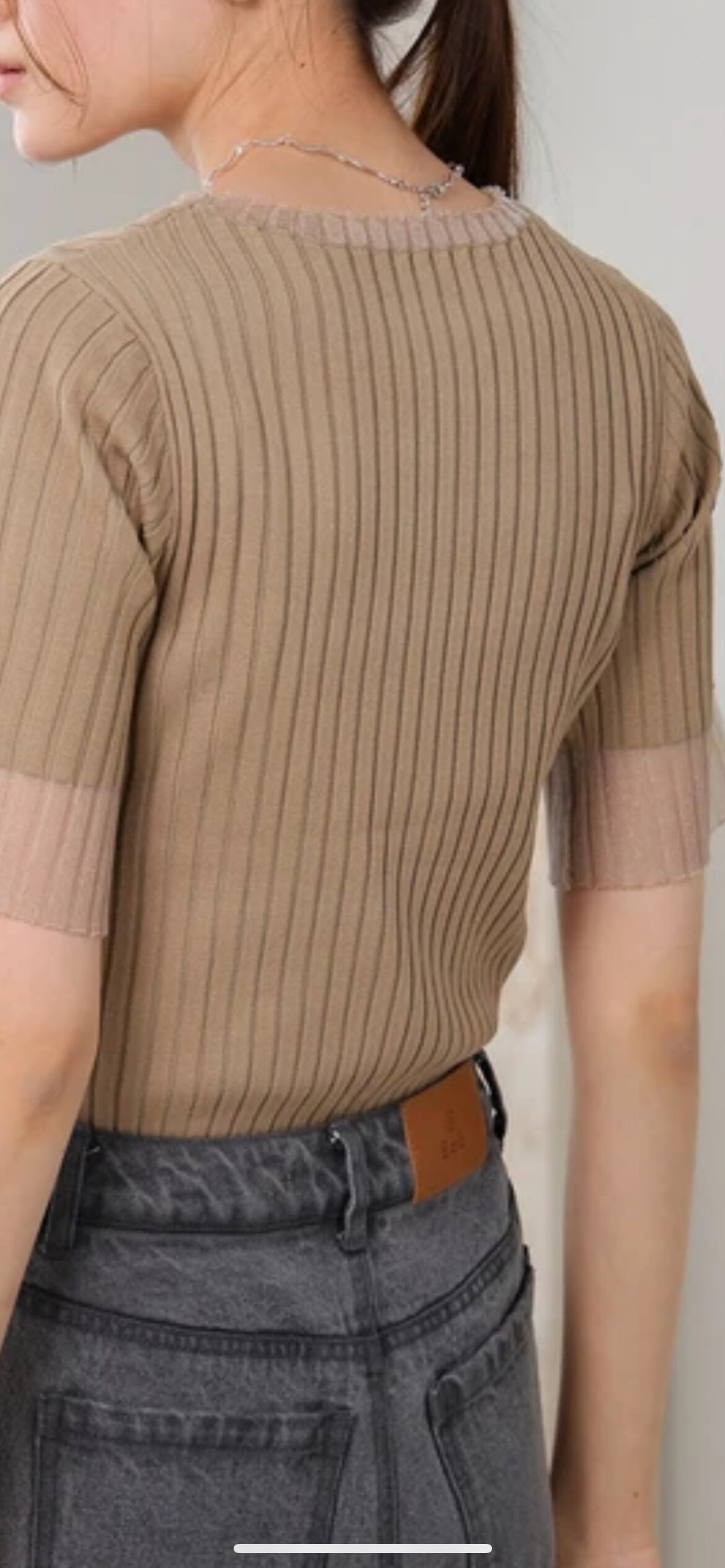 襟と袖のラメシアーが印象的なリブニットトップスです。ミニマルな見た目ながら体に沿いすぎないサイジングと、気になる二の腕をカバーする五分袖が上品さを誘います。インナーとしてレイヤードしてもごわつき感が無く、ランダムなリブ使いで1枚着でも着映えを叶えてくれる 春夏のワードローブに加えたい旬なアイテムです。