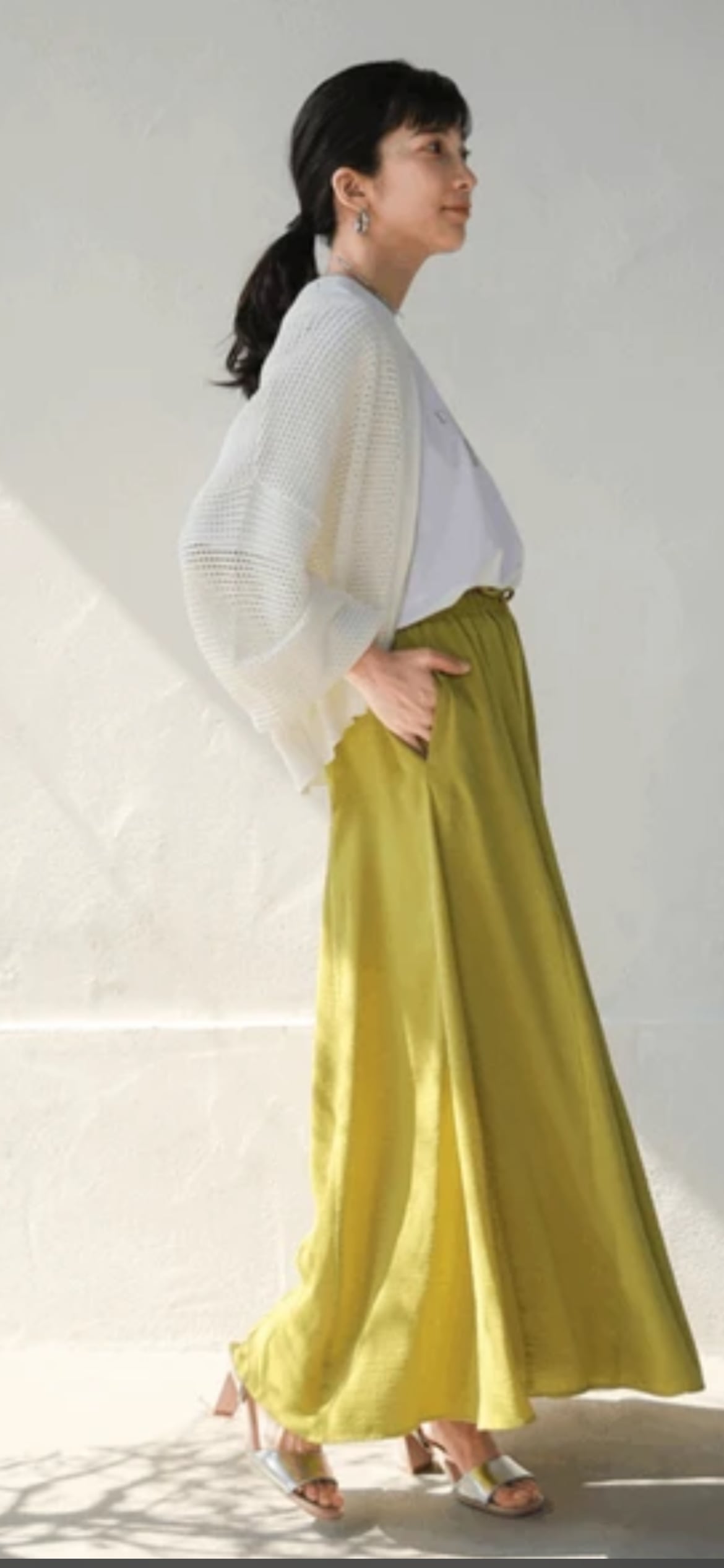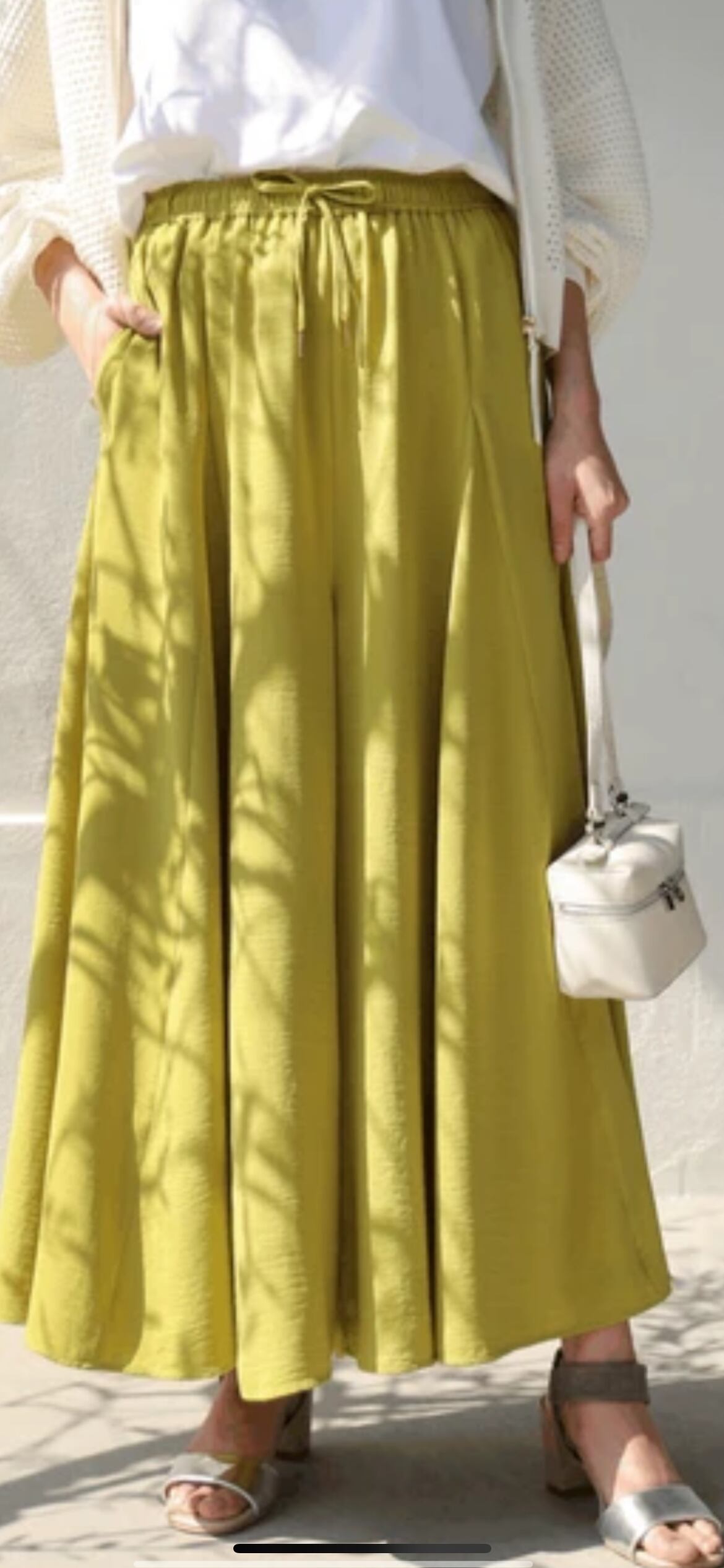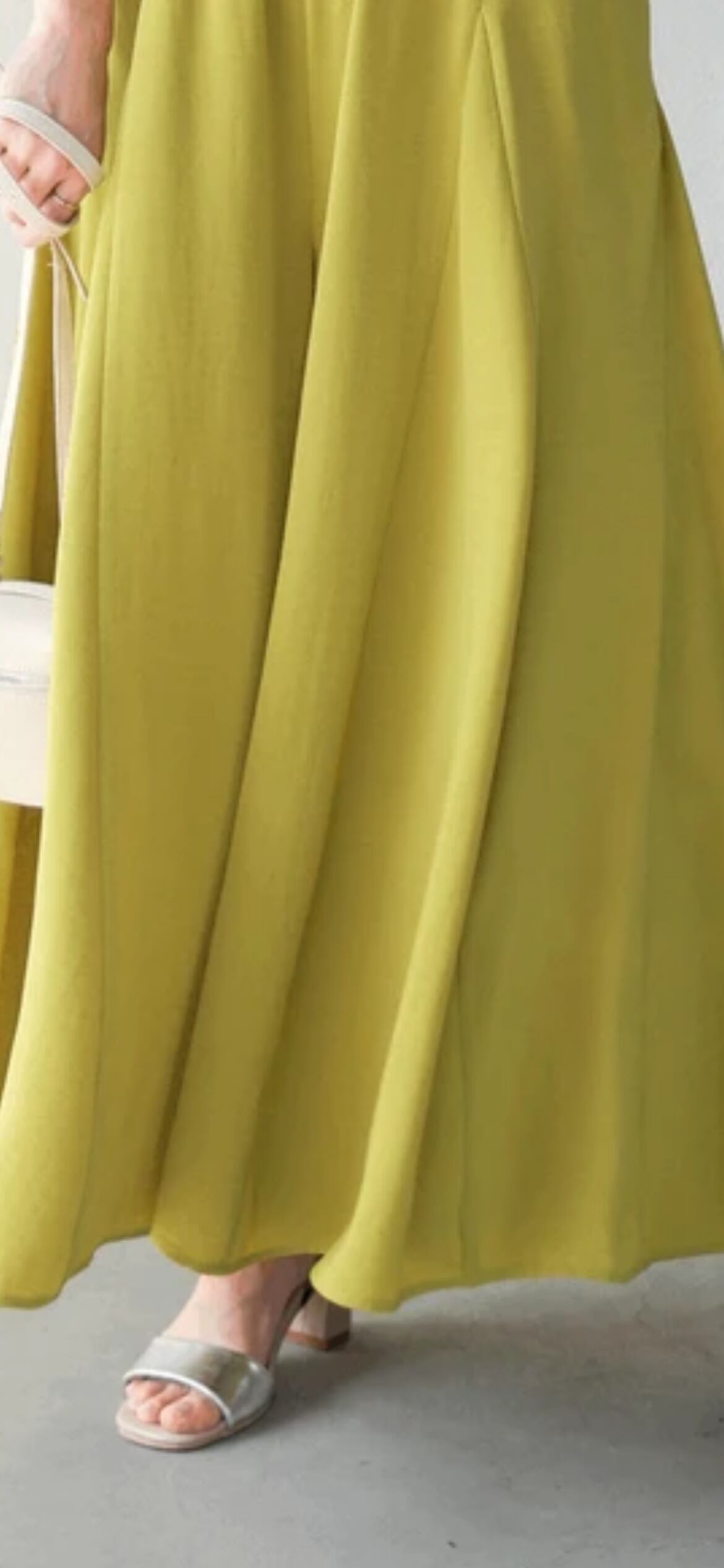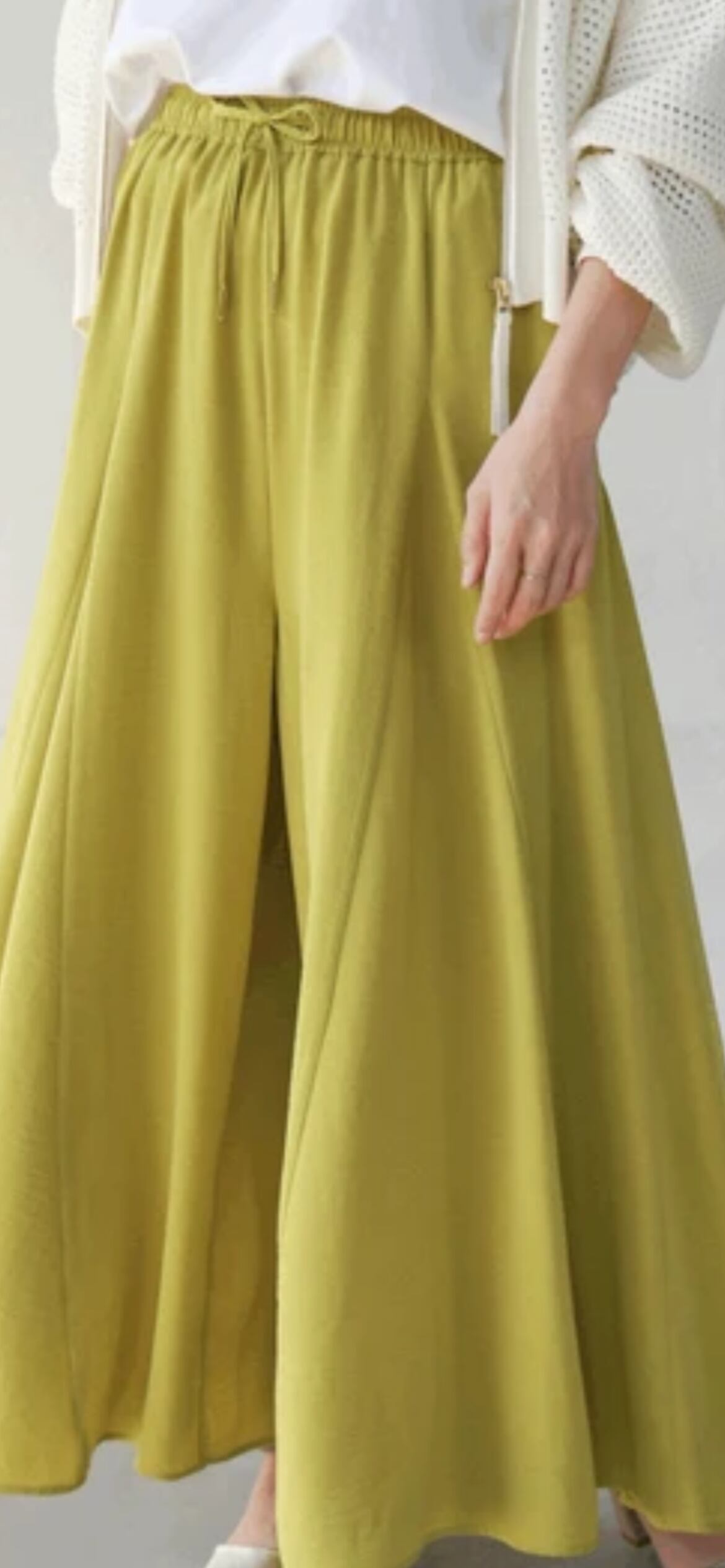ボディラインを拾いにくいゆったりとしたシルエットのパンツながら、切替で裾のボリュームがたっぷりとあるのでスカート見えして女性らしい印象に。