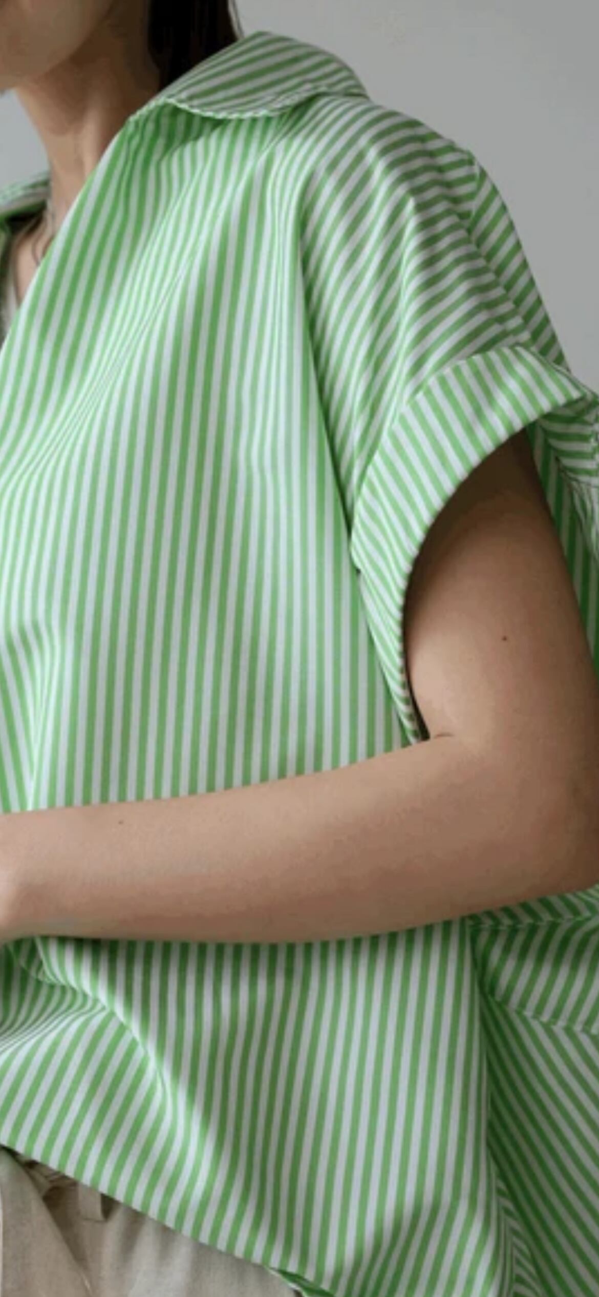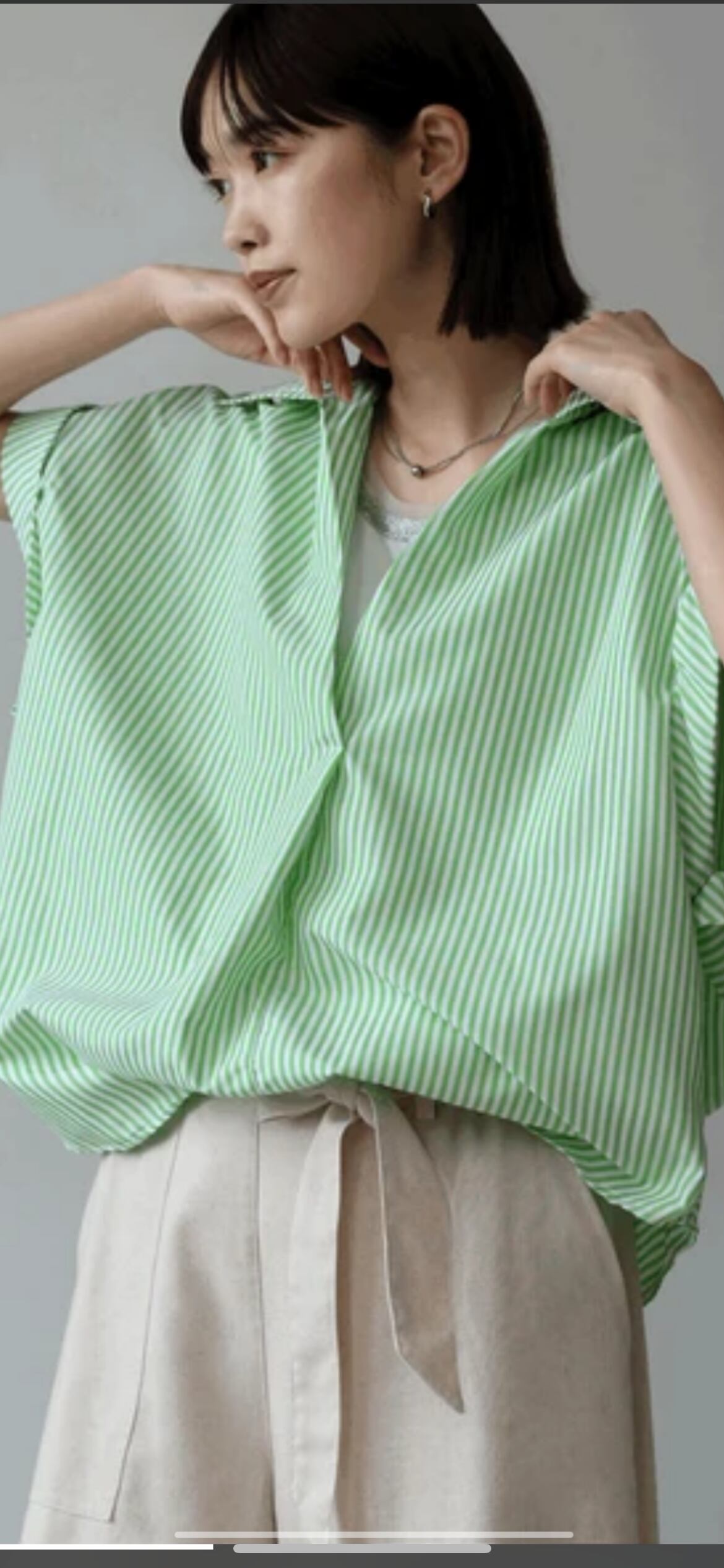 大きく開襟した襟元が小顔効果も抜群!