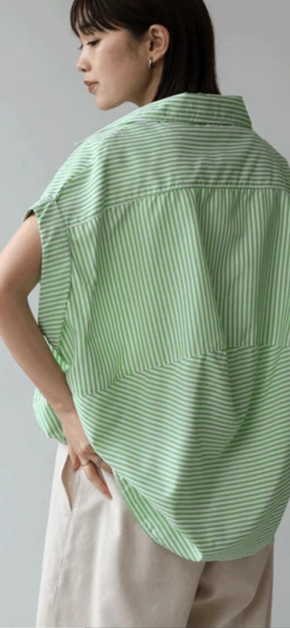 後ろ身頃はストライプ柄を縦と横でデザインし腰から裾に向かってコクーンシルエットにすることで、下半身をすっきりと見せてくれます。