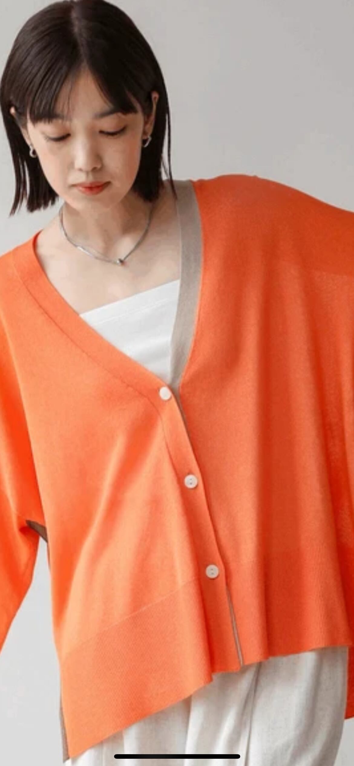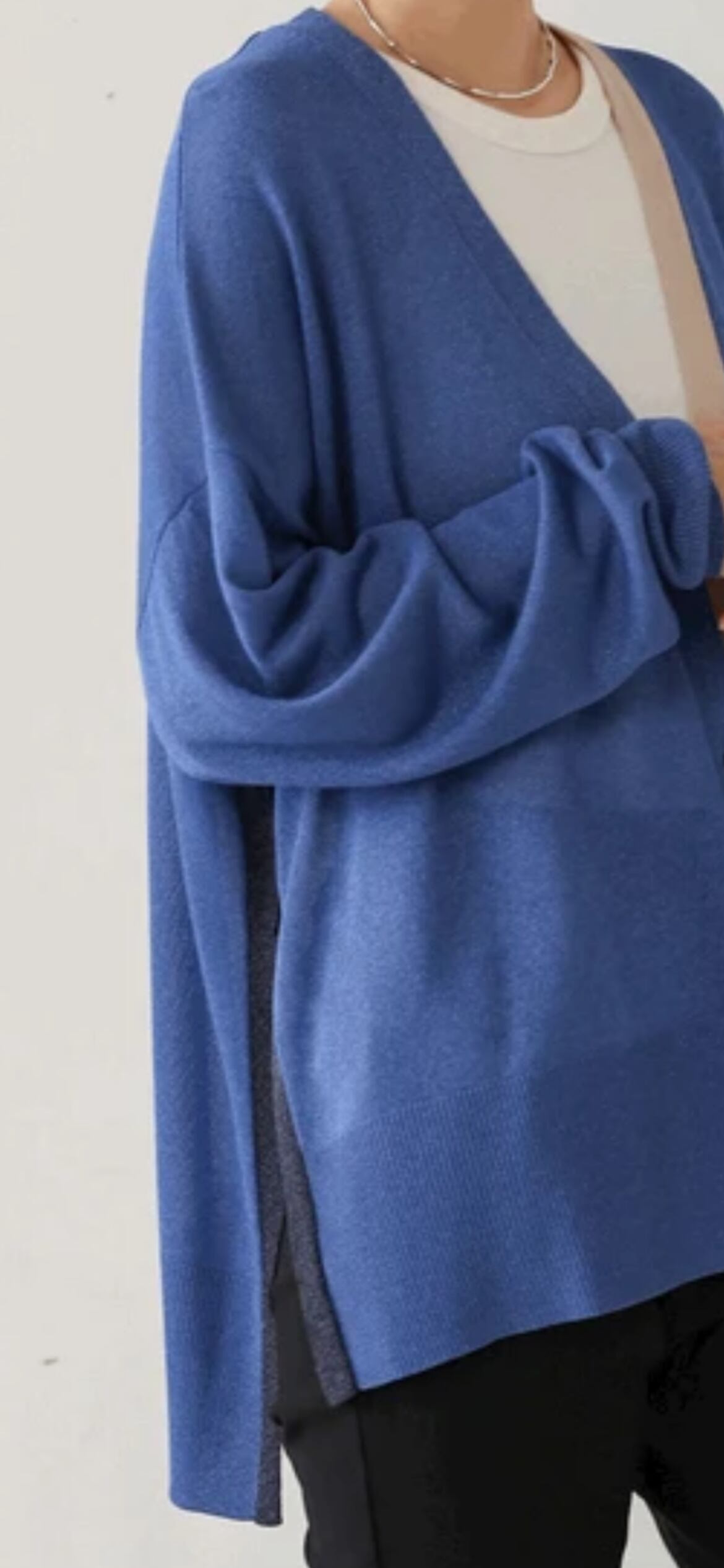 衿やスリットのみのポイント配色にすることで、コーディネートの色合わせも難しくなく、合わせやすい配色カーディガンに仕上げました。