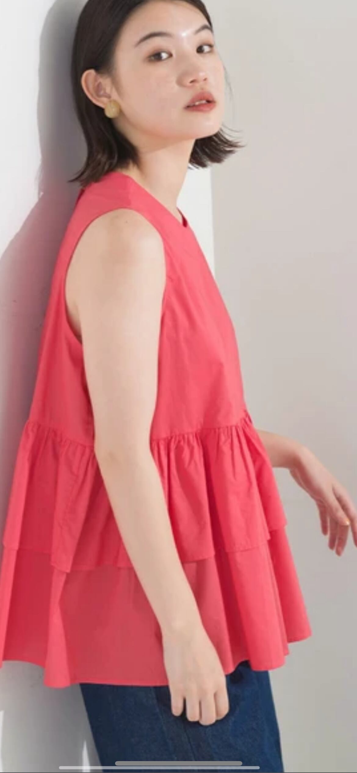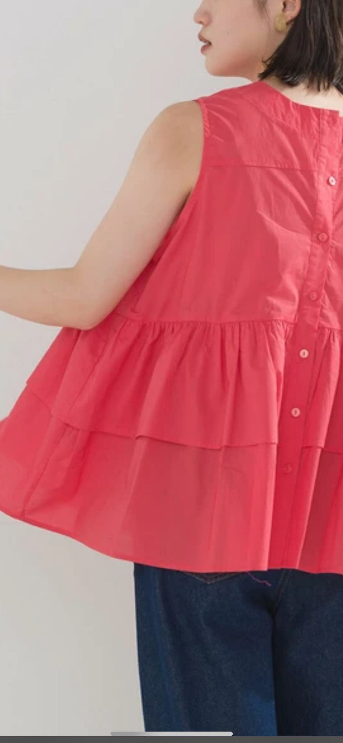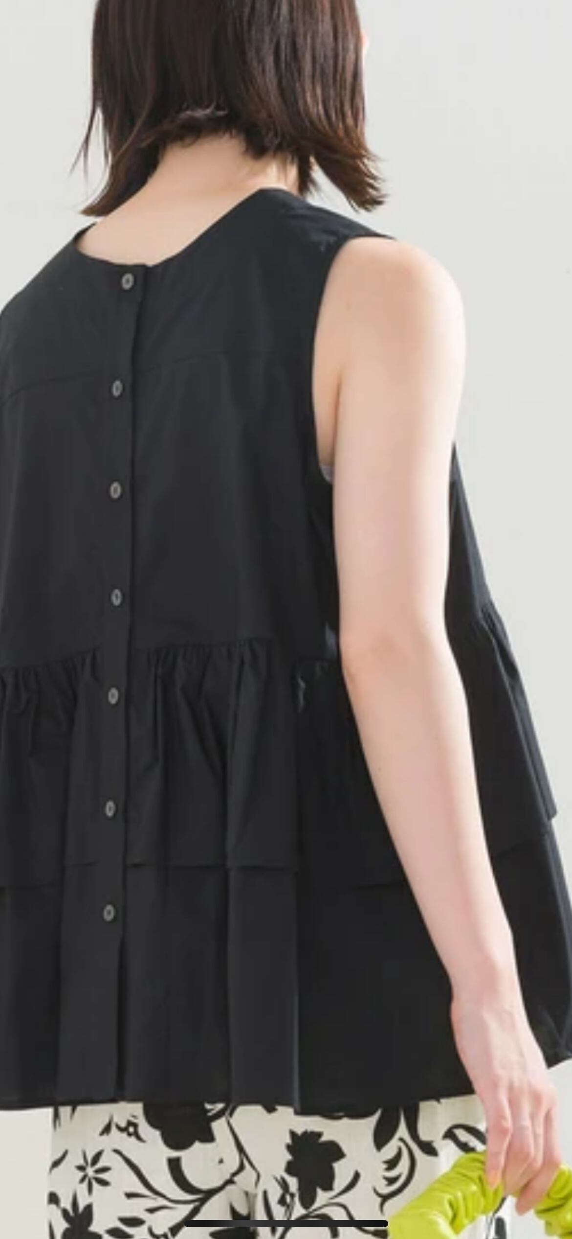 前後2WAYで使えるブラウス。ボタンを開けて羽織としてもご使用いただけます。ノースリーブのデザインですがアームホールを大きくしすぎず、ティアードの裾のボリュームで肩周りを細く華奢に見せてくれます。