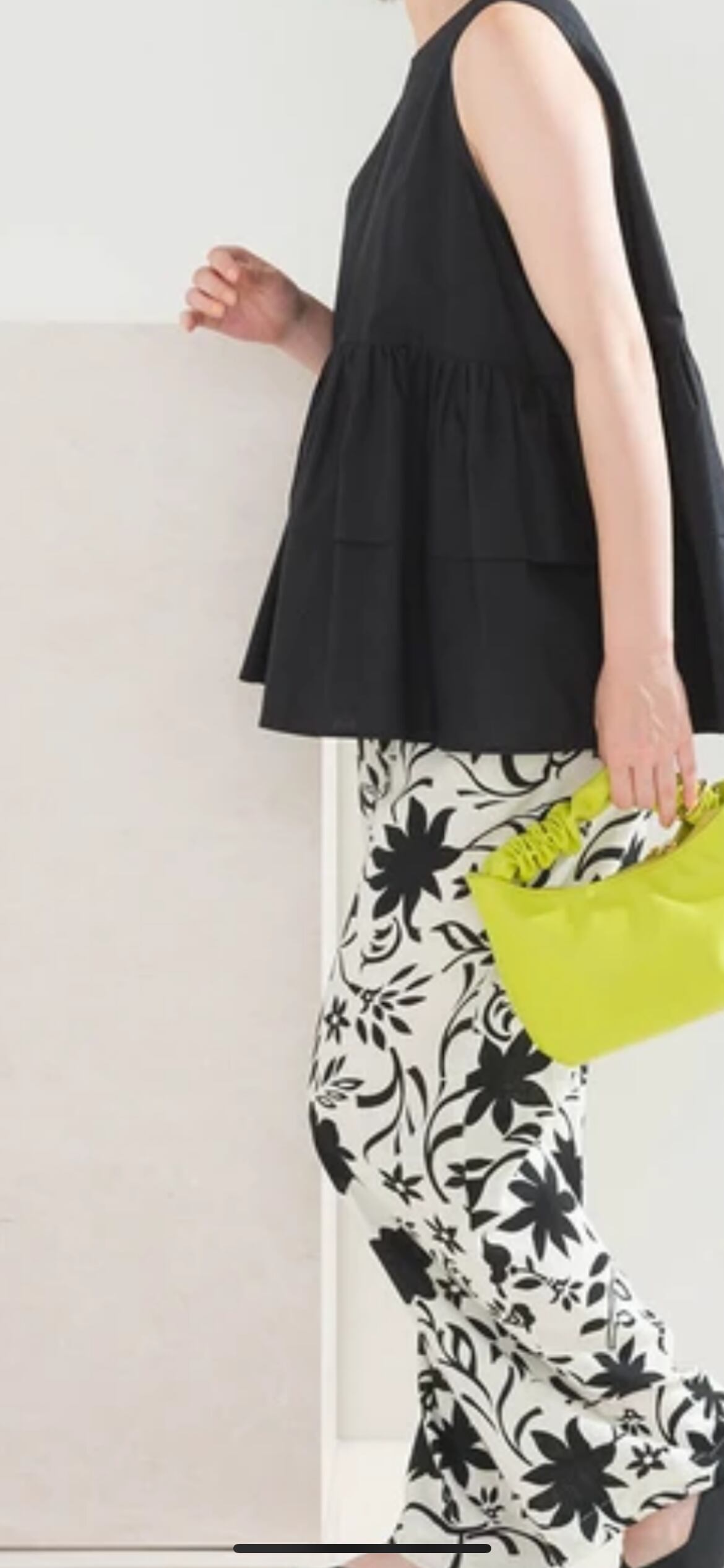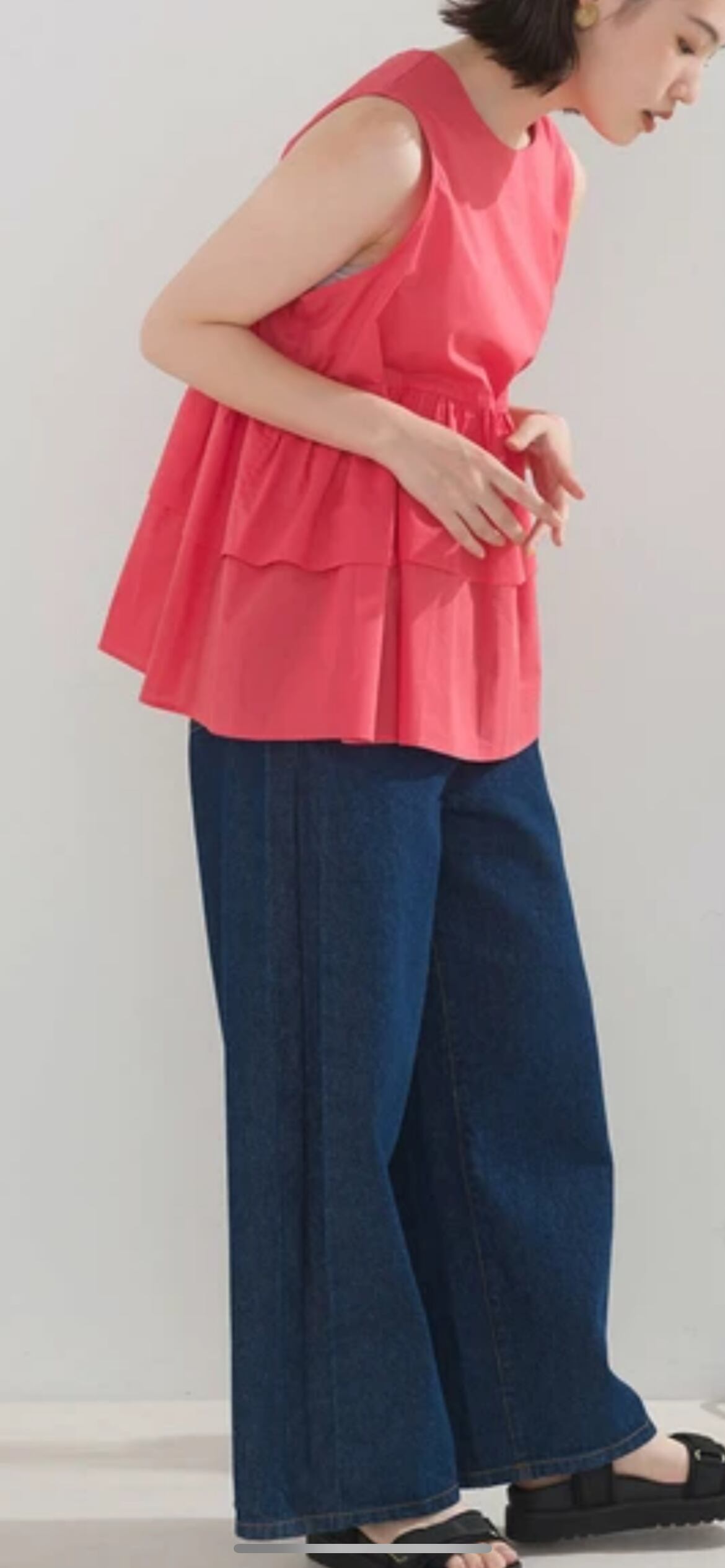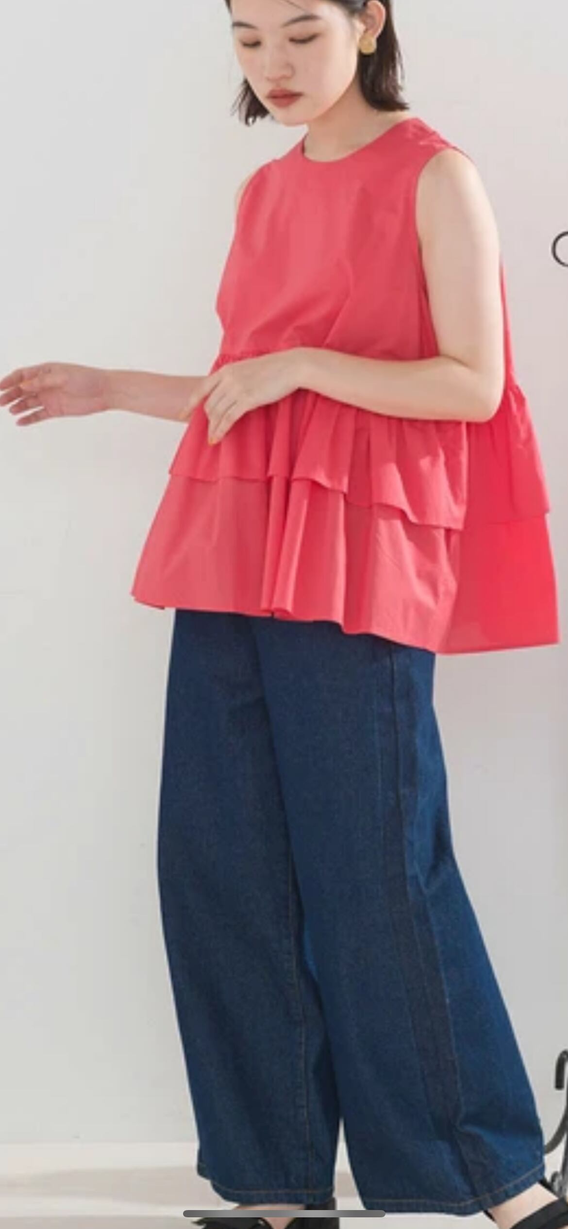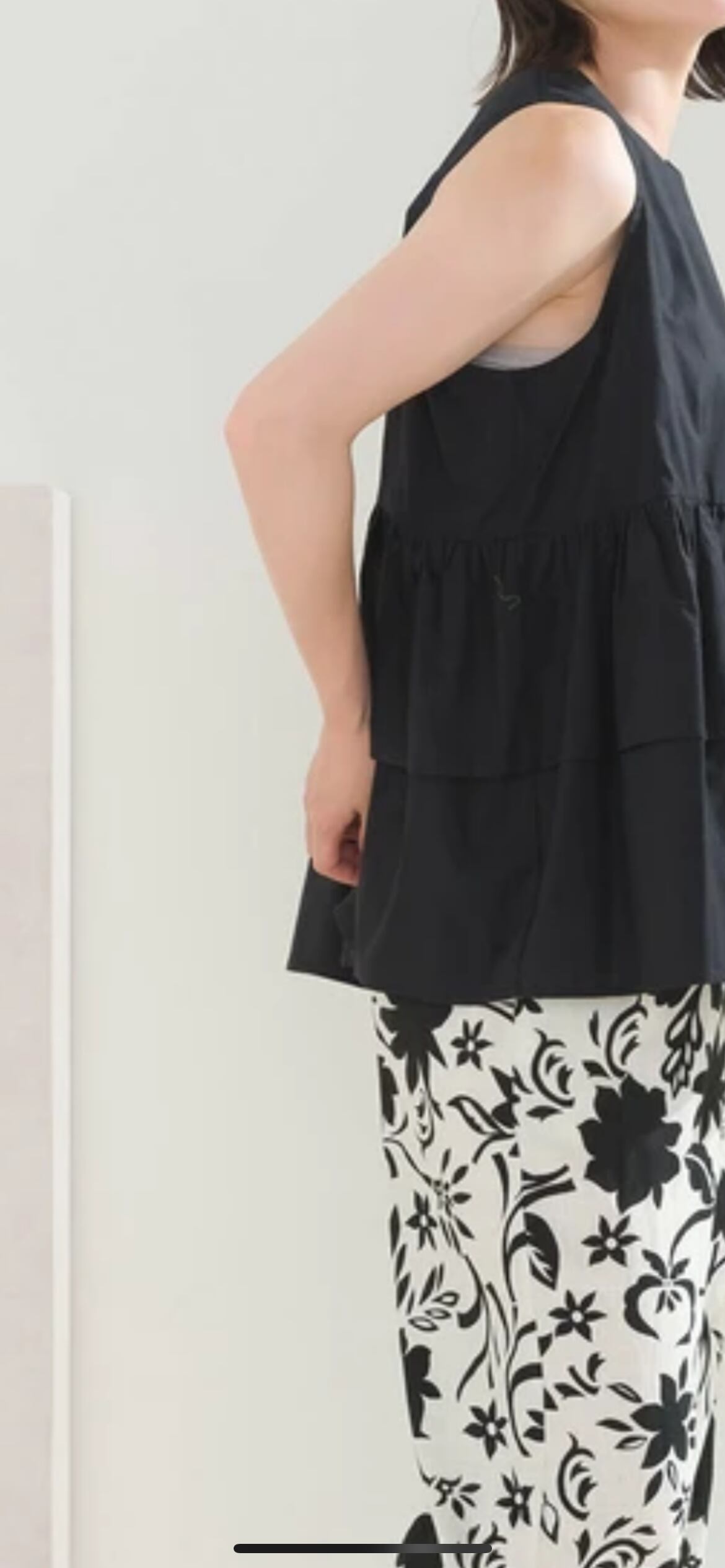 前後2WAYで使えるブラウス。ボタンを開けて羽織としてもご使用いただけます。ノースリーブのデザインですがアームホールを大きくしすぎず、ティアードの裾のボリュームで肩周りを細く華奢に見せてくれます。