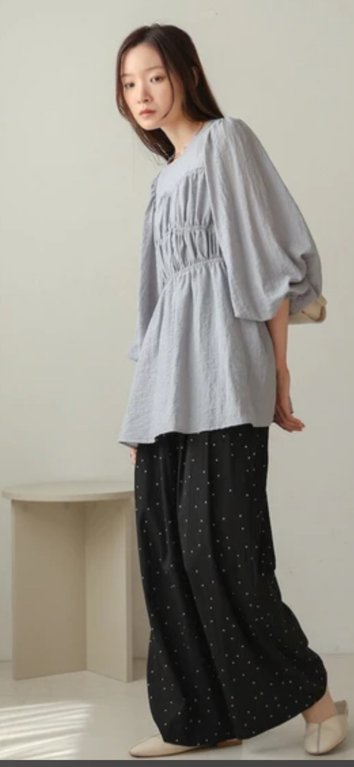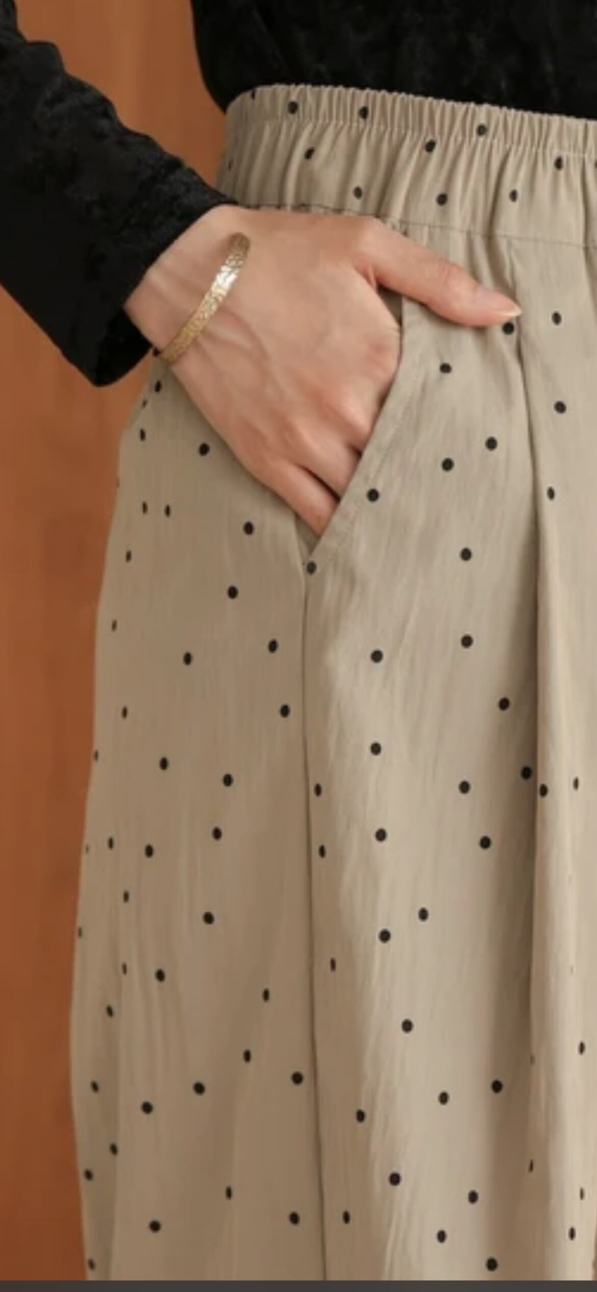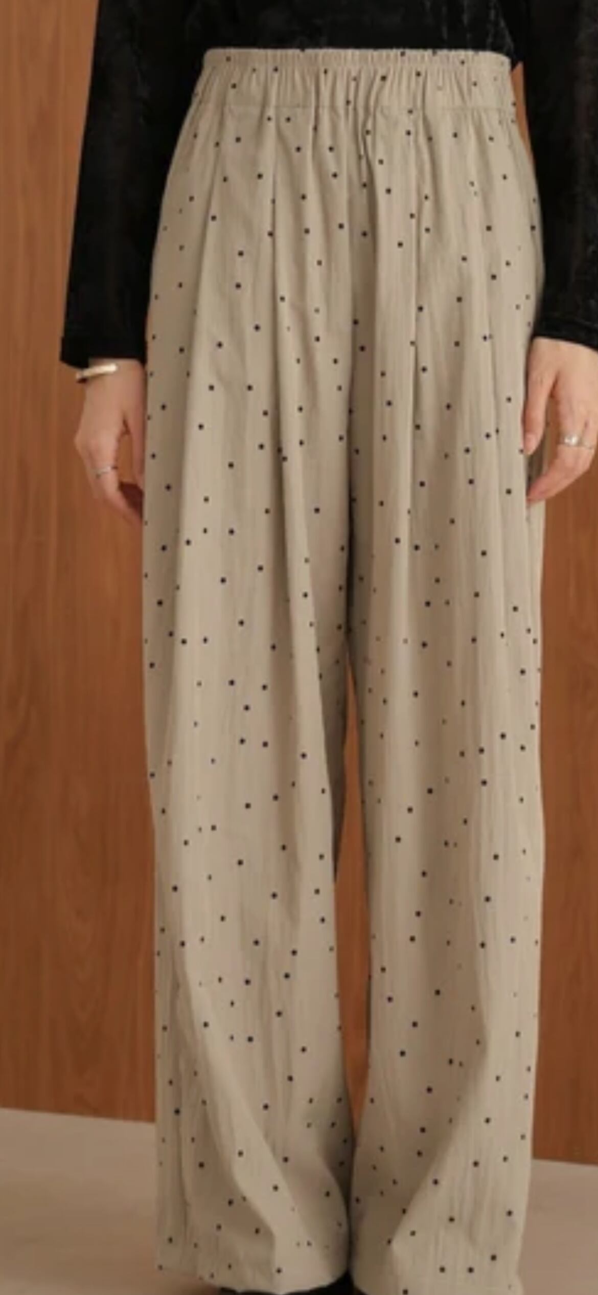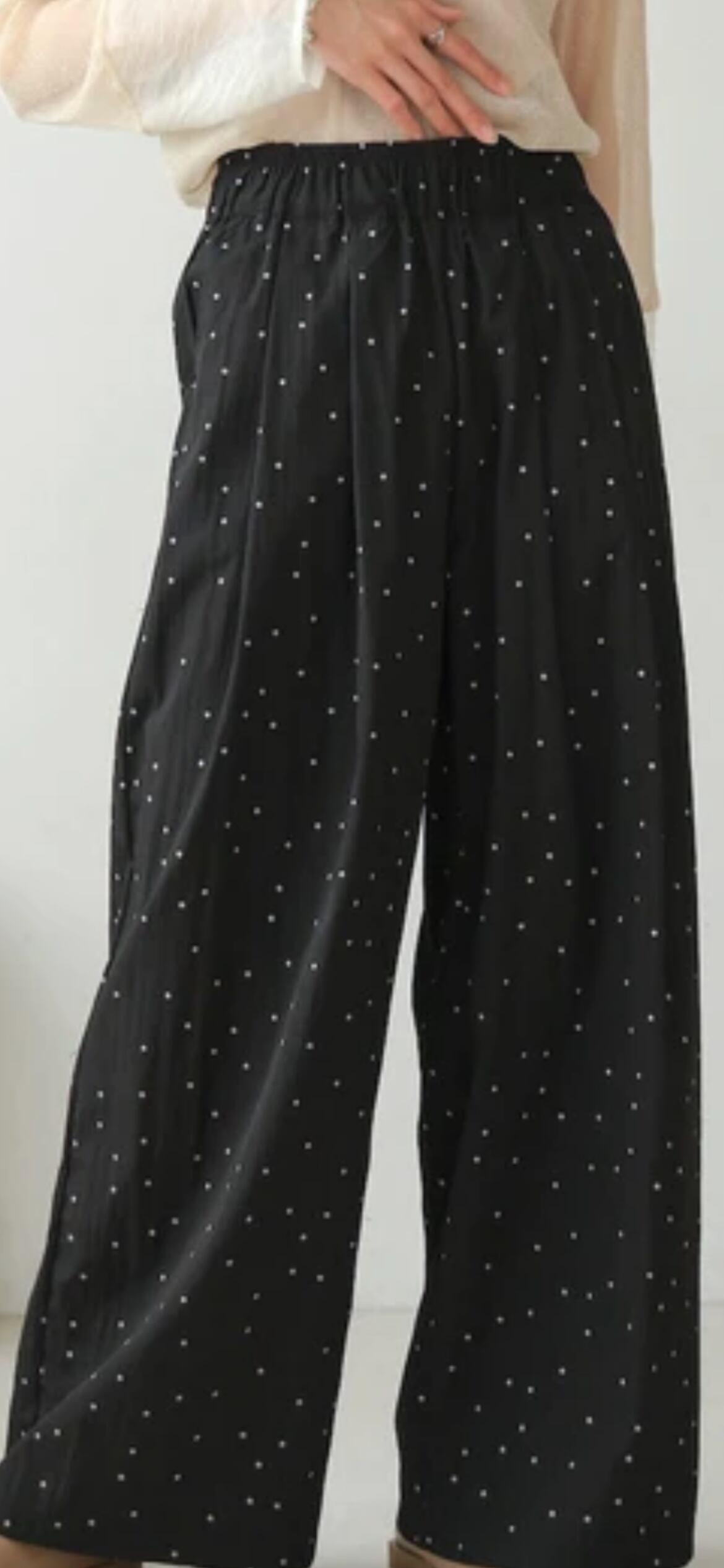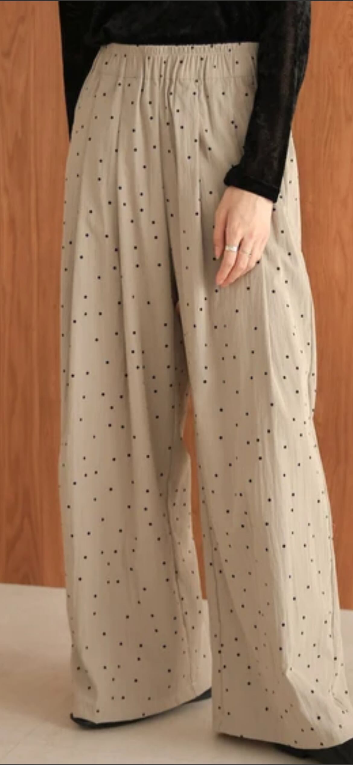 大人可愛い小さめドットのワイドパンツが登場です!総ゴムのイージーな穿き心地ながら、すっきり見えのダブルタックできれいめな雰囲気でもコーディネートしやすい1本になりました。余裕のあるシルエットで脚の形も響きにくく、深めのウエストで安心感も◎。両サイドには便利なポケットも配置されています。
