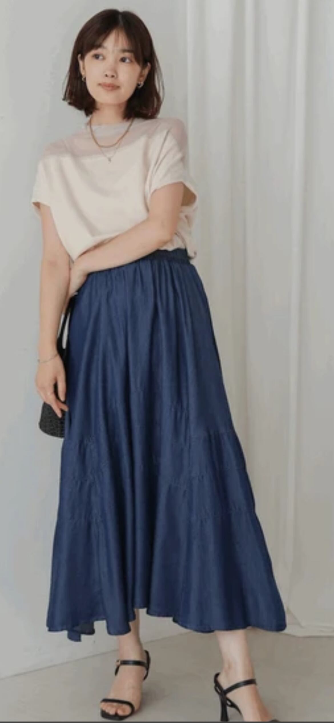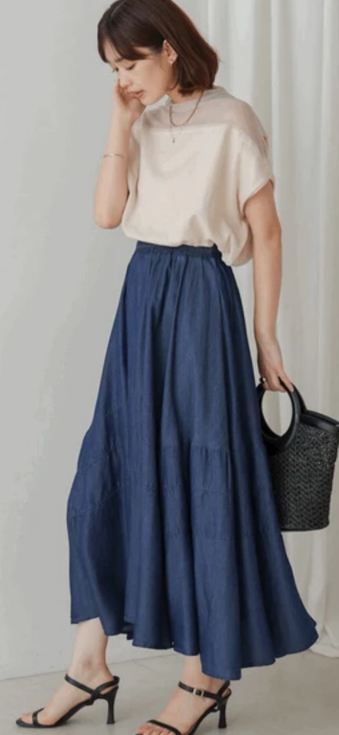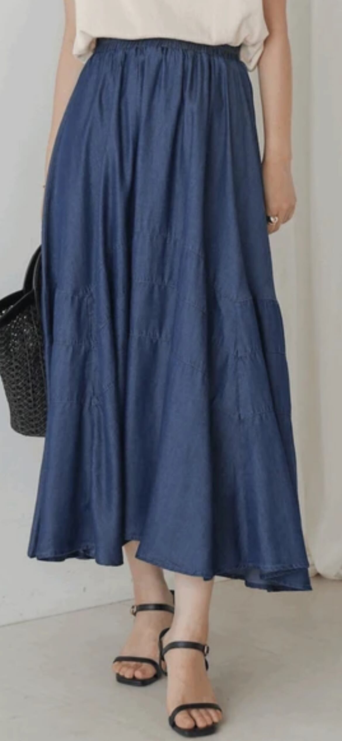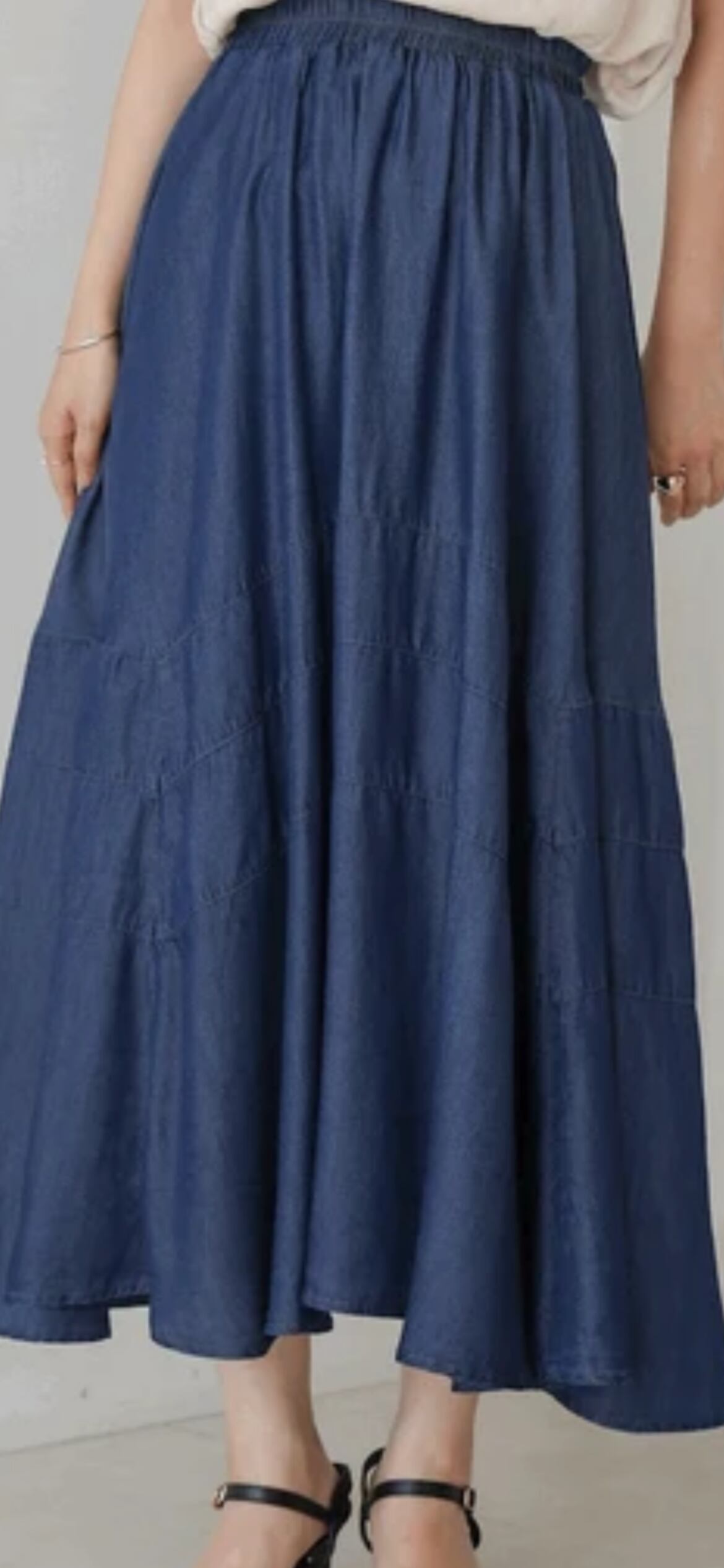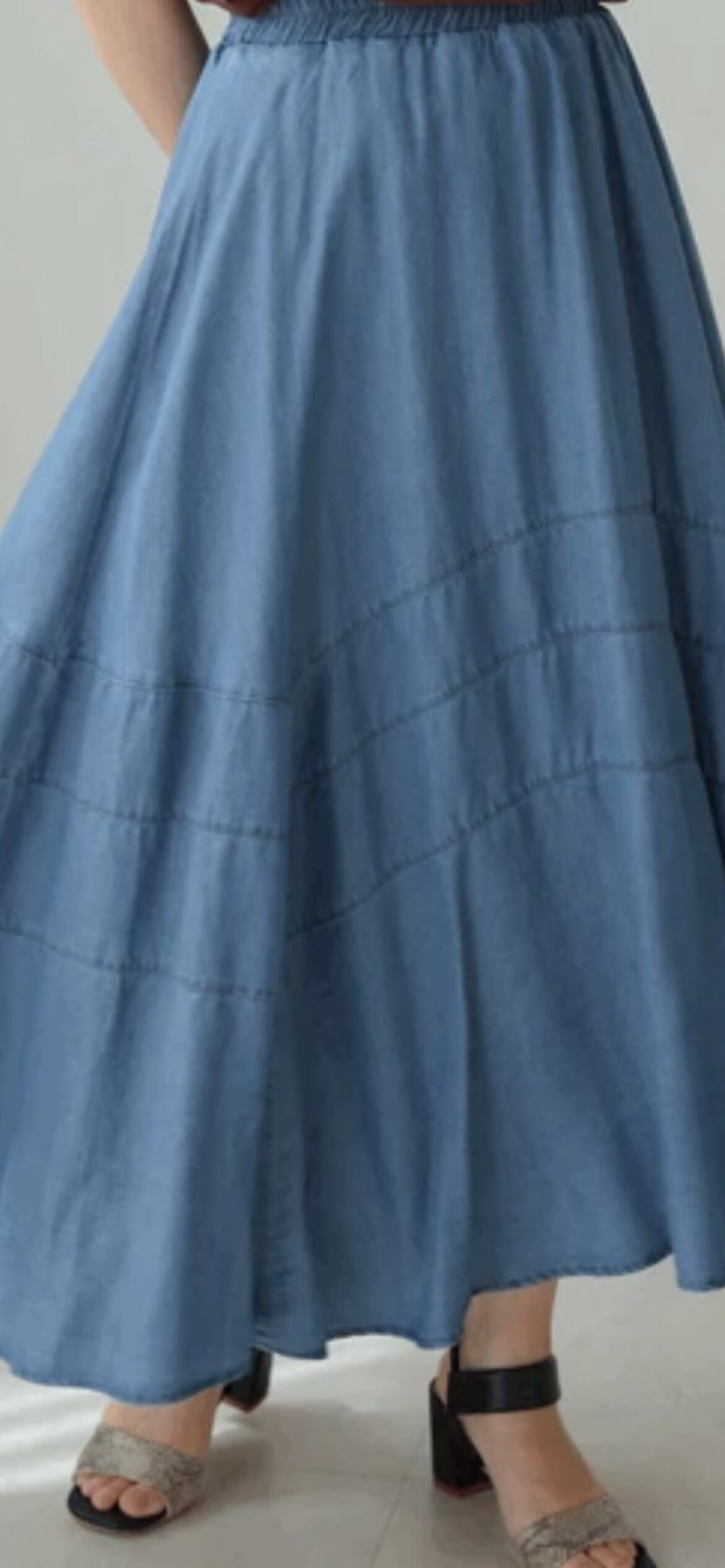 大胆に施された3本の切替ラインが目を引くフェミニンなデニムスカート。
