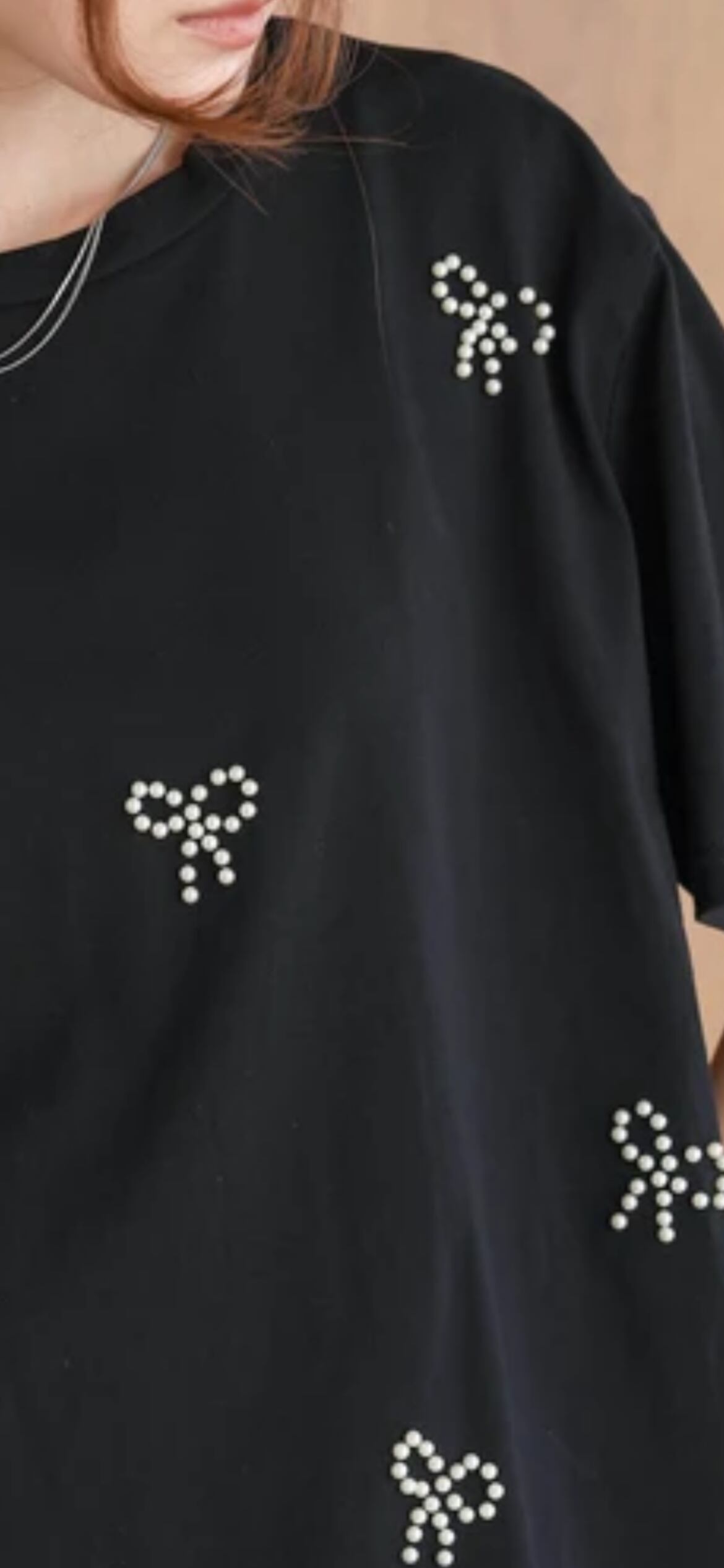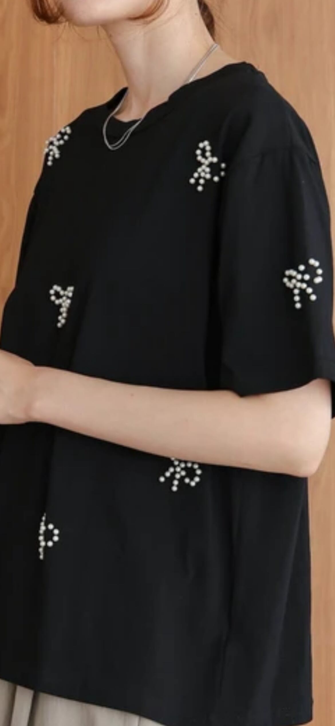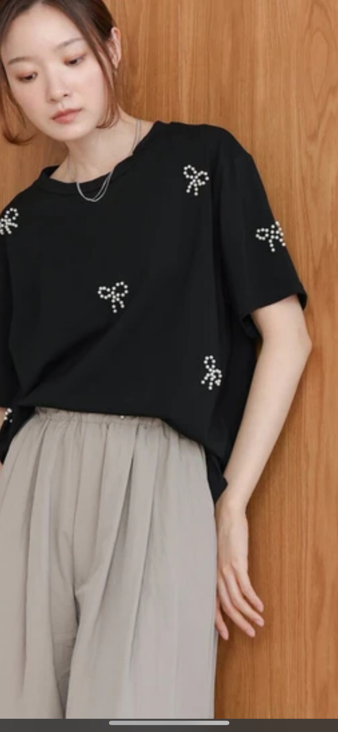 キュートなパールリボンモチーフがランダムにあしらわれたガーリーなTシャツ。ゆったりめのサイズ感でリラックスしたシルエットです。パールの大きさはプチサイズなので子供っぽくなり過ぎず、大人のカジュアルフェミニンにぴったり!いつものコーデにマンネリを感じた時、ワードローブから出したい1着です。