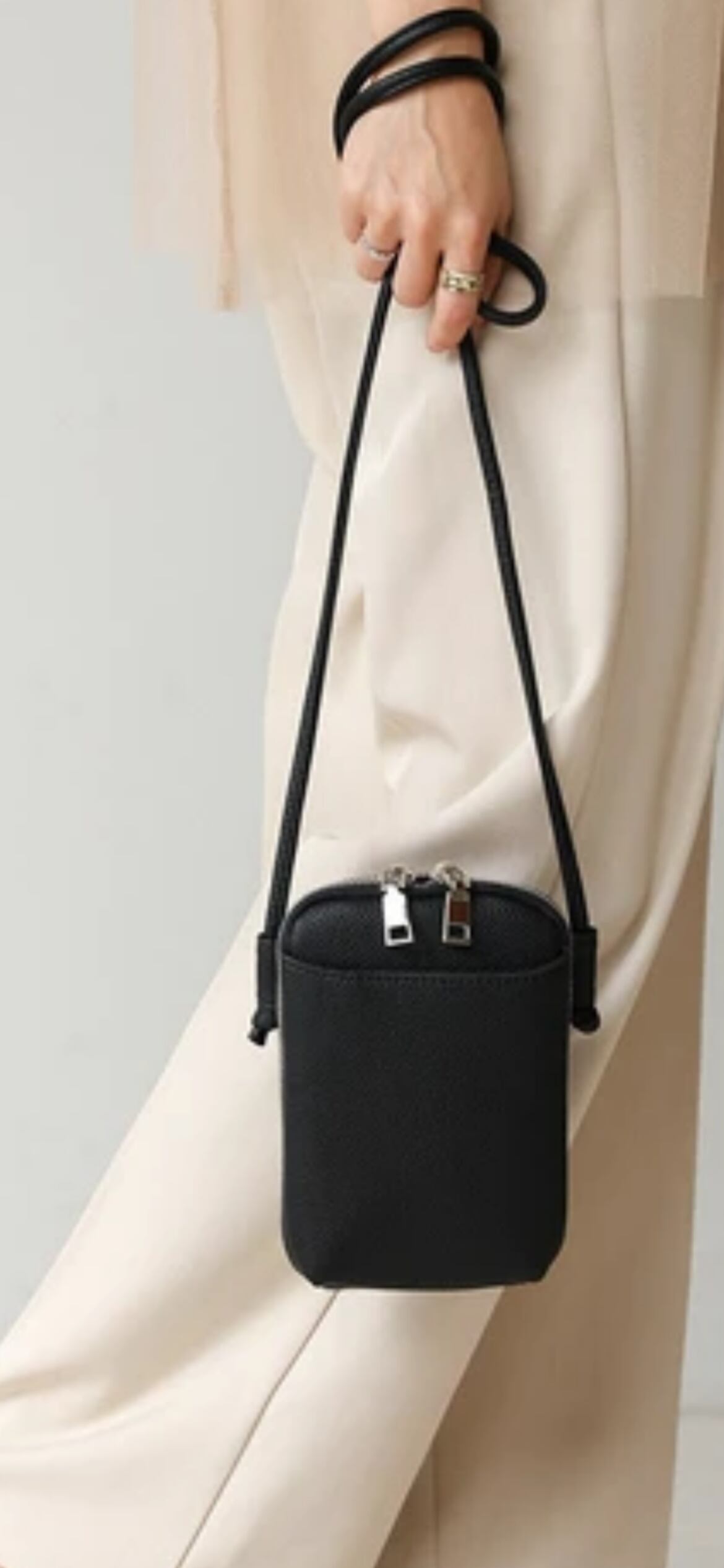 くたっと柔らかなミニウォレットバッグです。シュリンク加工を施したフェイクレザーは、本革顔負けのシボ感で高級感が漂います。ファスナーがコの字型にがばっと開くので中身が見やすく取り出しやすいのも魅力的。中の仕切りにもファスナーが付き収納可能になっているので、ごちゃつかずすっきりと整頓できます。あると便利な外ポケットはスマホがすっぽり入る大きさです。見た目よりも大容量で、ワンマイルからサブ使いまでヘビーユーズ間違いなしのアイテムです。