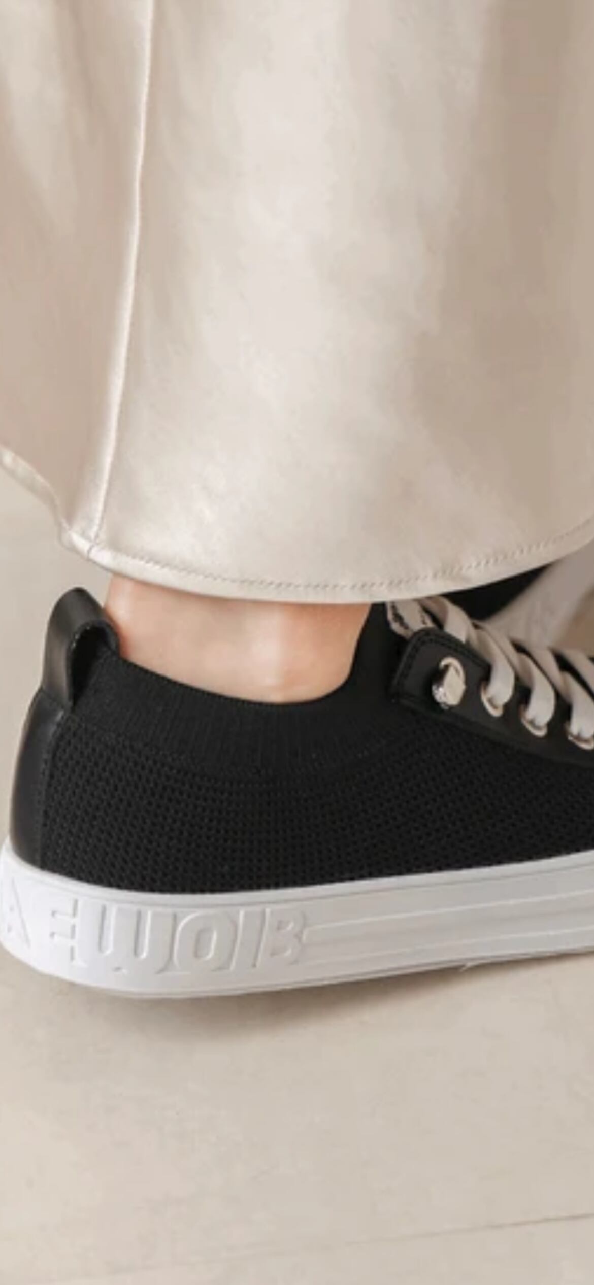 アッパーには収縮のあるニット素材を紐部分はゴムを使用。