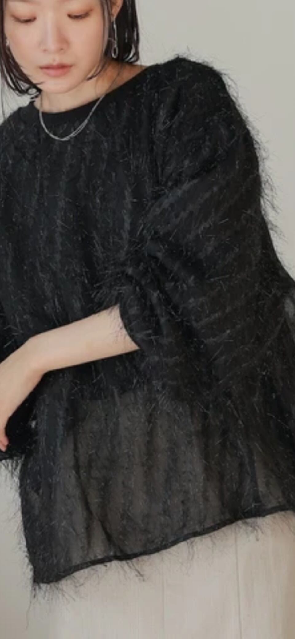 シンプルなスウェットトップスに、毛足の長い繊細なラメ入りシャギーをあしらって パッと目を引く華やかな1枚に仕上がりました!本体とシフォン部分は衿ぐりと袖口で繋がっており、空気を含んだようなエアリーな印象です。スウェットとシフォン部分のレングスに差をつけ、裾にシアー感を持たせることにより抜け感を演出しました。ゆったりめのサイジングでざっくりお召し頂け、ボディラインに響かないシルエットも好印象です。