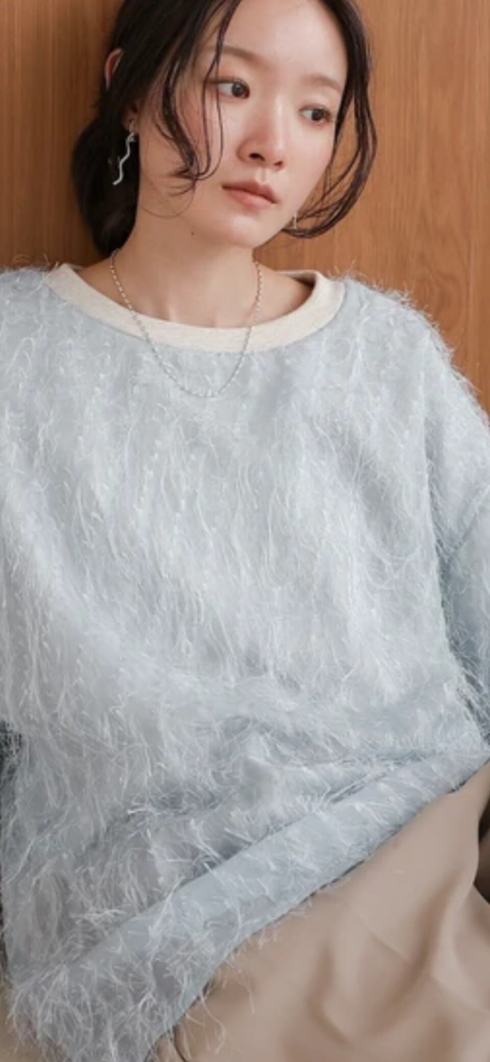 本体は中肉の裏毛スウェットでノンストレスでお召し頂ける生地感です。シフォン部分は繊細なシャギーが全体的にあしらわれており、さらっとした質感です。