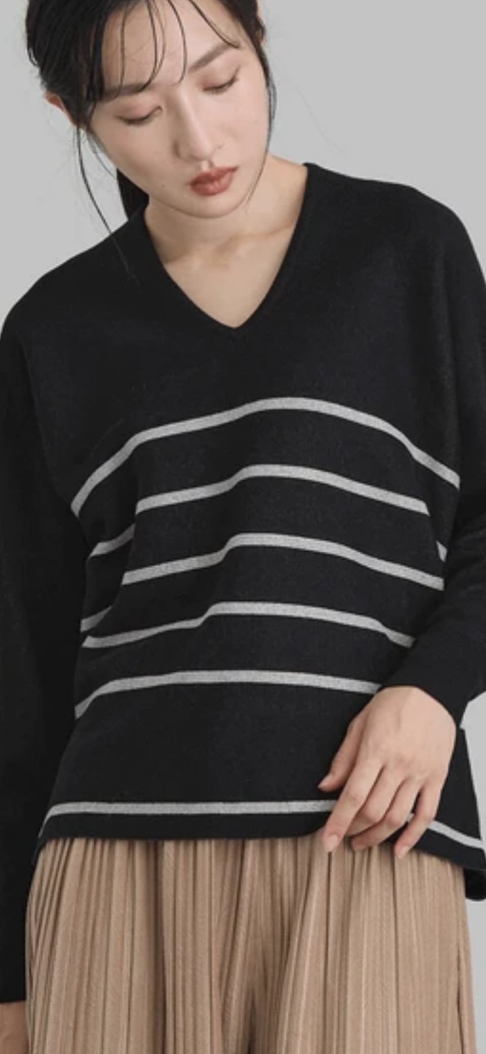 Vネックがお顔周りをスッキリと見せてくれます。