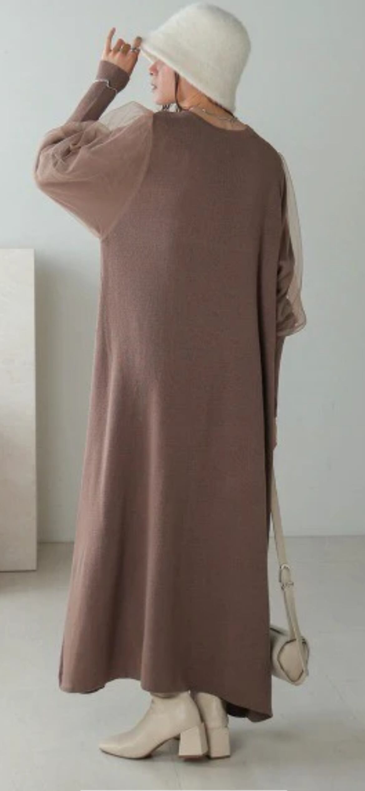 着映えするデザインなので、さっと1枚着るだけでお出掛けが出来るワンピースです。コンパクトな衿ぐりが品の良さを演出します。袖のチュールも柔らかく、アウターを羽織ってもゴワゴワしない着心地です。