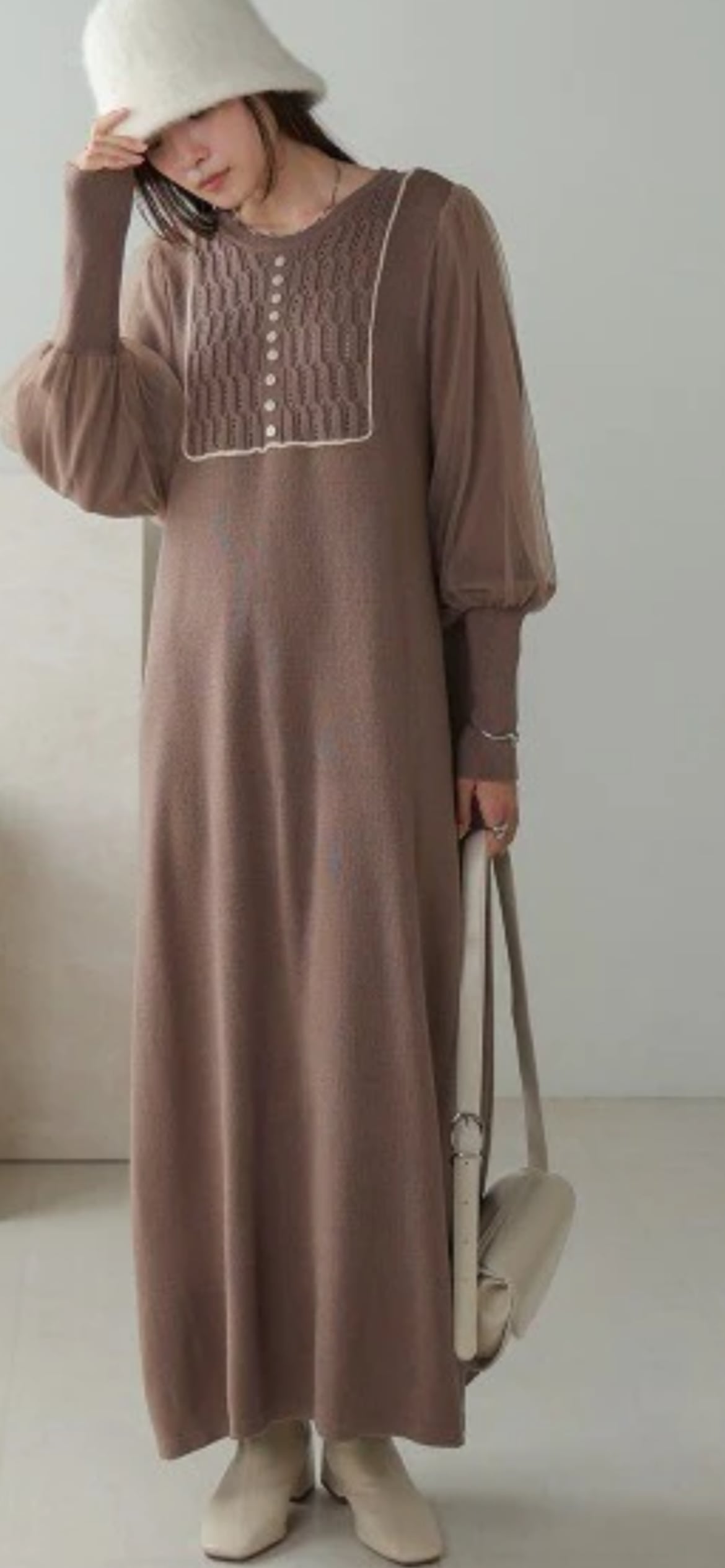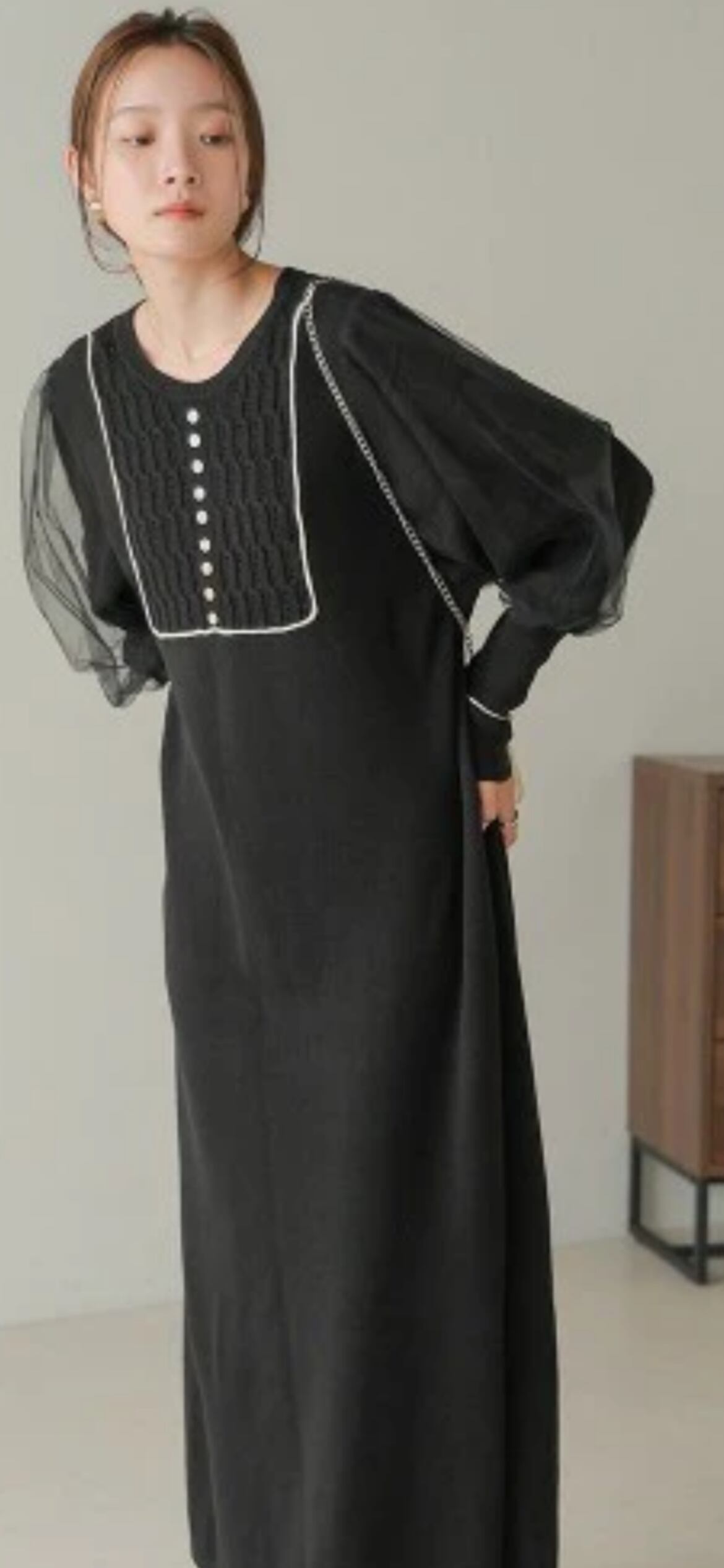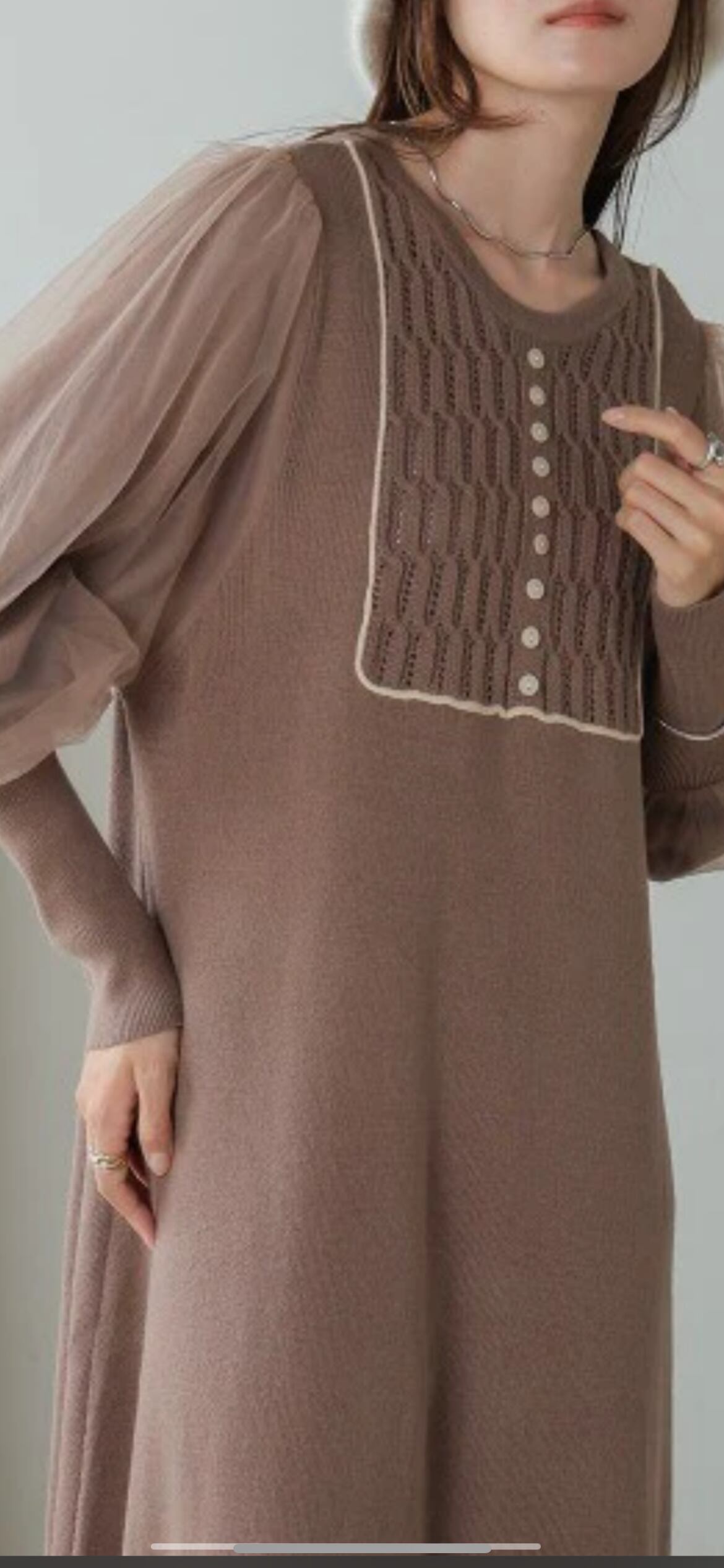 袖のふわりとしたシアーチュールが今年らしい1枚着のニットワンピースです。配色ラインに縁どられたフロントのクラシカルなデザインが、顔周りを華やかにします。チュール部分のバルーン袖と長めの袖リブで華奢見えし、見ごろに切り替えが無くすとんとしたデザインで体型カバーが叶います。デイリー使いしやすいシンプルな型ながら、女性らしいディティールデザインが魅力的な1枚です。