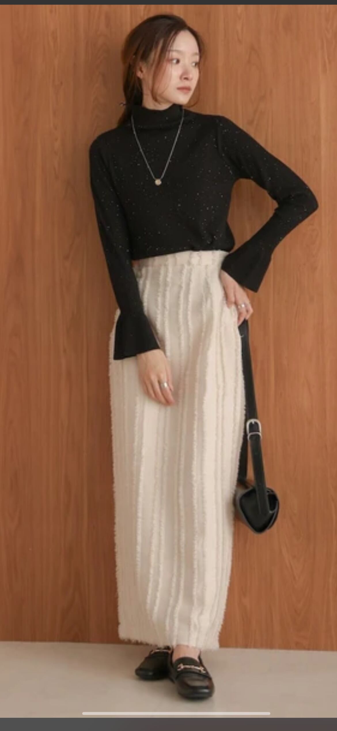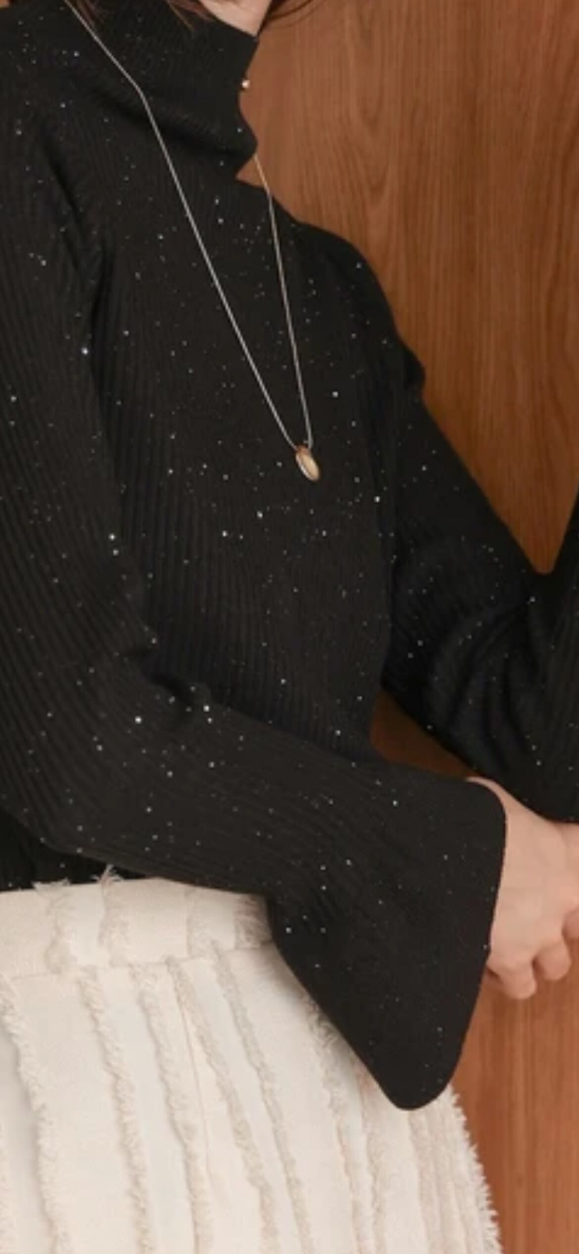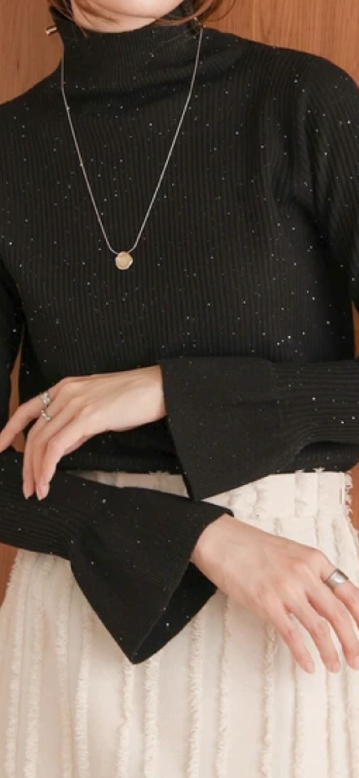 気分の上がるキラキラリブニットで、秋冬の着こなしに欠かせないハイネックトップスが登場!極小スパンコールが散りばめられているので 動くたびに華やかな印象にしてくれます。しっかりと襟が立つ適度なハイネックは知的なムードで、袖口のフレアシルエットも目を惹くポイントに。ボディラインを強調しすぎないサイジングはインナーにはもちろん トップスとしても幅広く活躍してくれます。