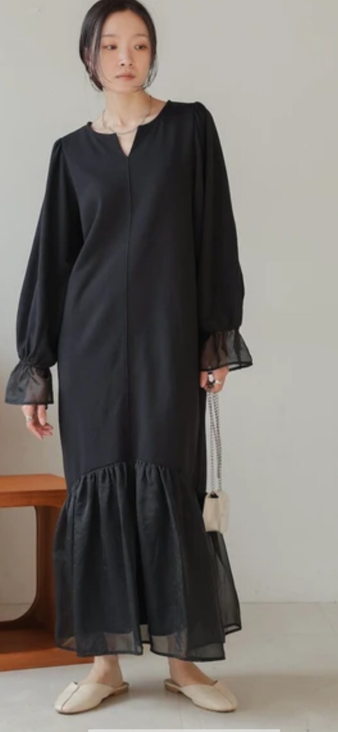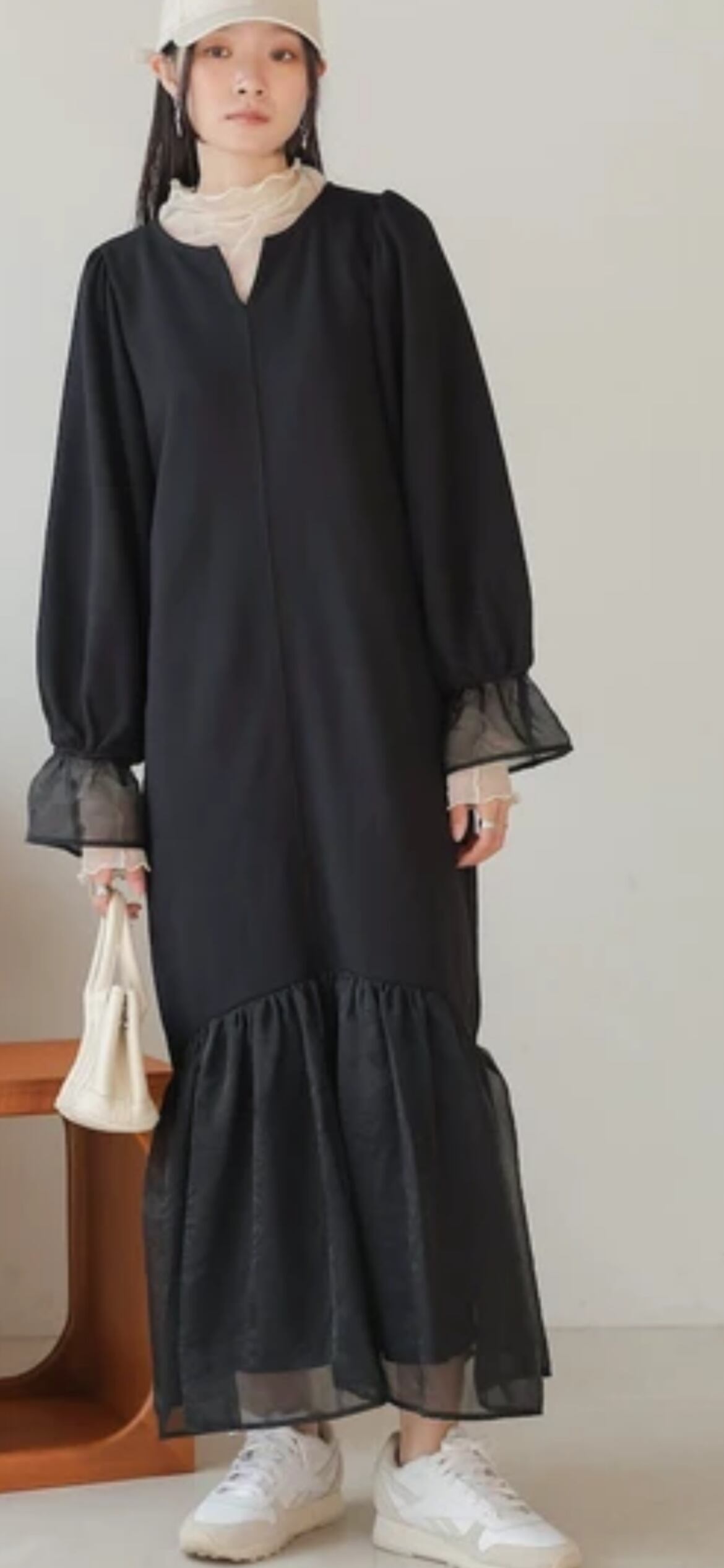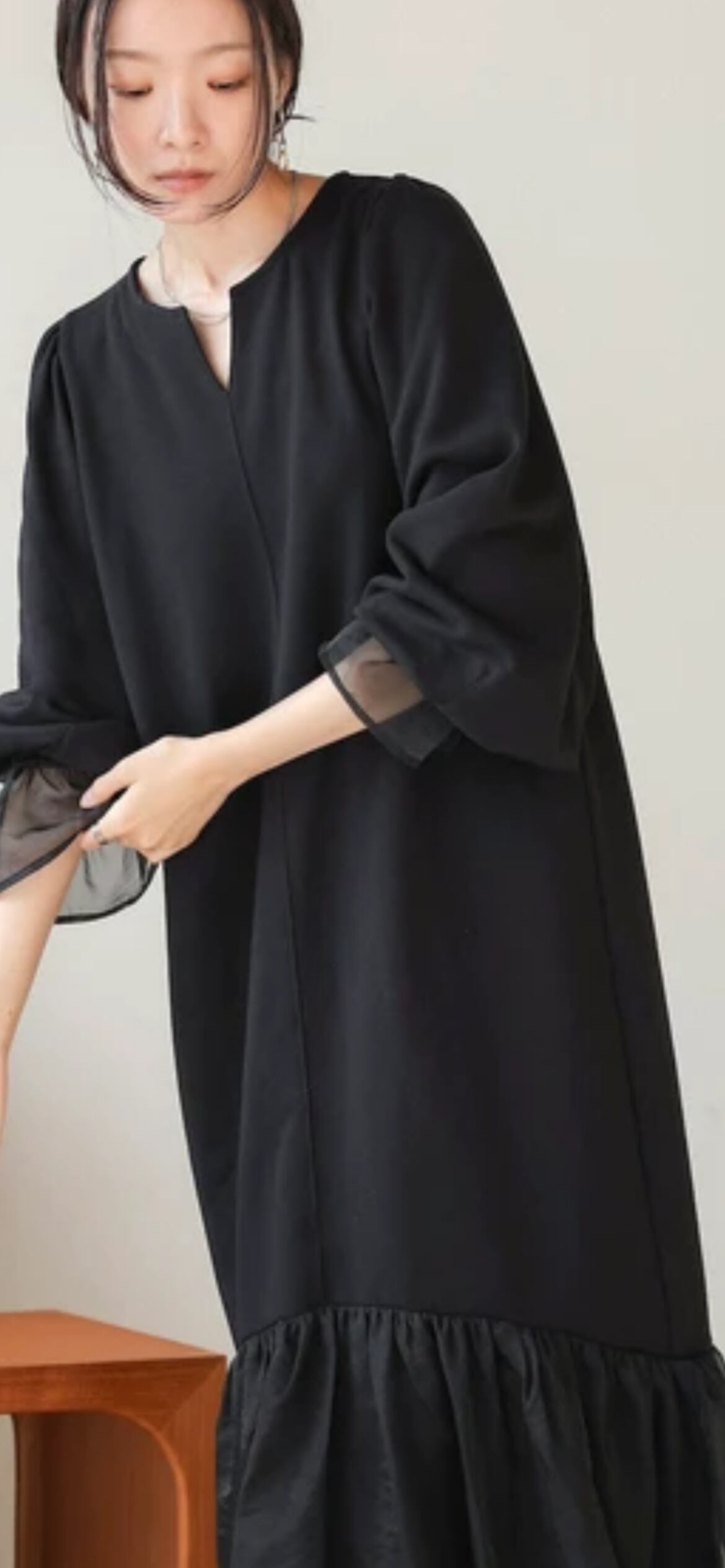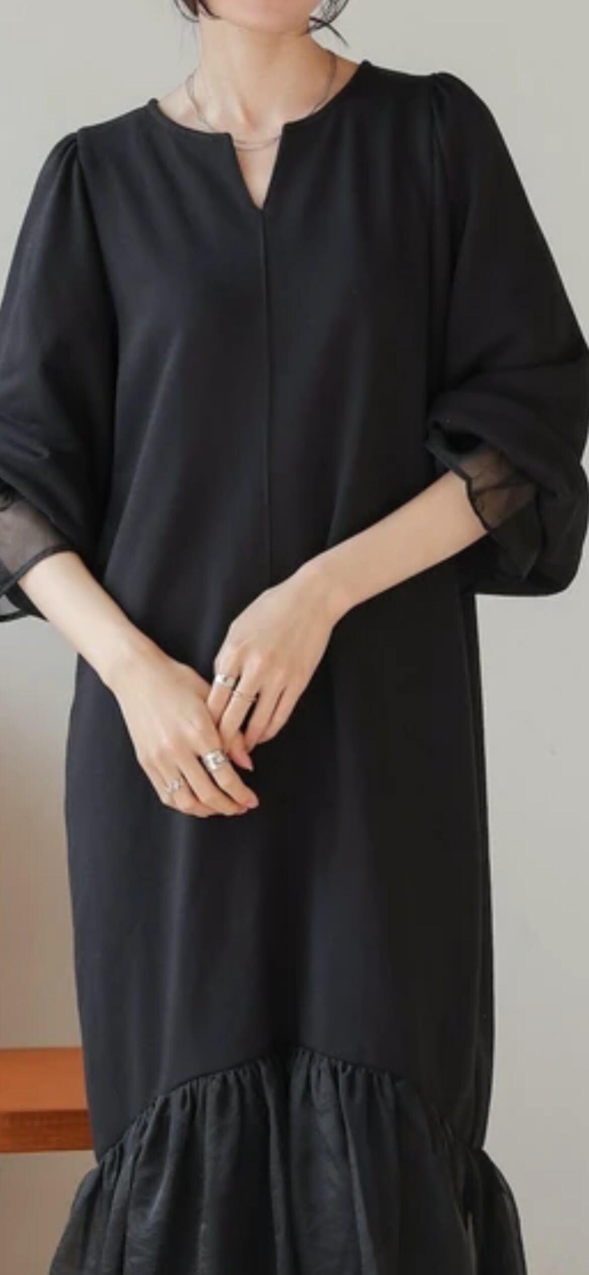 本体のワンピースは中肉で柔らかい質感のスウェット素材です。オーガンジーには光沢感があり、キレイめな雰囲気を作ってくれます。