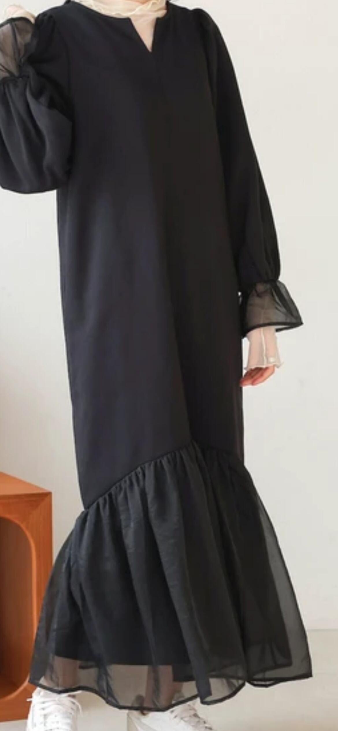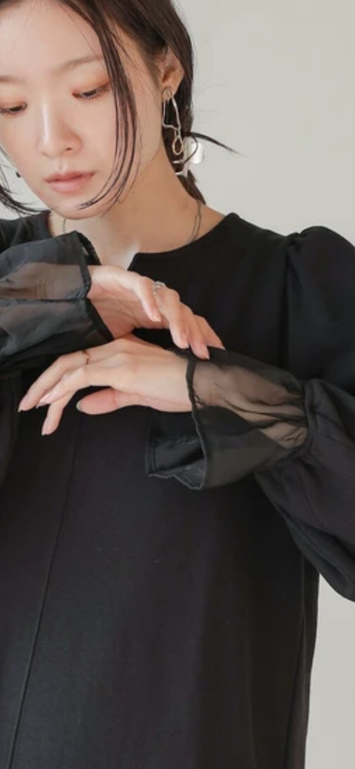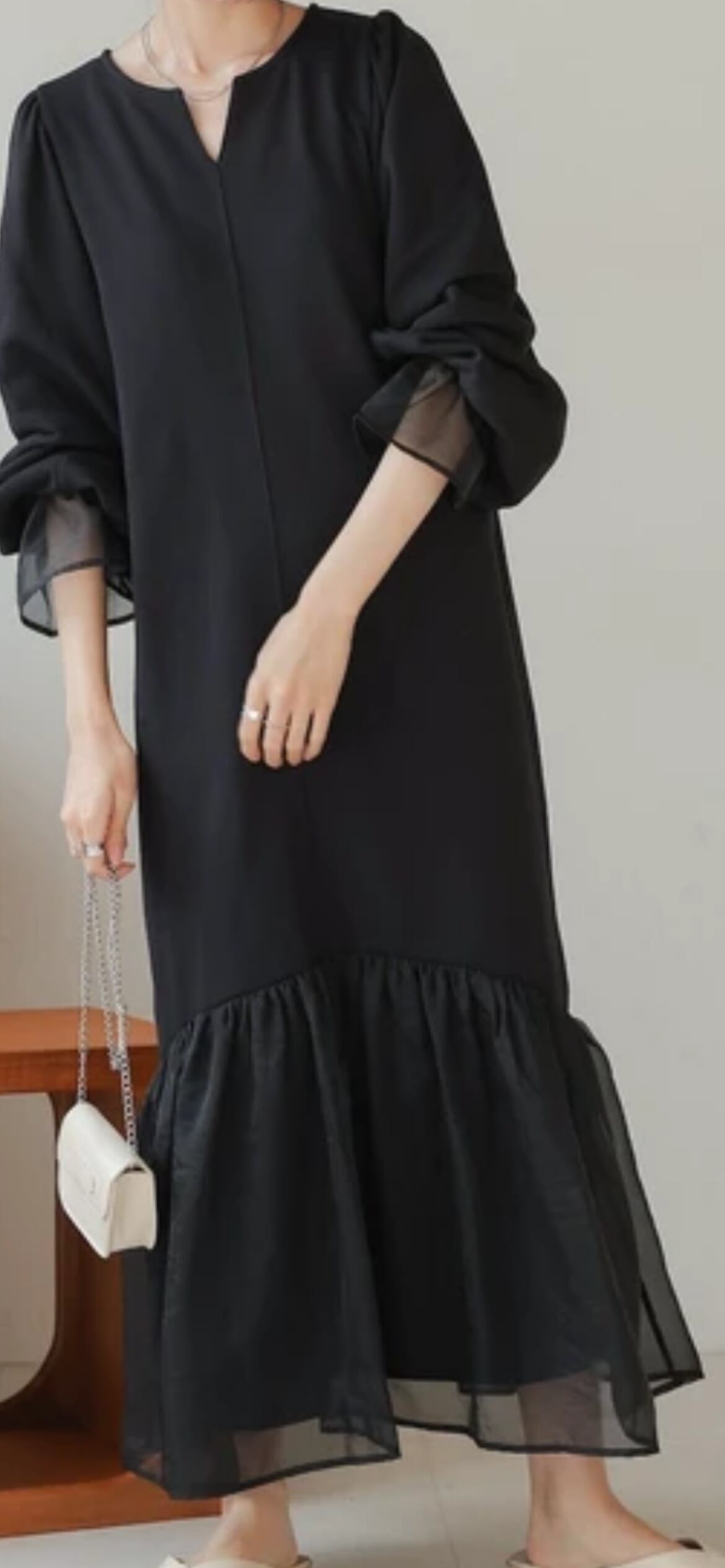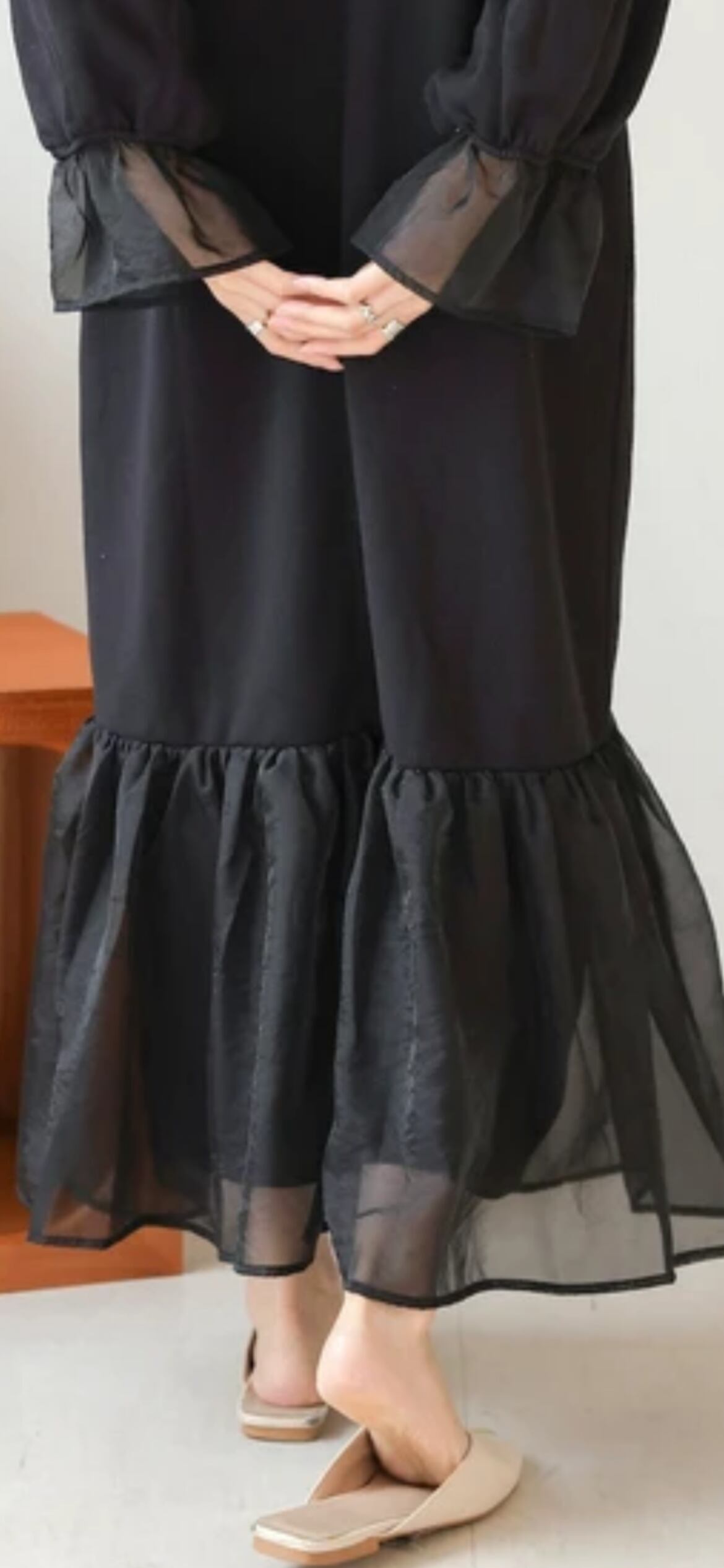 本体のワンピースは中肉で柔らかい質感のスウェット素材です。オーガンジーには光沢感があり、キレイめな雰囲気を作ってくれます。