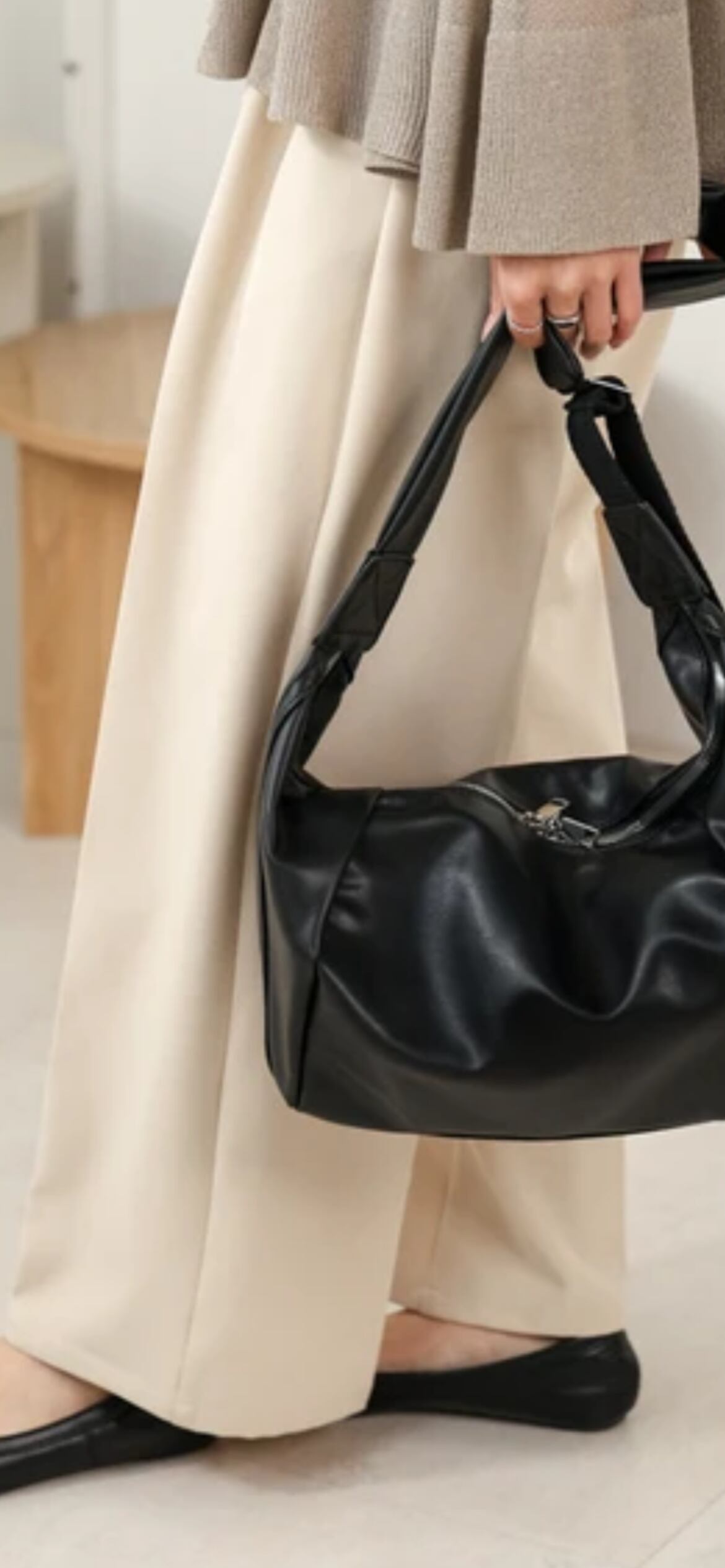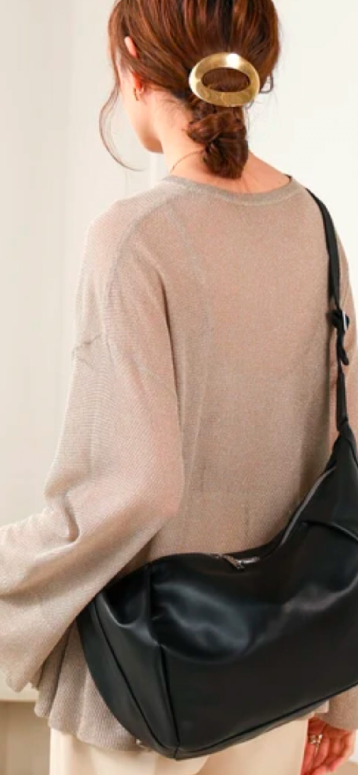 両面の大胆なタックとクロワッサンのようなコロンとしたシルエットが、トレンド感を引き出してくれるアイテムです。ショルダーバッグになっていて、コーディネートに合わせて長さ調整が可能です。見た目以上に大容量で、ハンカチ・スマートフォン・お財布・ポーチ・500mlのペットボトルも入れることができます。開け口はWジップで取り出しやすい仕様になっています。中にはファスナー付きのポケットが1つと、ファスナーが付いていないポケットが2つ付いているので、リップなどのすぐ取り出したい小物を入れるのに、便利なポイントです。